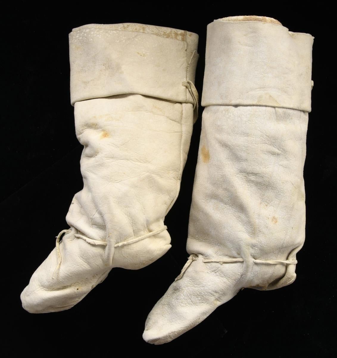 14" high, 9" foot, supple white leather, sinew-sewn. UNATTACHED ACCESSORIES: descriptive sheet. CONDITION: good to very good overall; one has a partially sinew-resewn seam on bottom next to a large dark stain. PROVENANCE: Martin Lane Historic & Western Americana Lifetime Collection. (02-22011/JS). $100-200.