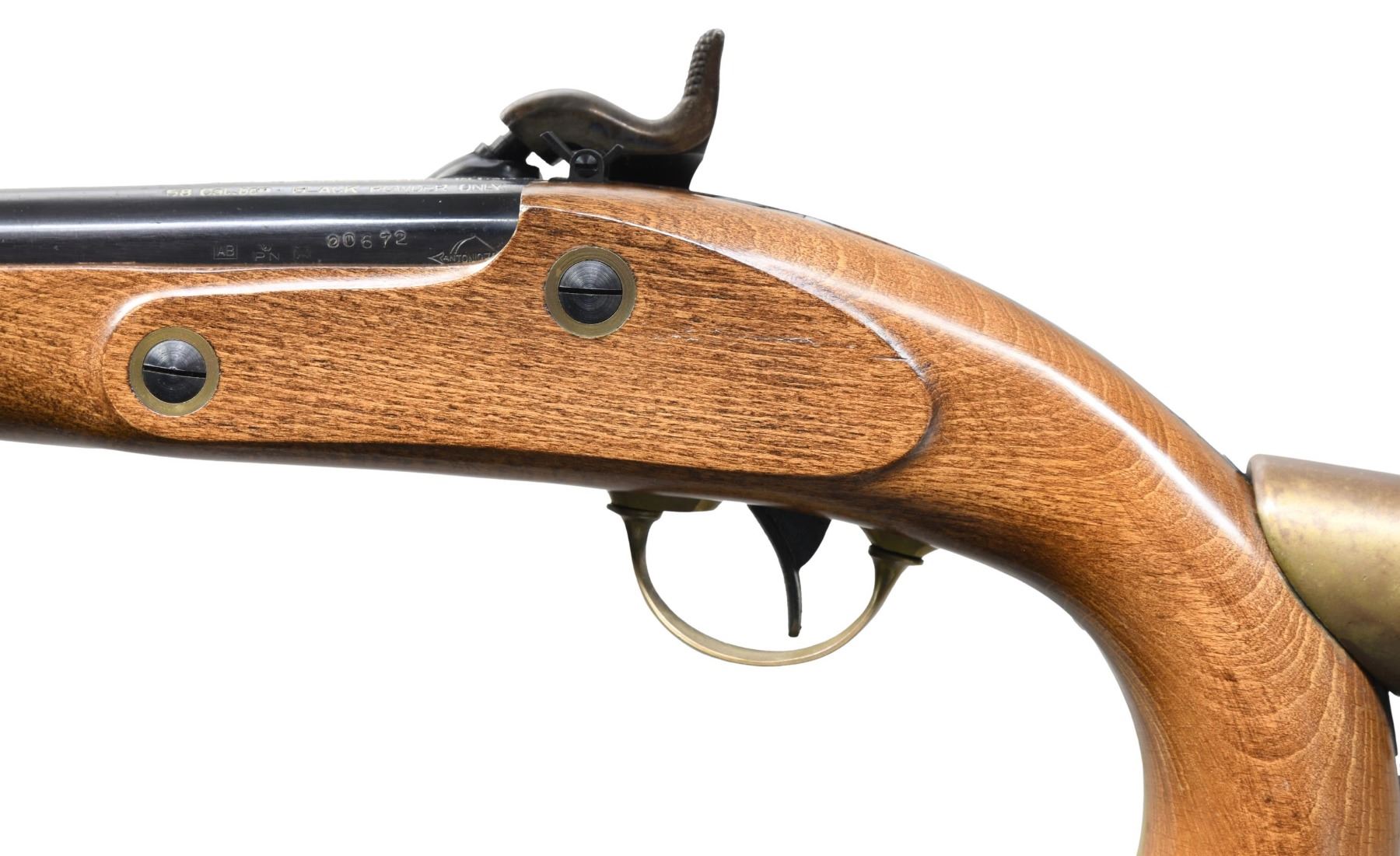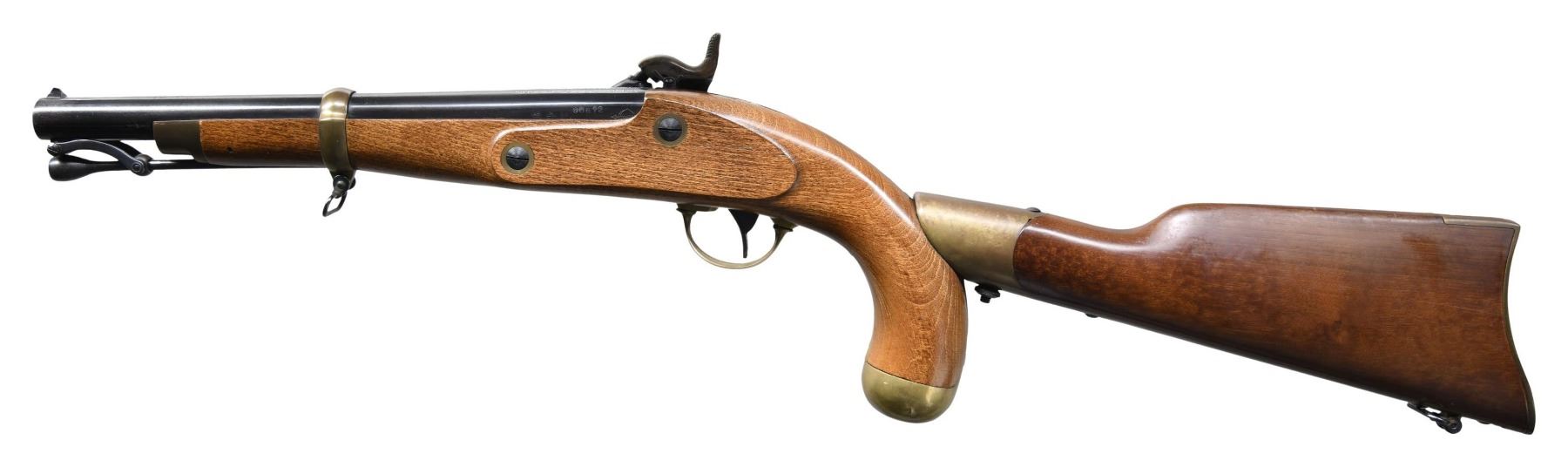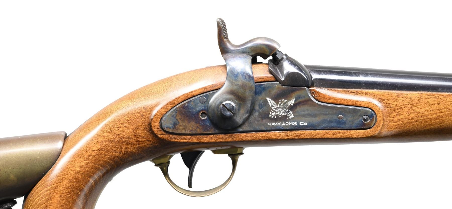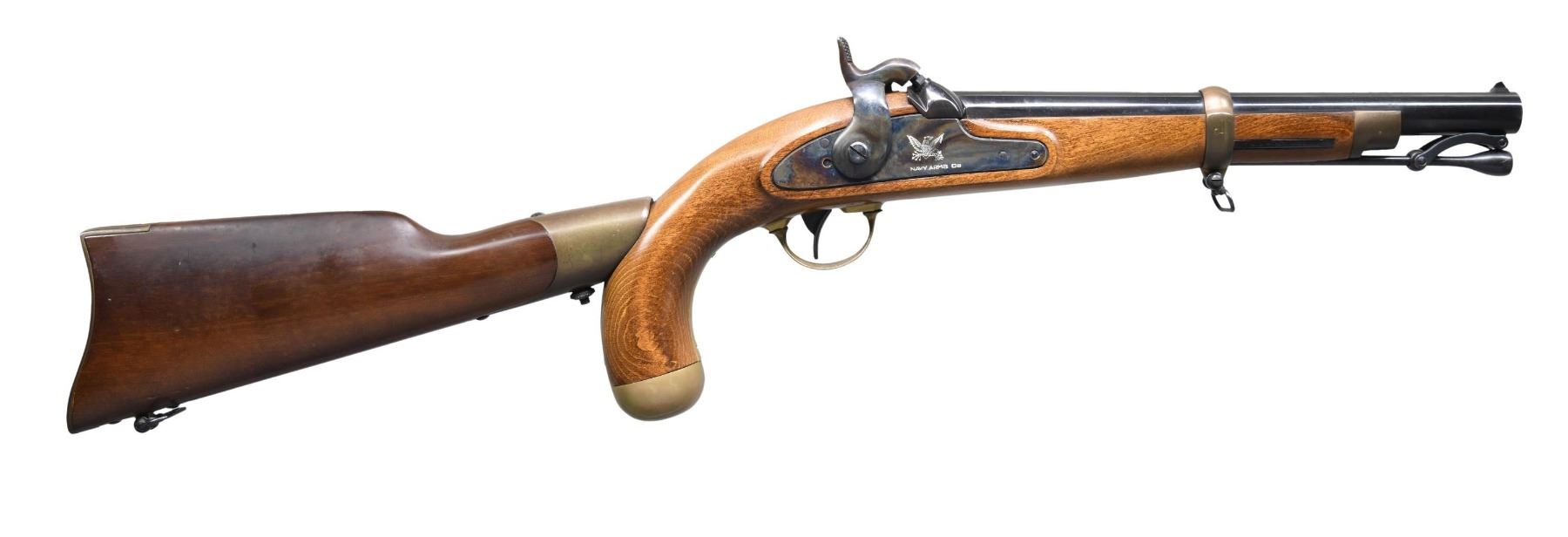Cal. 58. S# 00672. Bbl. 12". Blade front sight. Flip up rear sight. Antonio Zoli repro US 1855 percussion pistol imported by Navy Arms. Case colored lock assembly with US eagle over Navy Arms marking. Blued bbl. & ramrod. Brass furniture. Hardwood stock. Detachable shoulder stock with bottom mounted sling swivel. CONDITION: hardwood parts show some dirt staining & scattered light handling marks. Brass parts are turning to a dull yellow color with some tarnishing. Lock retains nearly all its case colors with some light oxidation specks. Blued parts retain 90% finish with scattered light oxidation & handling marks. Action functions properly when hand cycled. Bore has strong rifling with some light oxidation. (01-27214/MJC). ANTIQUE. $300-400.