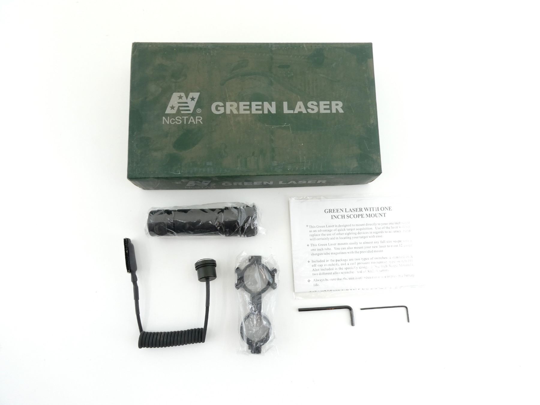 (1) GREEN LASER KIT, INCLUDES; LASER, PRESSURE PAD & 1" MOUNTING RING, FITS ALMOST ANY SCOPE WITH 1" TUBE DIAMETER, ITEM #: ASLG, UNTESTED, NEW OLD STOCK, SEALED IN ORIGINAL PACKAGING WITH INSTRUCTIONS. MAY REQUIRE FITTING. SEE PHOTOS.