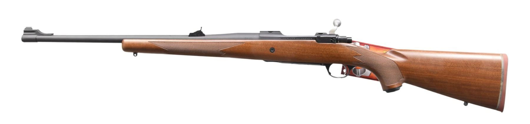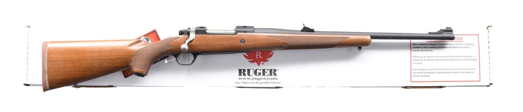 MAGNUM BOLT ACTION RIFLE WITH MATCHING FACTORY BOX. Cal. 300 RCM. S# 711-37772. Mfg. 2011 as Model 07192; Catalog No. HM77RCM . Matte black finish. Barrel 20". Gold bead front & Williams rear sights. Integral bases on receiver. Checkered walnut stock with Ruger grip cap & red pad. UNATTACHED ACCESSORIES: matching box with packaging including Ruger rings. CONDITION: near excellent overall; bore bright with strong rifling. (24-3531/MD). MODERN. $400-600.