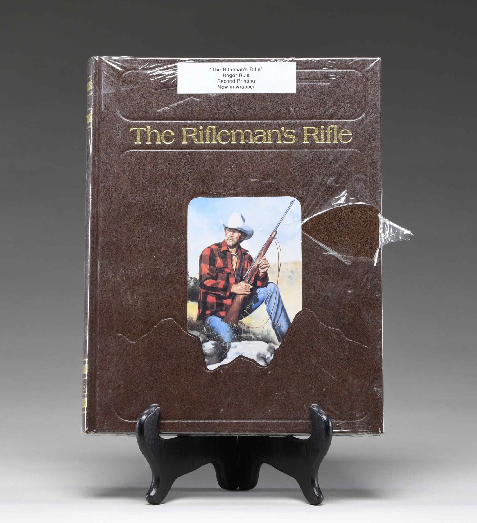 RIFLE", BY ROGER RULE. 2nd edition copy of "The Rifleman's Rifle", by Roger Rule. Brown leather cover with "The Rifleman's Rifle" in gold characters above a graphic of a hunter. Book remains sealed in its original plastic packaging. CONDITION: near new, as remaining in its plastic packaging. Plastic packaging shows a tear at the front, with some separation present at the rear. PROVENANCE: From the Estate of Jon Thomas, Gunsport, LTD. (02-24067/MLW). $50-100.