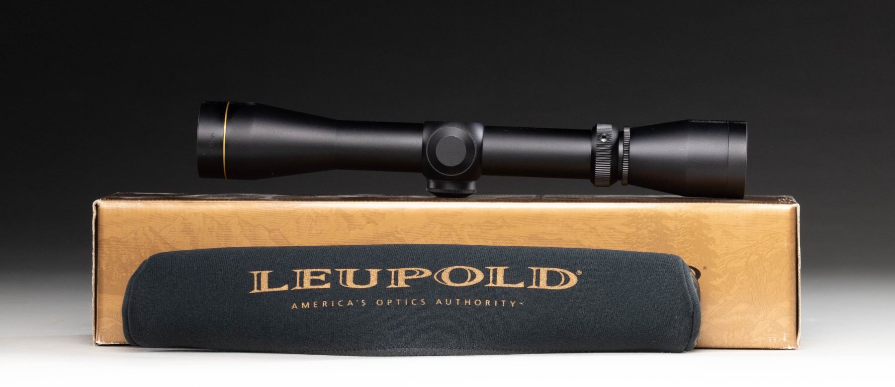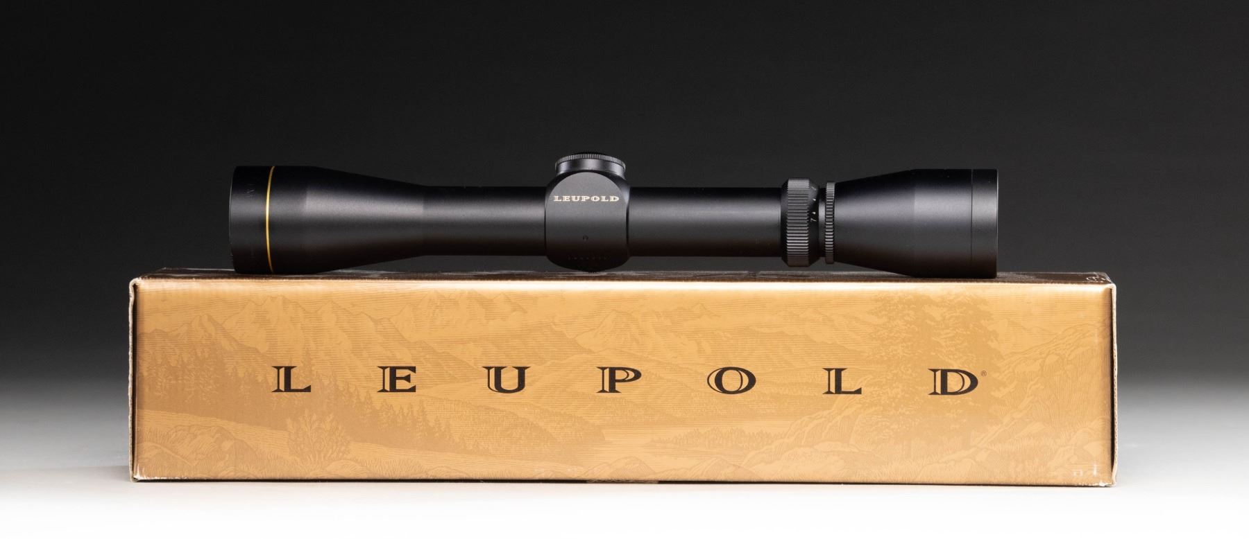 MATCHING FACTORY BOX. VX-1 2-7x33mm (Item #: 56550) rifle scope mfg. by Leupold. Scope features a matte black finish with a Duplex reticle. UNATTACHED ACCESSORIES: matching factory box containing factory paperwork and a Leupold scope sleeve. CONDITION: near new, with few light superficial marks from handling and storage. Scope retains a clear and sharp optic. Box shows some light exterior wear from handling and storage, but otherwise remains sound. (02-25958/MLW). NON-GUN. $150-225.