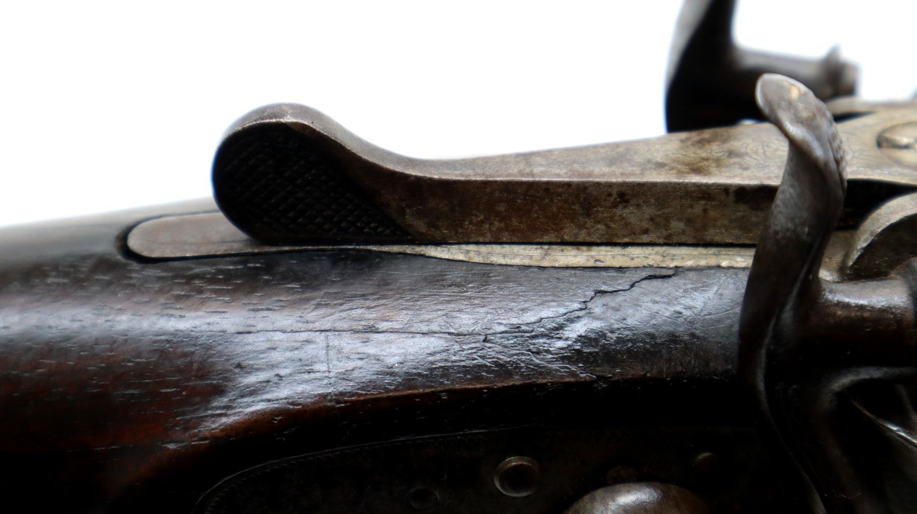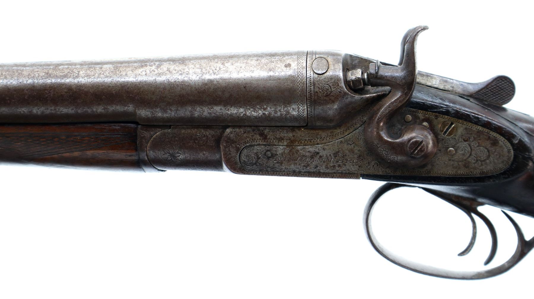 Main Description: Front bead is broken, laminated steel barrels with grooved rib that are loose on face, engraved receiver and side locks with checkered spur hammers that don’t function, triggers are bent, extractor. Two piece wood stocks, checkered forearm and pistol grip, chipped cracked and broken behind receiver and locks, grooved black polymer butt plate, stock repaired at toe, vanity plate, grip cap.