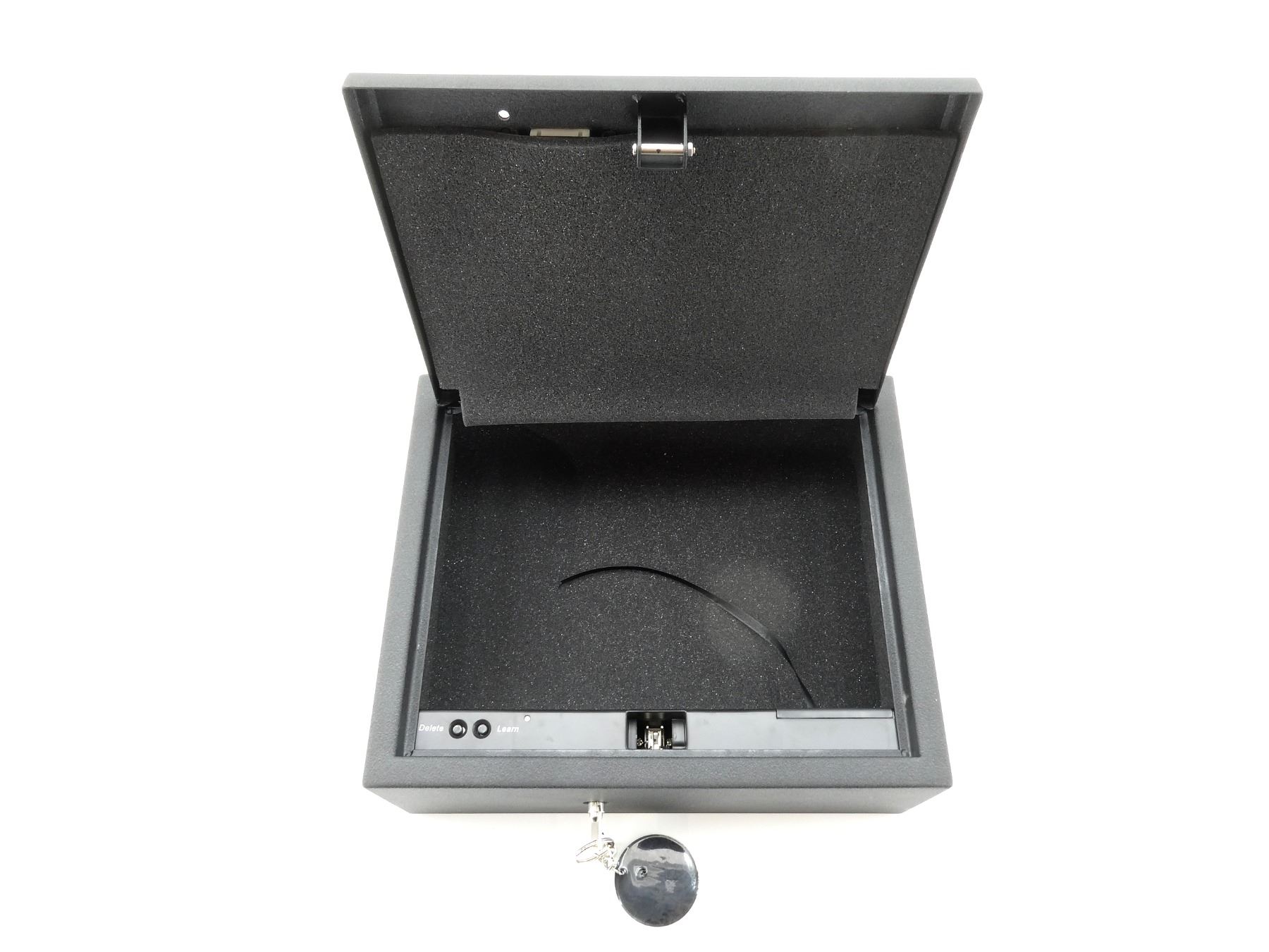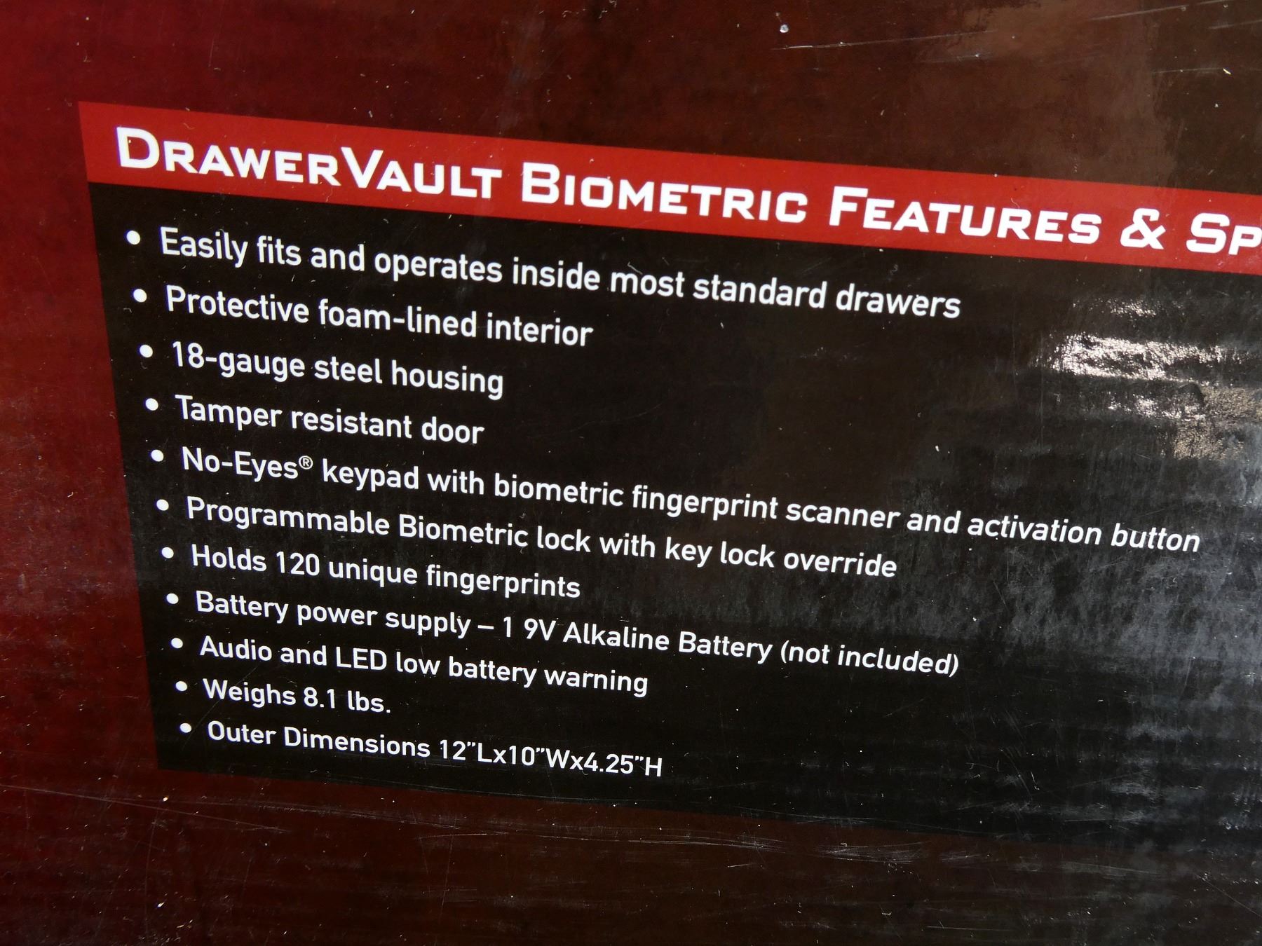 LOT INCLUDES; (1) BLACK BIOMETRIC DRAWER VAULT, FITS MOST STANDARD DRAWERS, FOAM-LINED, 18-GAUGE STEEL HOUSING, TAMPER RESISTANT DOOR, BIOMETRIC FINGERPRINT SCANNER AND ACTIVATION BUTTON, PROGRAMMABLE BIOMETRIC LOCK WITH KEY LOCK OVERRIDE, WEIGHTS APPROX. 8 .1 LBS, APPROX OVERALL LENGTH 12"X10"X4 1/4", NEW OLD STOCK, SEE PHOTOS.