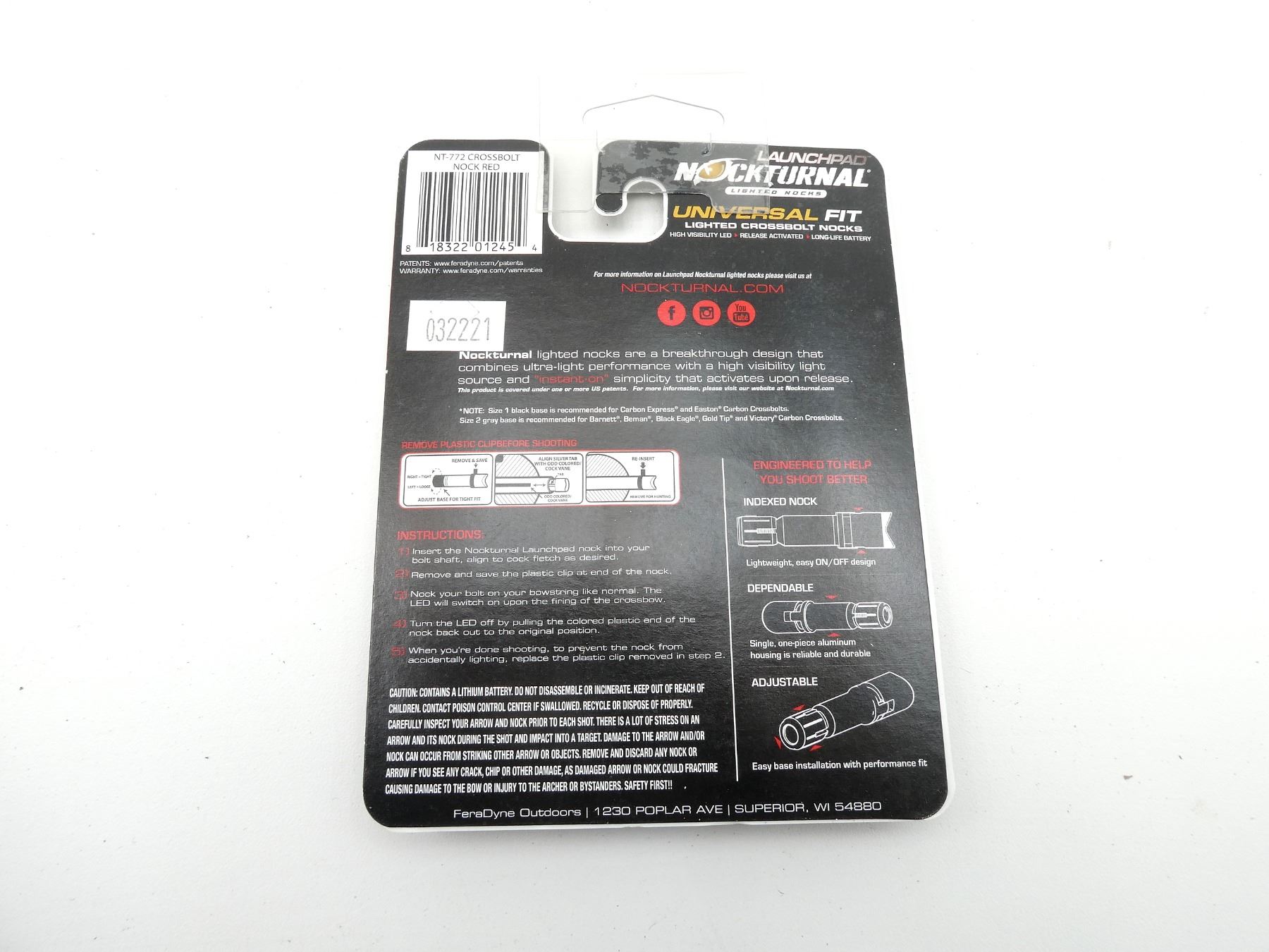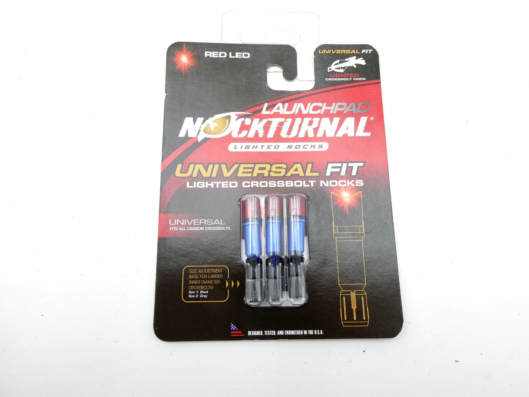 LOT INCLUDES; (3) LAUNCHPAD NOCKTURNAL UNIVERSAL FIT LIGHTED CROSSBOLT NOCKS, FITS ALL CARBON CROSSBOLTS, NEW OLD STOCK, IN ORIGINAL SEALED PACKAGING, SEE PHOTOS.