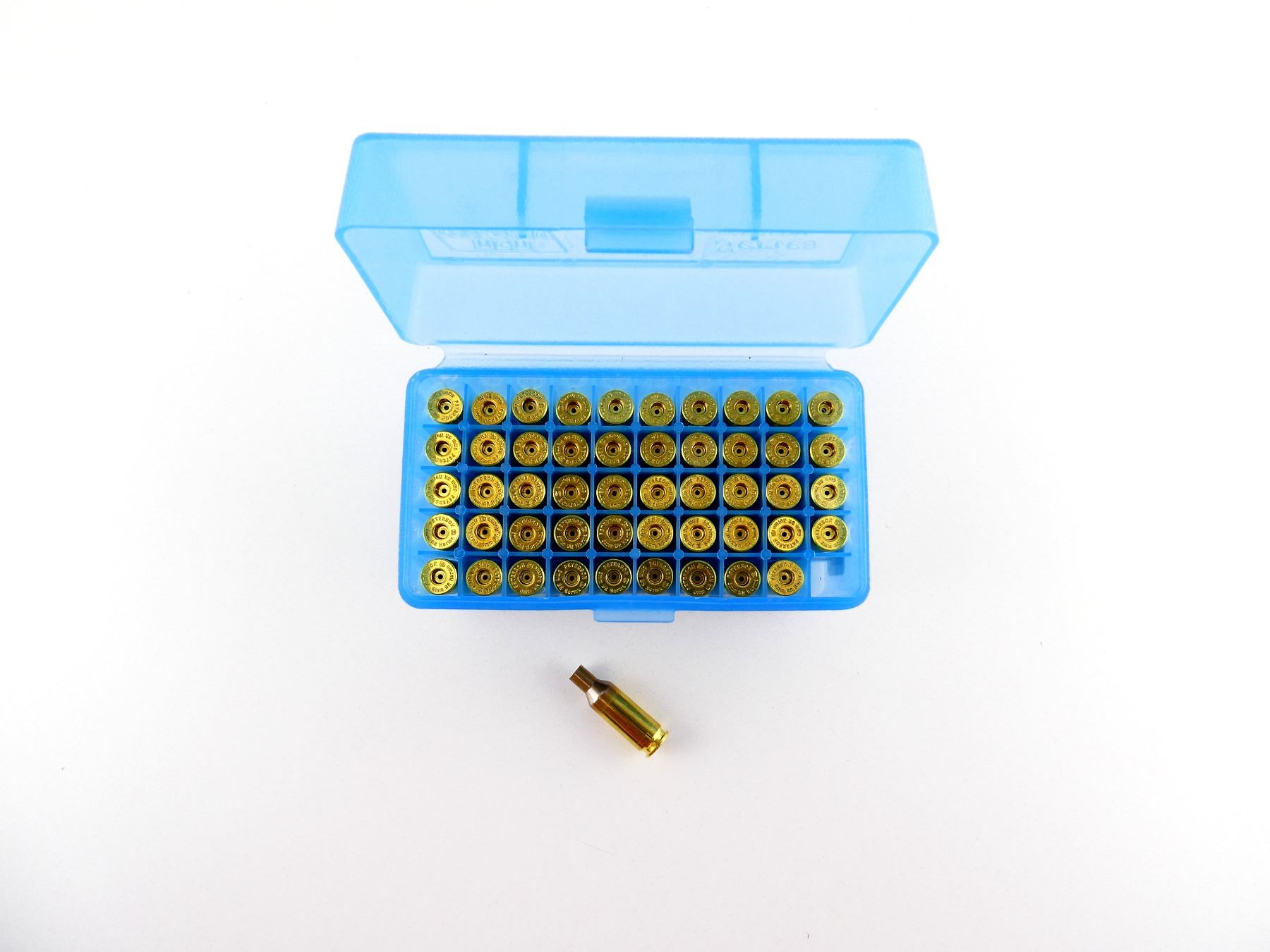 LOT INCLUDES; APPROX. (50) NEW NON-PRIMED BRASS CASES, (1) MTM CASE-GARD R-50 PLASTIC AMMO BOX.