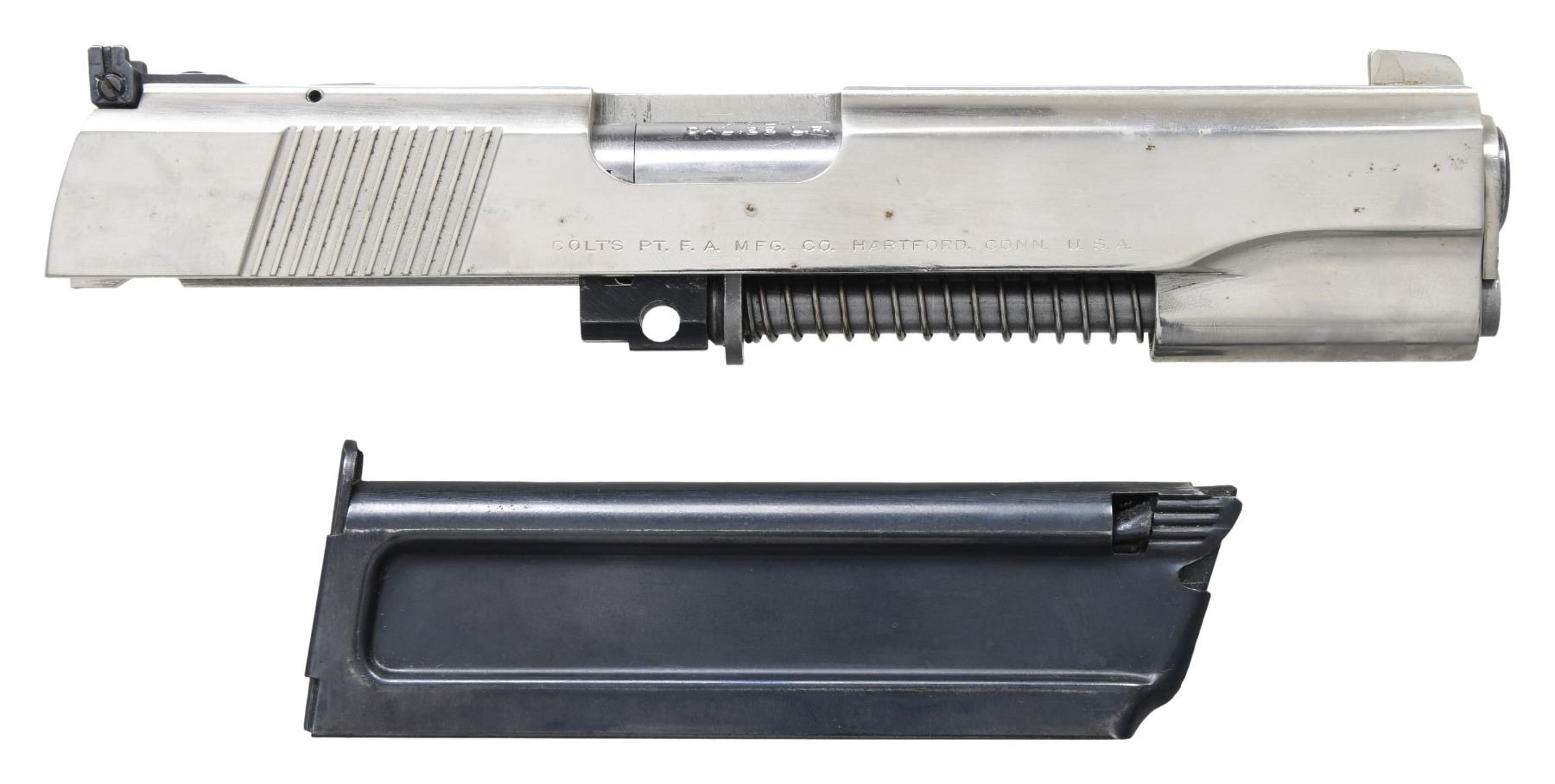 Post-war Colt 1911 22 LR conversion kit. Conversion kit includes nickel slide with blued Accro adjustable rear sight, nickel front sight, guide rod, bbl., nickel bushing, recoil spring assembly, blued 10 rd. mag & factory box. CONDITION: slide & bbl. retain 95% nickel with scattered light oxidation & edge wear. Very good bore with strong rifling. (02-24311/MJC). $200-400.