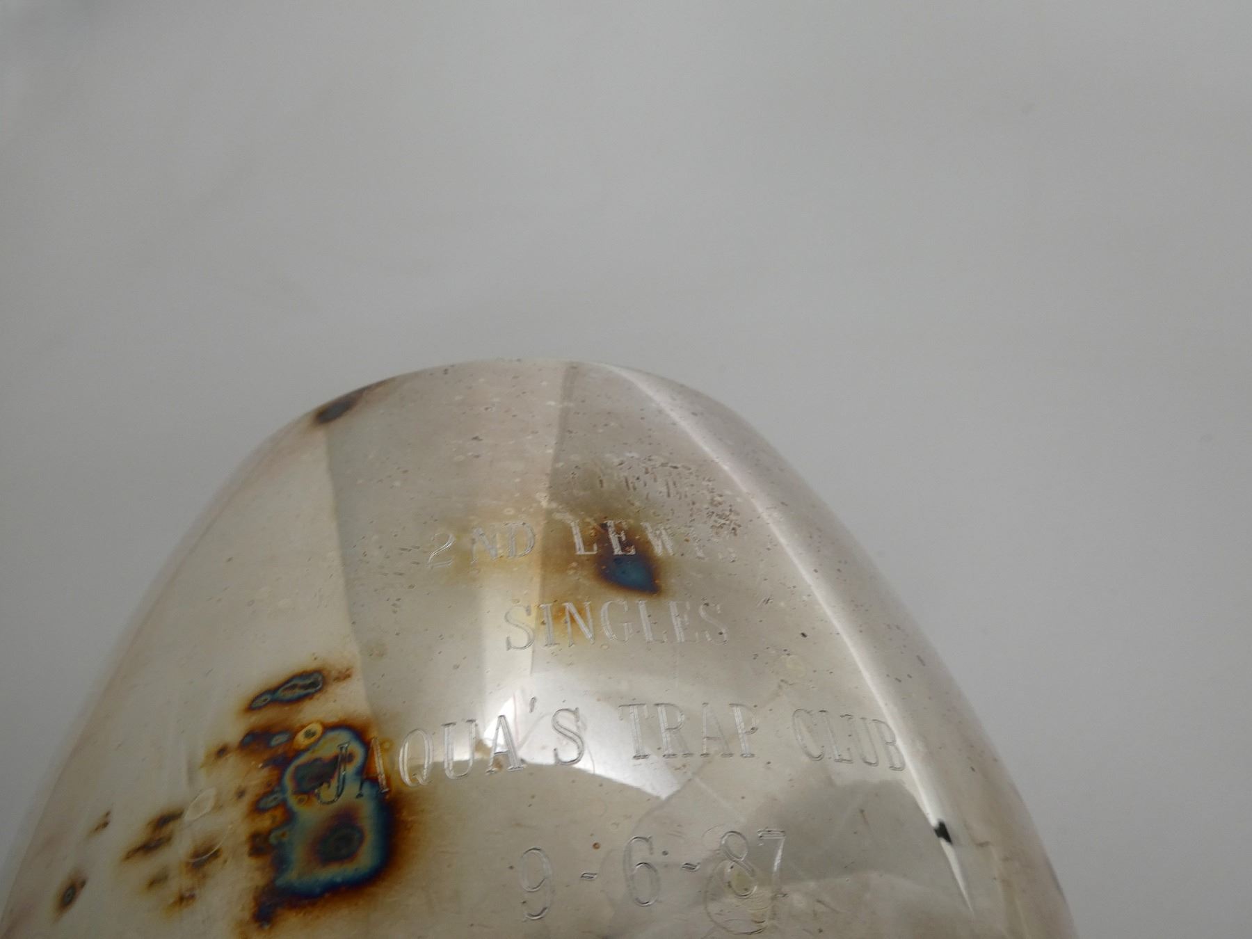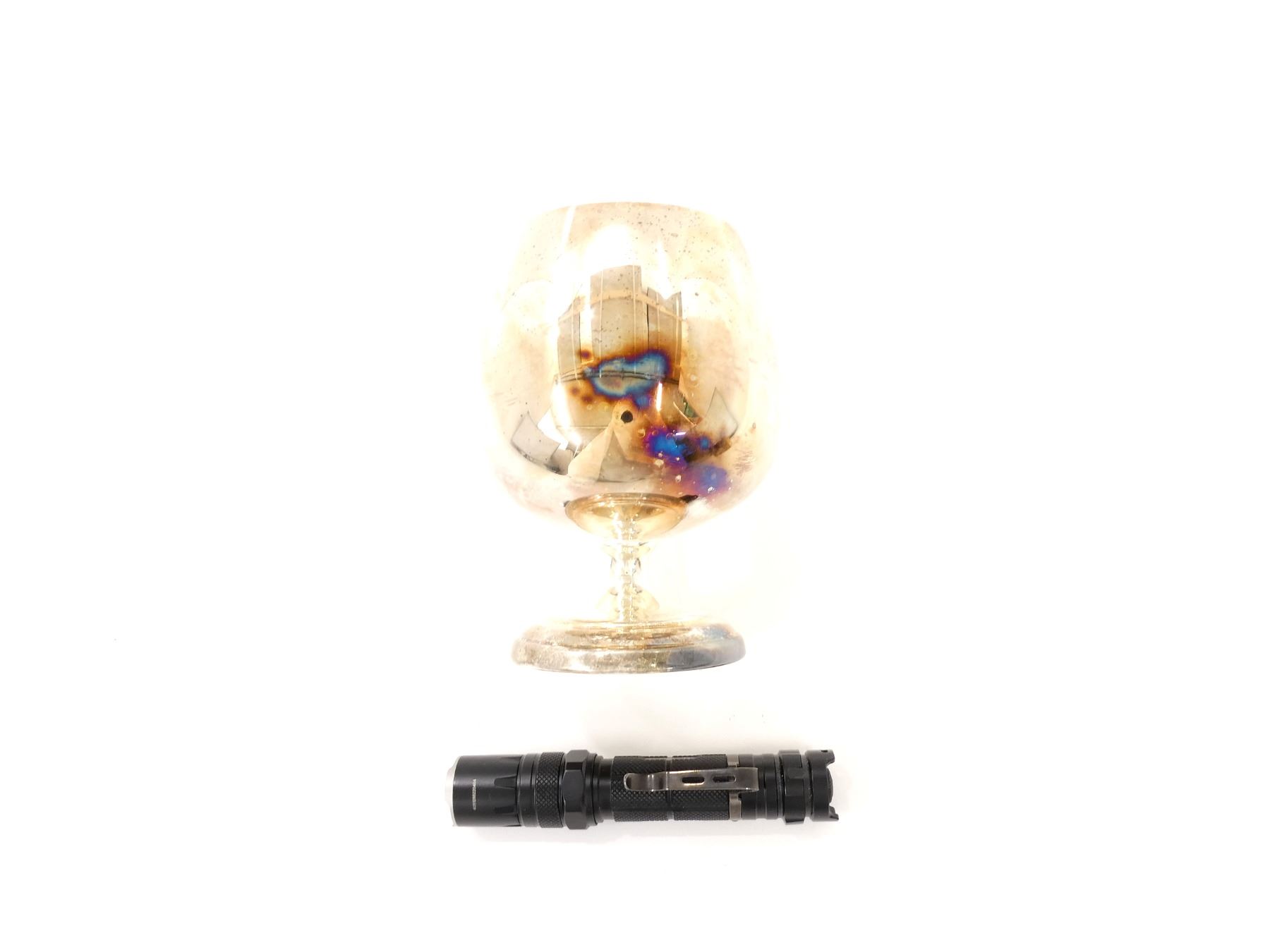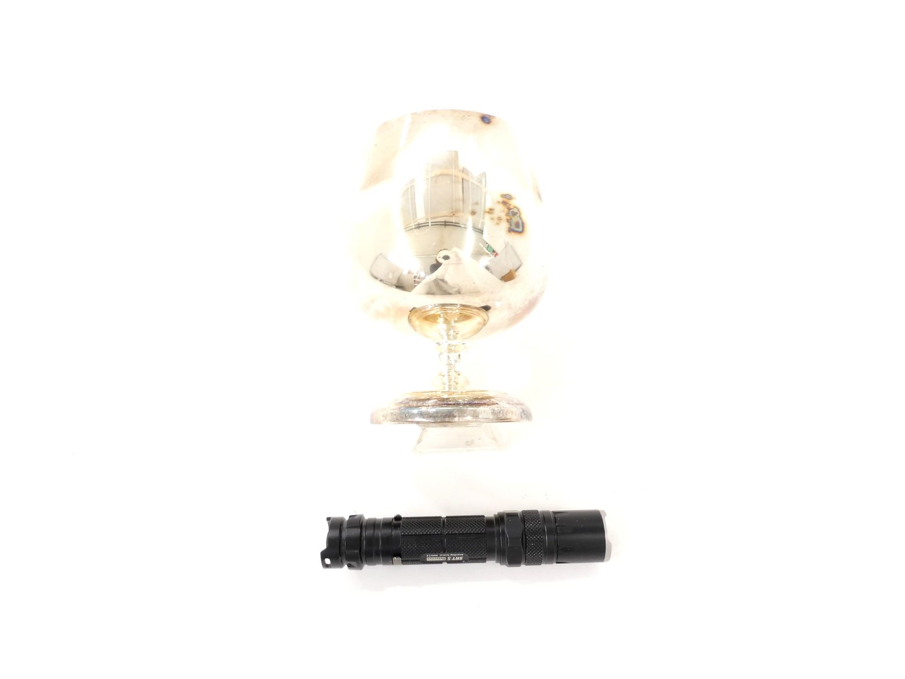 LOT INCLUDES; (1) NITECORE SRT 5 DETECTIVE SMARTRING TACTICAL FLASHLIGHT, 7 SETTINGS INCLUDING STROBE AND RED / BLUE LASER SIGHTS ETC., WORKING CONDITION & (1) 2ND LEWIS SINGLES JAQUA'S TRAP CLUB CHALICE, DATED 9-6-87, POSSIBLY PLATED BRASS CONSTRUCTION, SHOWS WEAR & TEAR. SEE PHOTOS.