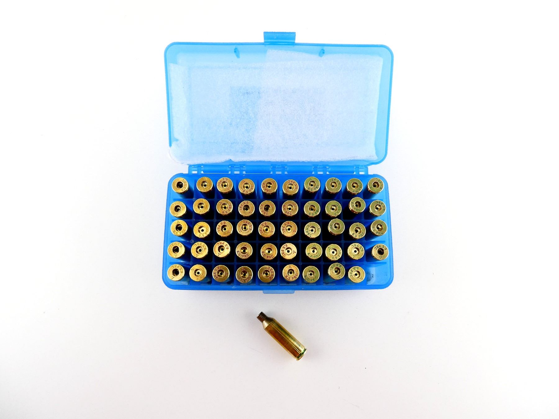 LOT INCLUDES; APPROX. (50) NON-PRIMED BRASS CASES, (1) MTM CASE-GARD 50 PLASTIC AMMO BOX.