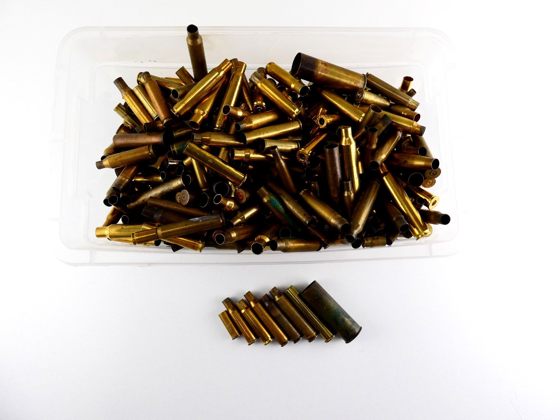 LOT INCLUDES; APPROX. 10.4 LBS NON-PRIMED CASES, VARIOUS CALIBERS INCLUDING; .38 SPL, .30-30 WIN, .308 WIN, .270 WIN, .308 NORMA MAG, ETC.