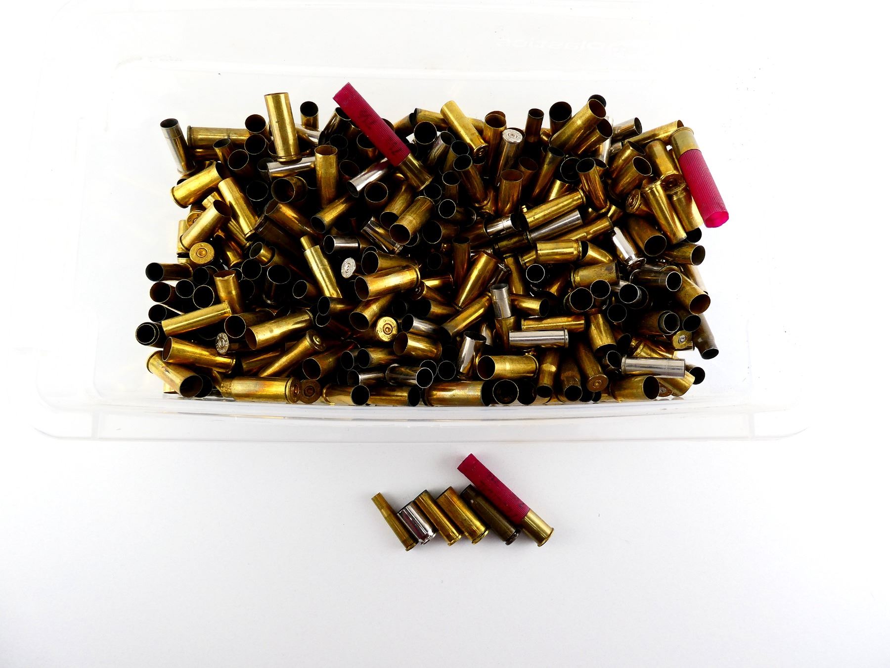 LOT INCLUDES; APPROX. 7 LBS NON-PRIMED BRASS CASES, VARIOUS CALIBERS INCLUDING; .38 SPL, .45 AUTO.357 MAG, .45 COLT, ETC.