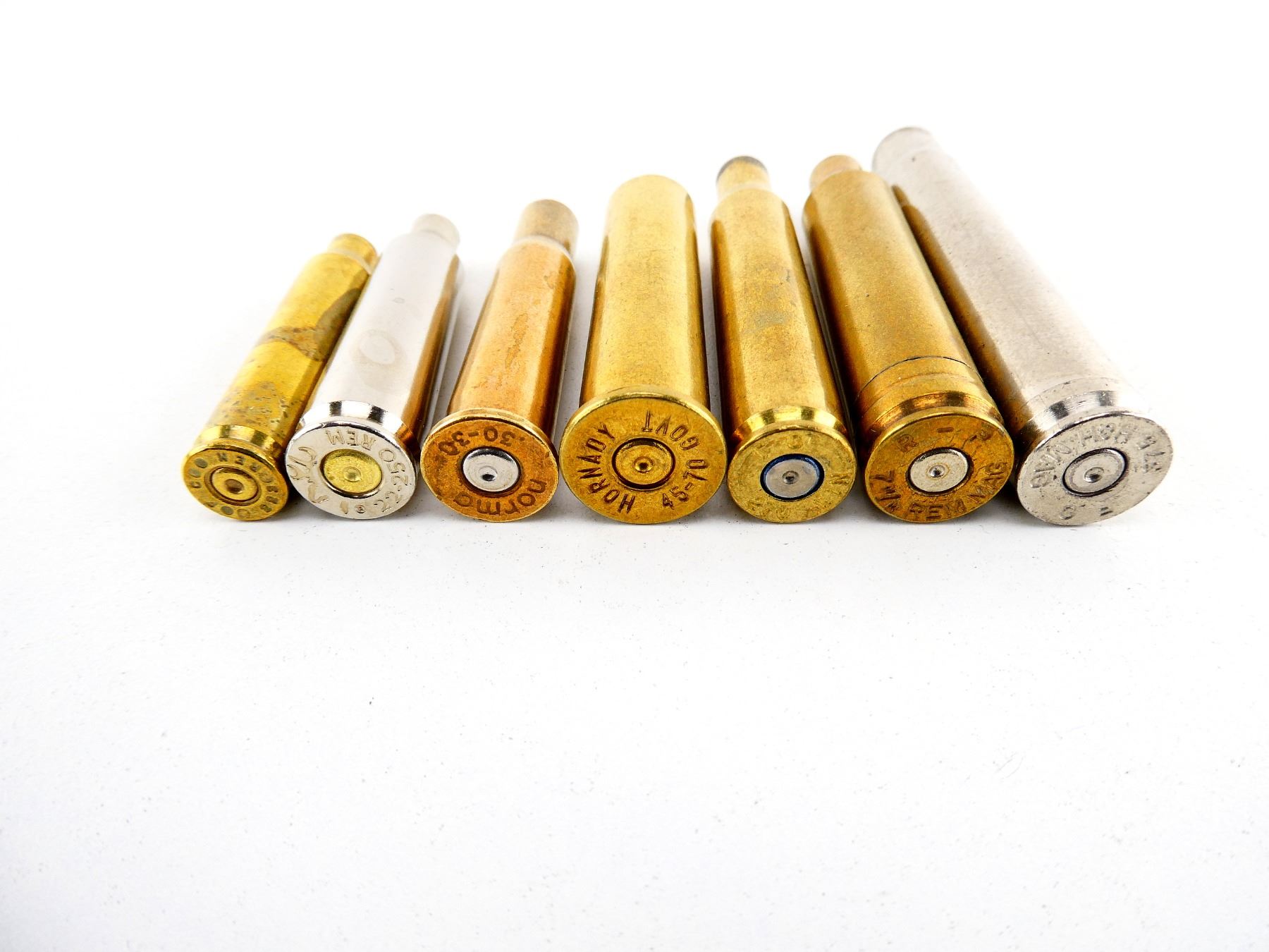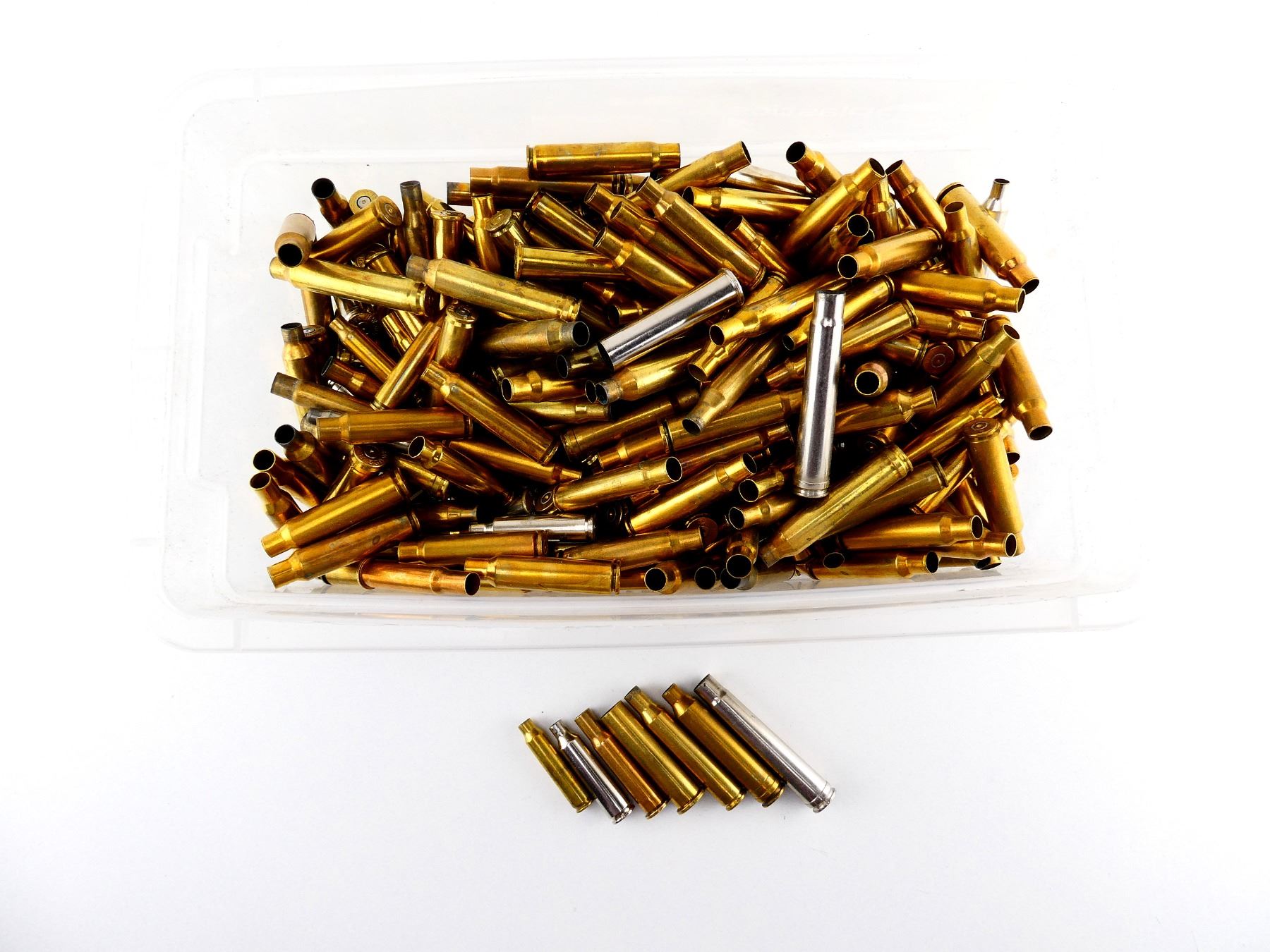 LOT INCLUDES; APPROX. 7.8 LBS NON-PRIMED CASES, VARIOUS CALIBERS INCLUDING; .223 REM, .22-250 REM, .30-30 WIN, .270 WIN, 7MM RAM MAG, .45-70 GOVT, ETC.