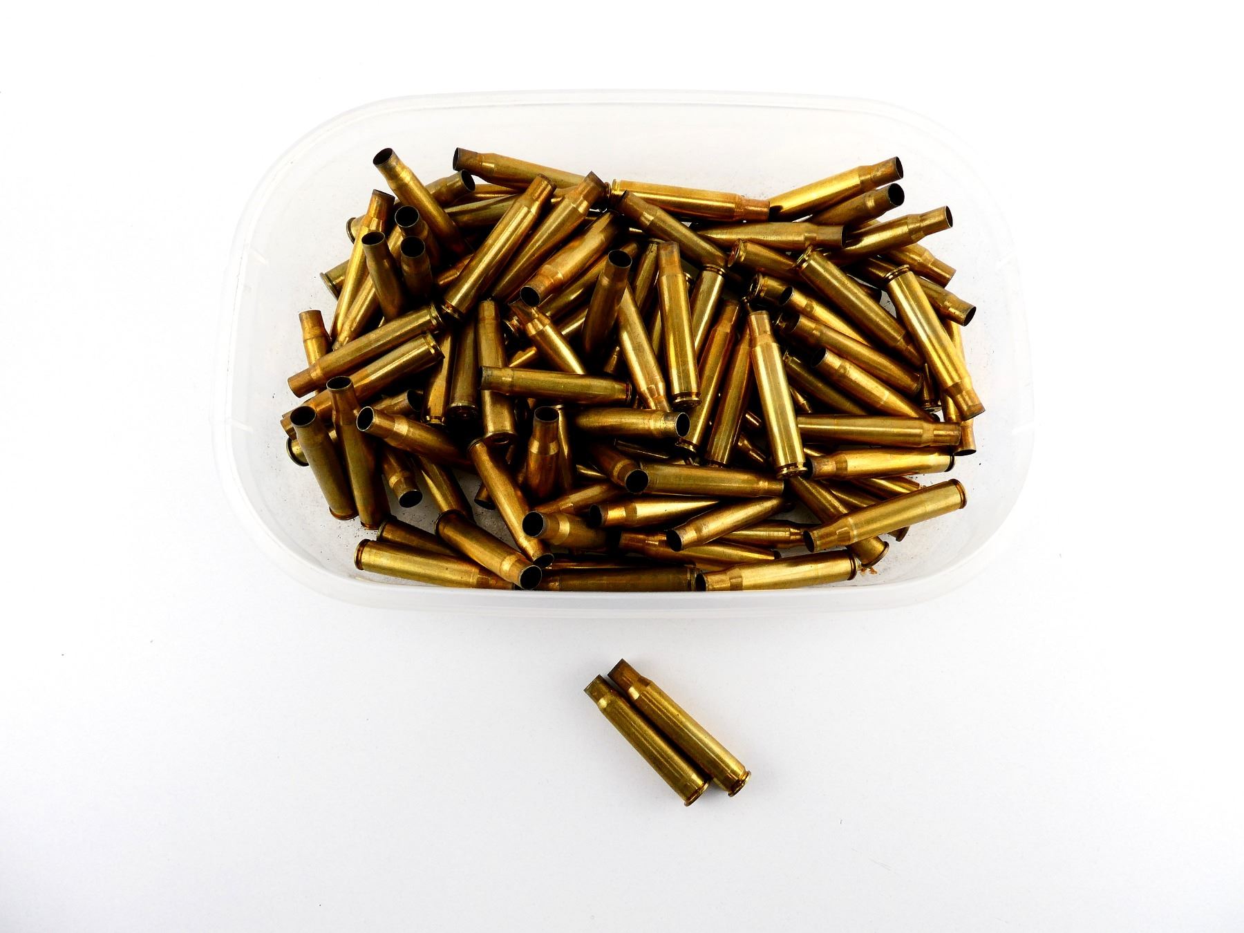 LOT INCLUDES; APPROX. 2.9 LBS NON-PRIMED BRASS CASES, VARIOUS CALIBERS INCLUDING; .303 BR, .30-06 SPRG, ETC.