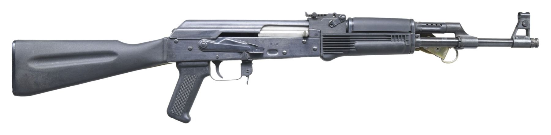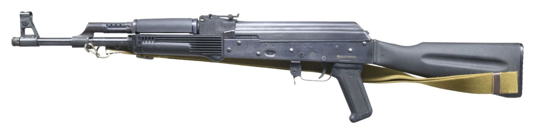 Cal. 7.62x39. S# 94104700. Bbl. 16". Post front sight with hood. Tangent rear sight graduated to 800yds. Matching numbers on receiver, top cover & bolt. Classic Chinese Type 56 style rifle. Left side of receiver has Norinco logo & crude Century import marking. Blued finish. Replacement US made AK74 style black synthetic furniture. Left side sling swivels with canvas sling. No cleaning rod hole present. MAGS: none present. CONDITION: furniture shows a few light handling marks. Metal retains 90% original blue with scattered light oxidation, handling marks & some edge wear. Action functions properly when hand cycled. Bright near excellent bore. (25-3919/MJC). MODERN. $400-600.