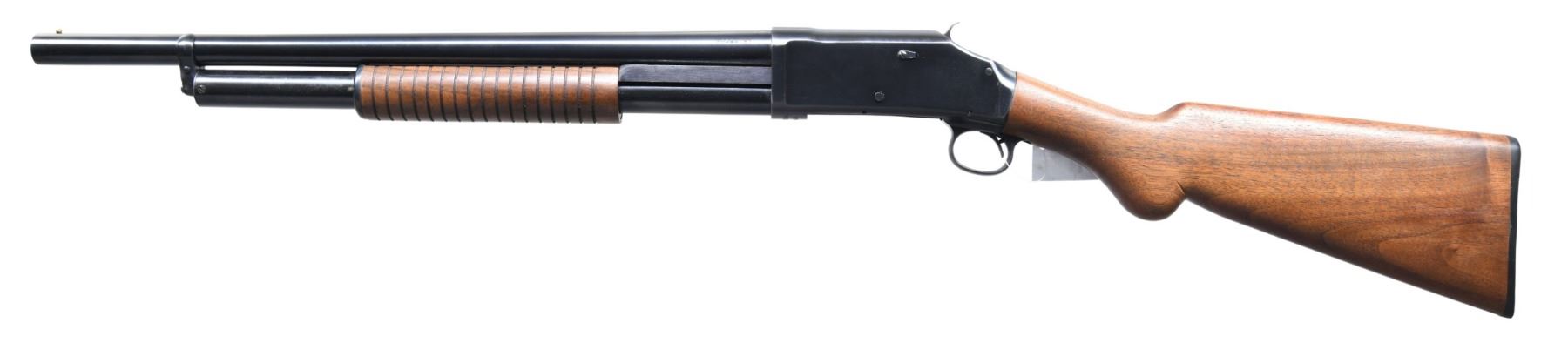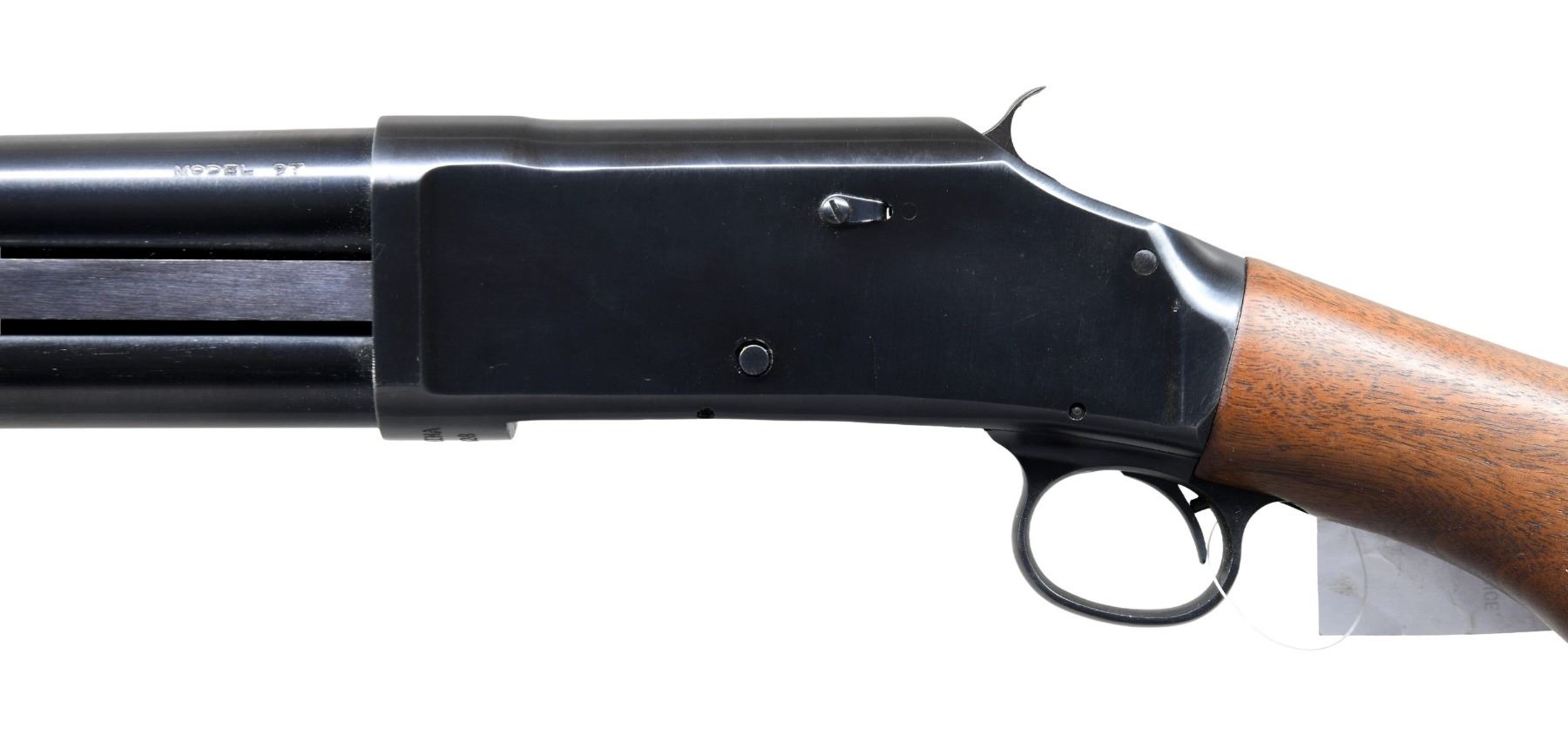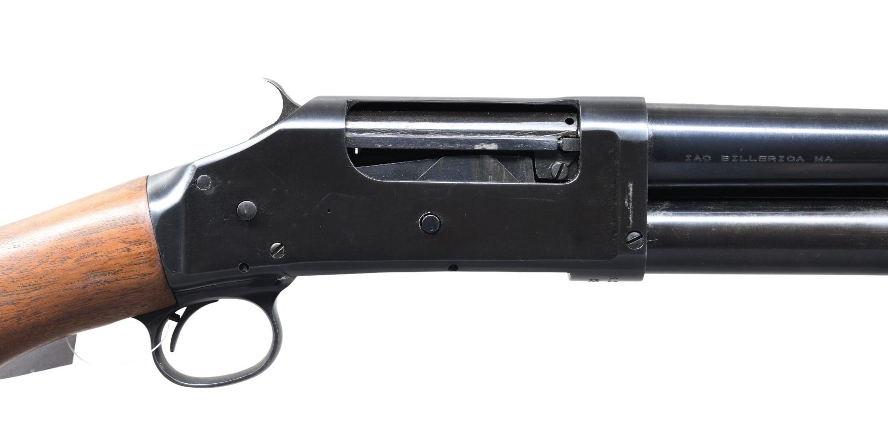Cal. 12 Ga. 2 3/4". S# CB01628. Bbl. 20 1/2". Brass bead front sight. Chinese made clone of a Winchester 97 riot gun. Right side of bbl. has IAC import marking., Blued finish. Walnut stock with grooved forend. UNATTACHED ACCESSORIES: matching numbered importer box with sleeve that shows a few tears & manual. CONDITION: all aspects near excellent with some operational wear on tube & a couple light handling marks. Near excellent bright bore. (25-3408/MJC). MODERN. $250-350.