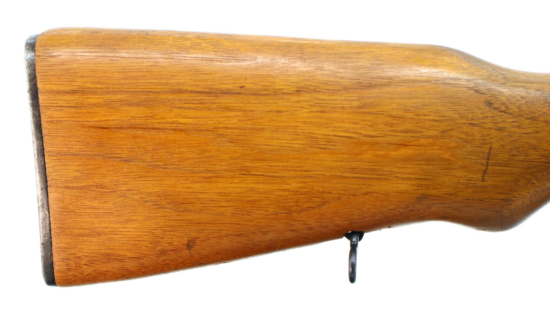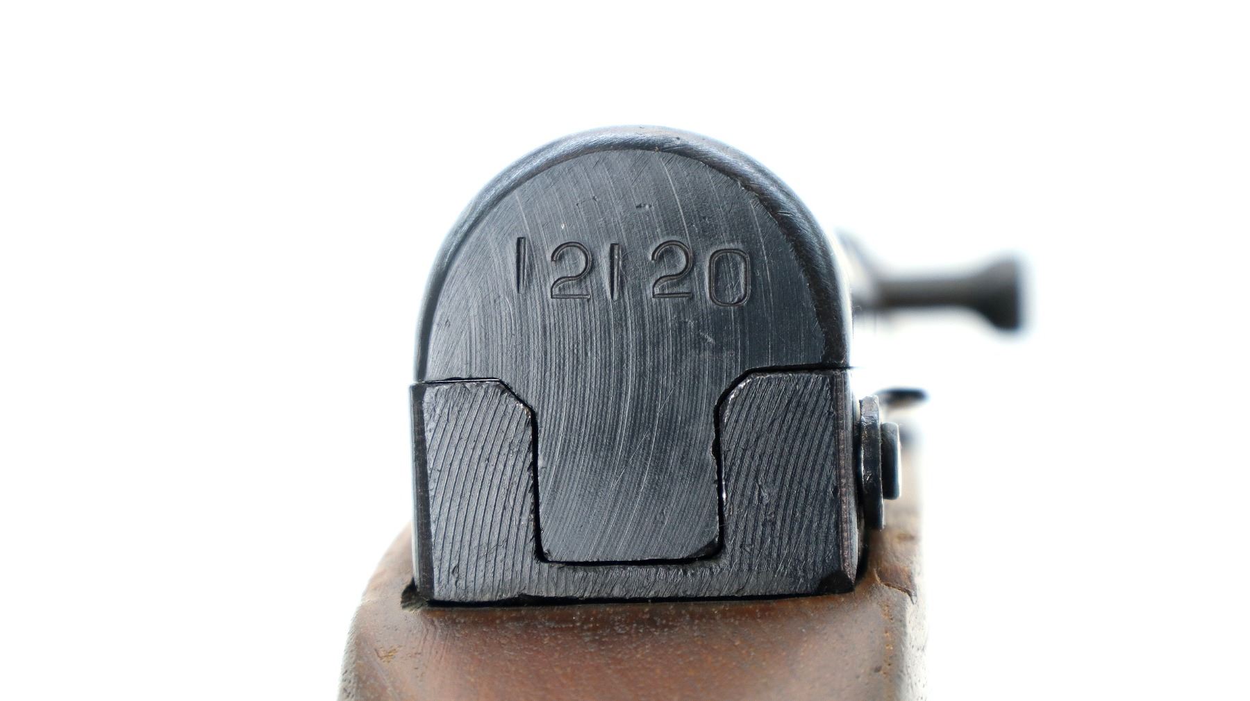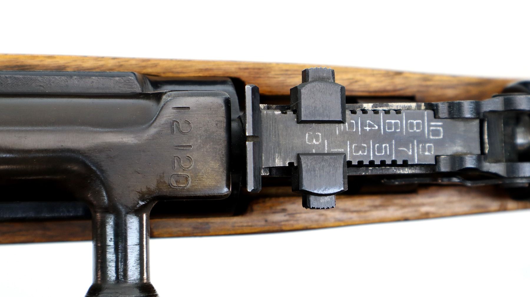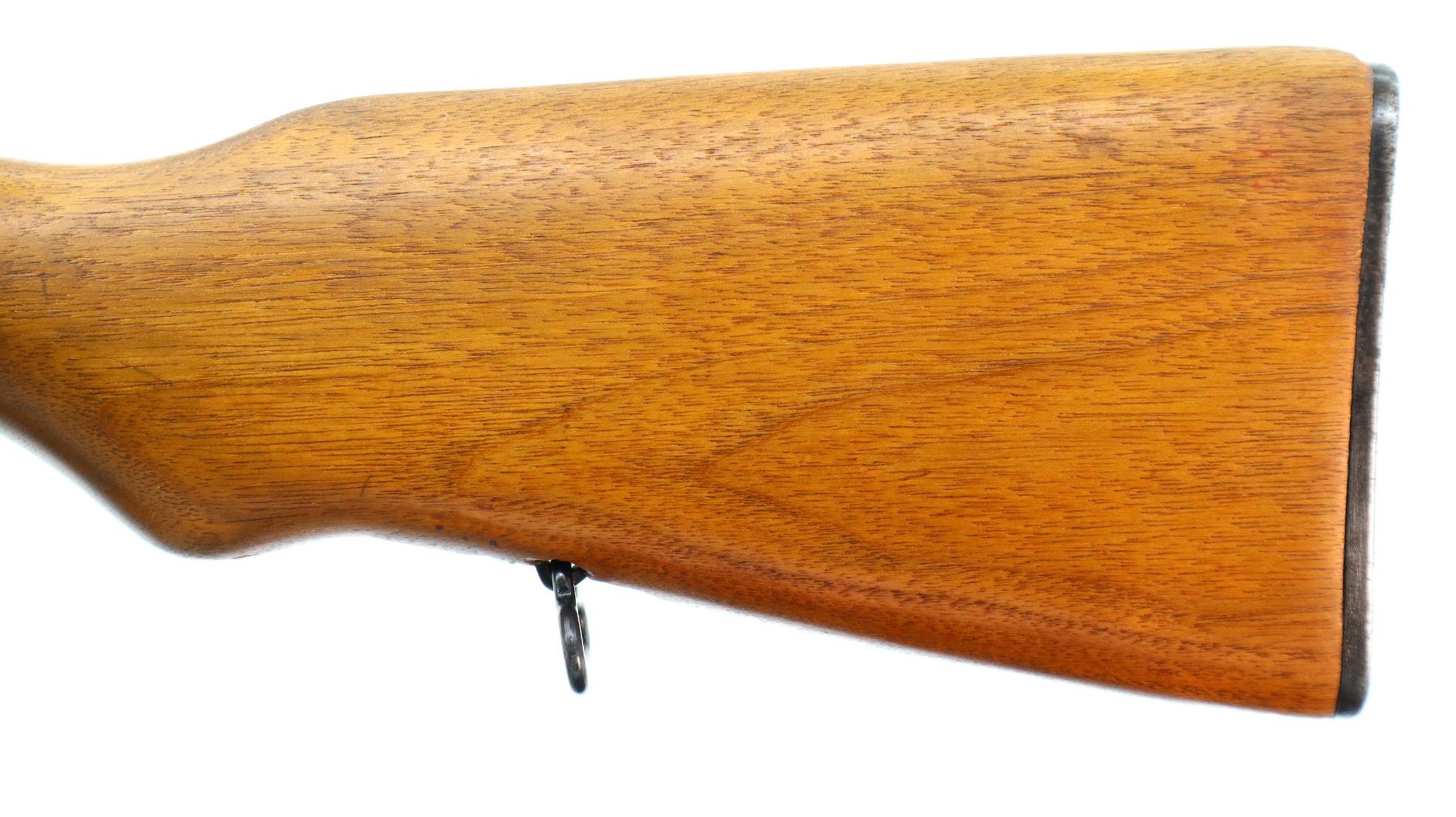 Main Description: Post front sight with hood and ramp, adjustable u notched rear sight, blued finish. Two piece wood stocks, ventilated handguard, finger grooved forearm, pistol grip, smooth steel butt plate with trap, sling swivels, missing cleaning rod and folding bayonet.