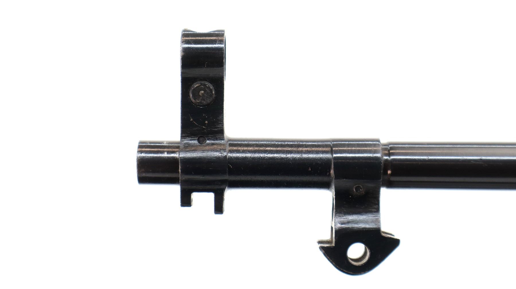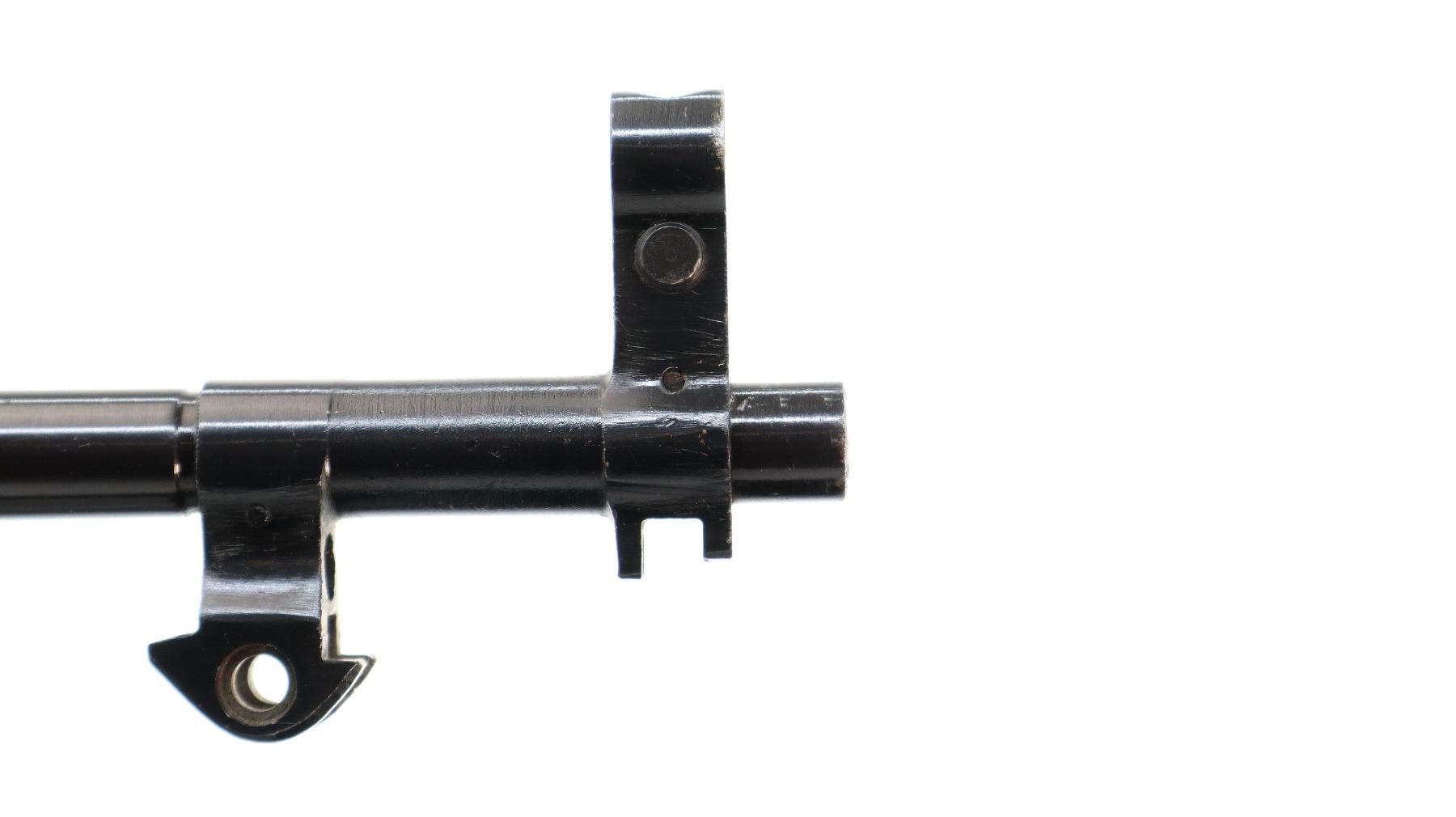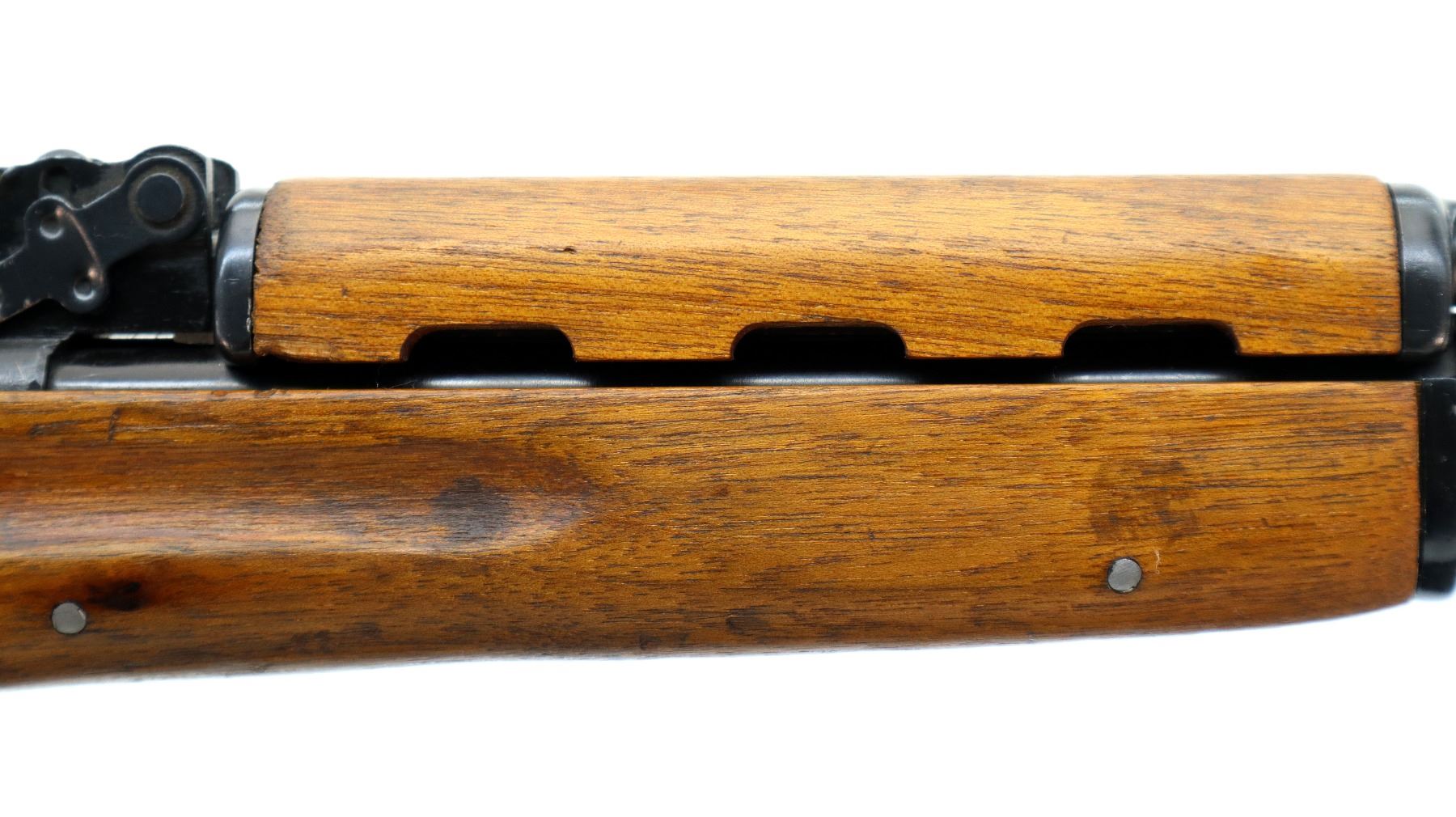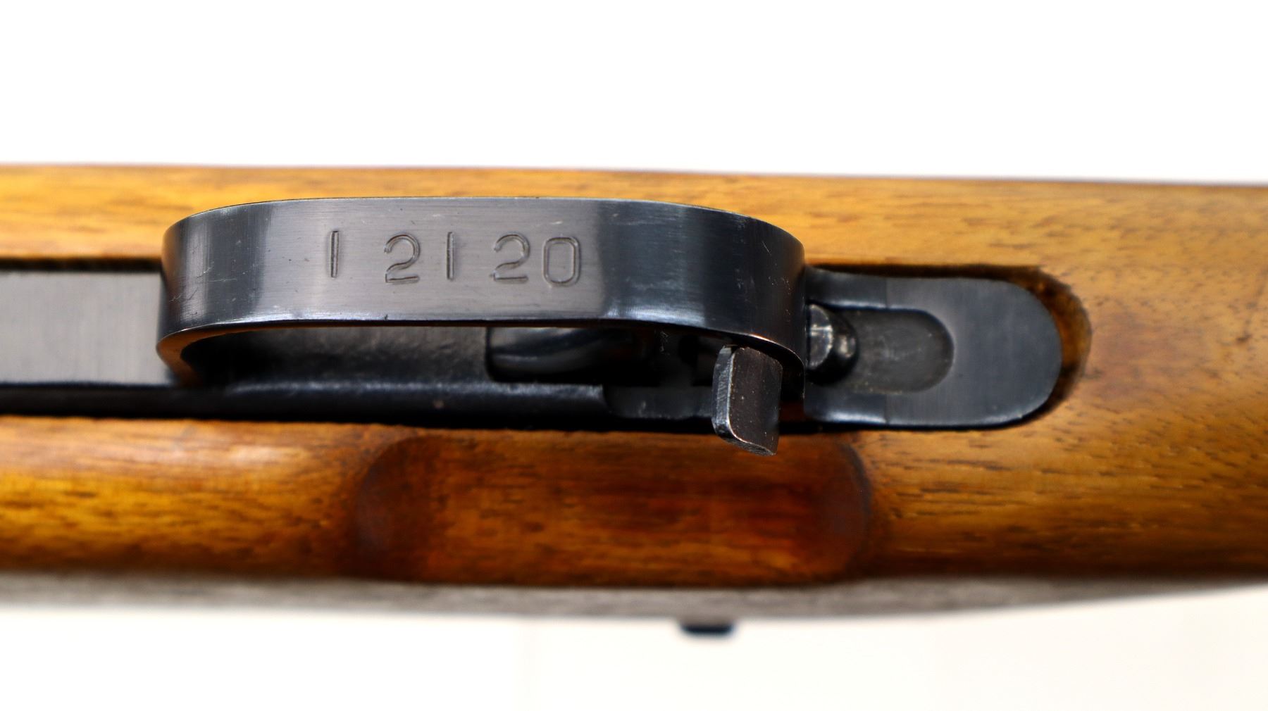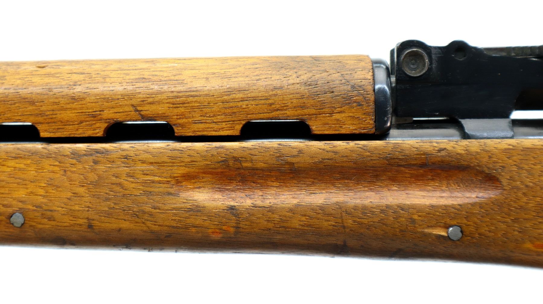 Main Description: Post front sight with hood and ramp, adjustable u notched rear sight, blued finish. Two piece wood stocks, ventilated handguard, finger grooved forearm, pistol grip, smooth steel butt plate with trap, sling swivels, missing cleaning rod and folding bayonet.