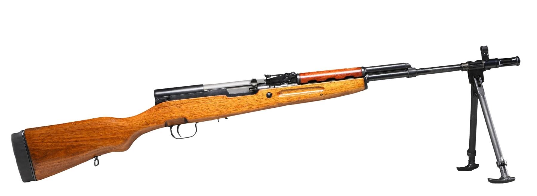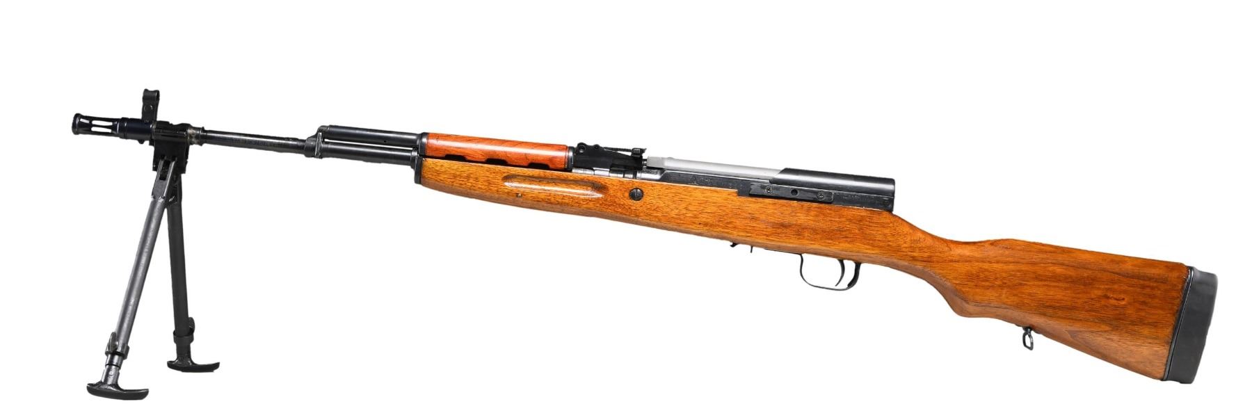 BIPOD AND FLASH SUPPRESSOR. Cal. 7.62x39. S# 111525. Serial numbers match on receiver, bolt, bolt cover & trigger guard. Bbl. 22 1/2" over aftermarket flash suppressor. Import marked on right side of receiver. Tangent rear sight graduated to 1,000 meters. Post front sight w/ protective hood. Rifle has been modified to accept an unmarked accessory folding bipod. Muzzle is equipped w/ aftermarket flash suppressor which is notably loose in its installation. Cleaning rod is not present. Folding bayonet has been removed & the mortice in the forend tip has a wood filler piece The magazine assembly has been removed & the inside of the stock has been lightly modified to accept an aftermarket detachable magazine, which is not present. Receiver has added scope mount in dovetail on the left side attached w/ 2 Phillips screws. Recoil pad/stock spacer to extend length of pull. CONDITION: stock set has added finish over light wear & handling marks. Metal retains 75% original worn thinning blue. Very good shiny bore. (25-2156/RW). MODERN. $300-500.