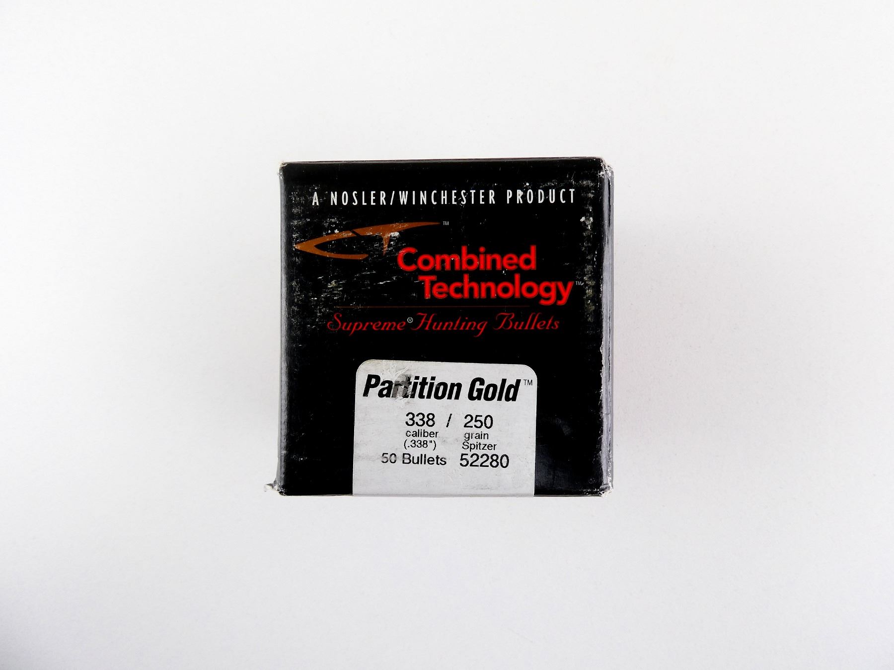 LOT INCLUDES; APPROX. (50) BULLETS. APPROX. DIA .338", 250 GRNS (STATED ON BOX NOT CONFIRMED) SPITZER, PARTITION GOLD, UNOPENED.