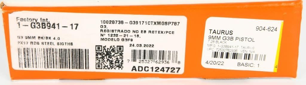 Up Next We Have a Brand New Taurus G3 Semi Auto Pistol Chambered in 9MM, and Comes in The Factory Box With Two 17 Round Magazines and Lock.