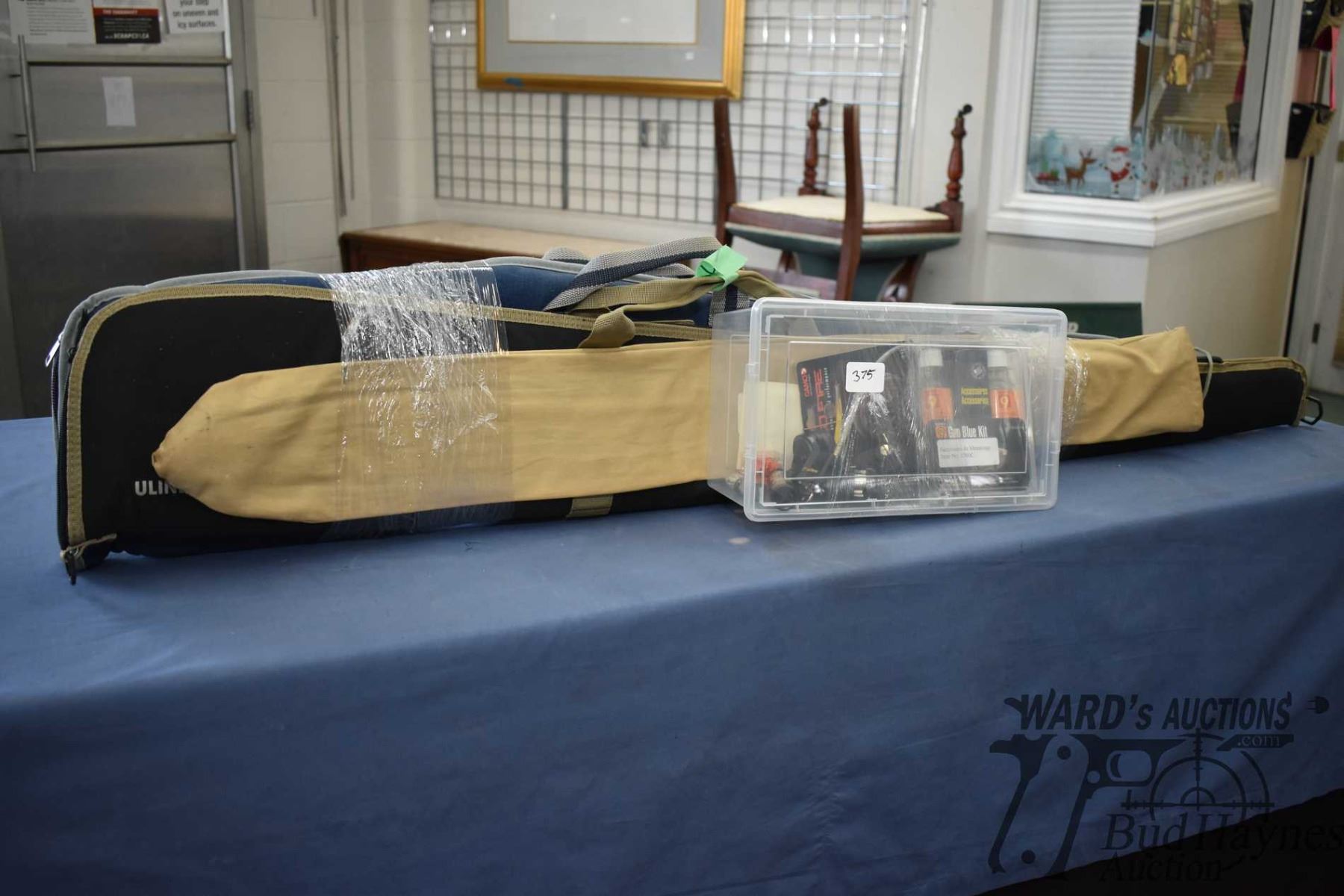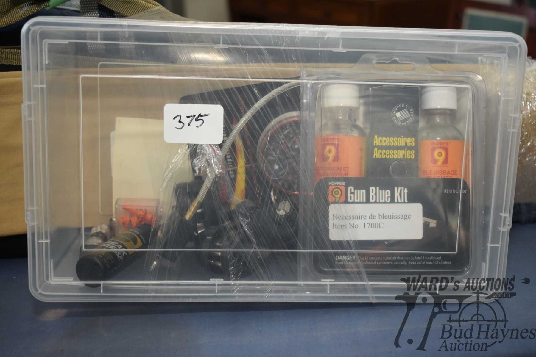 New in pack of Hoppes gun blueing kit, three trigger locks, one cable lock, two packs of pellets and three soft rifle cases