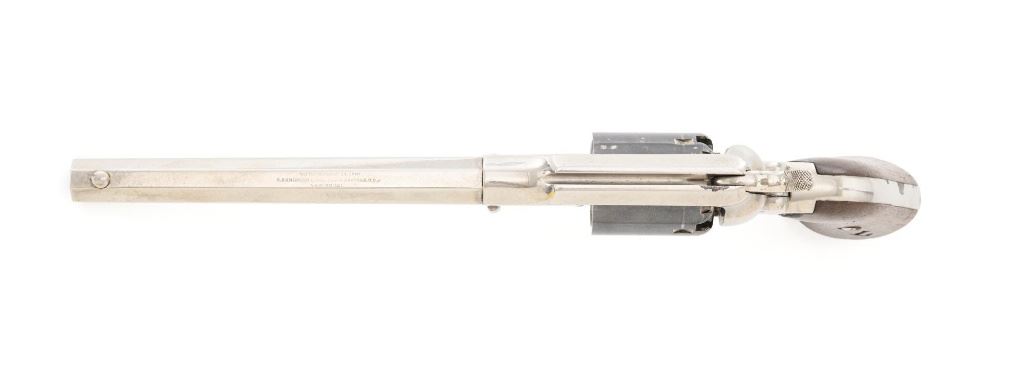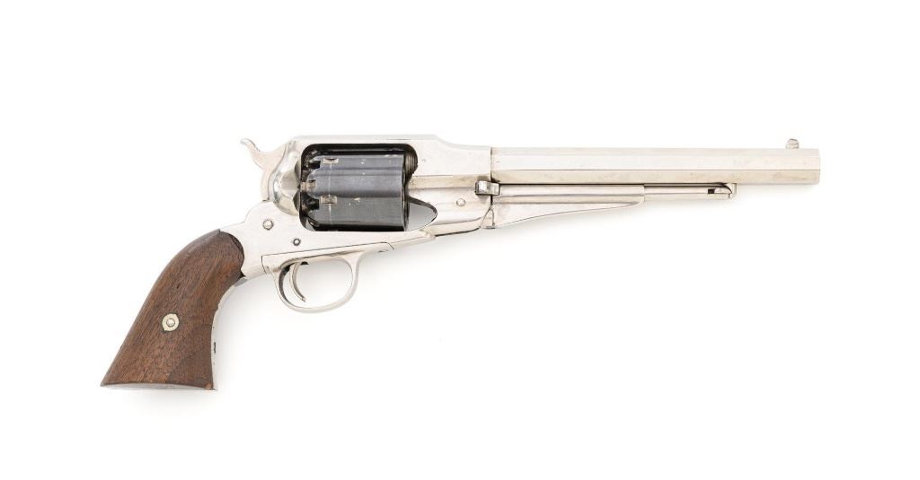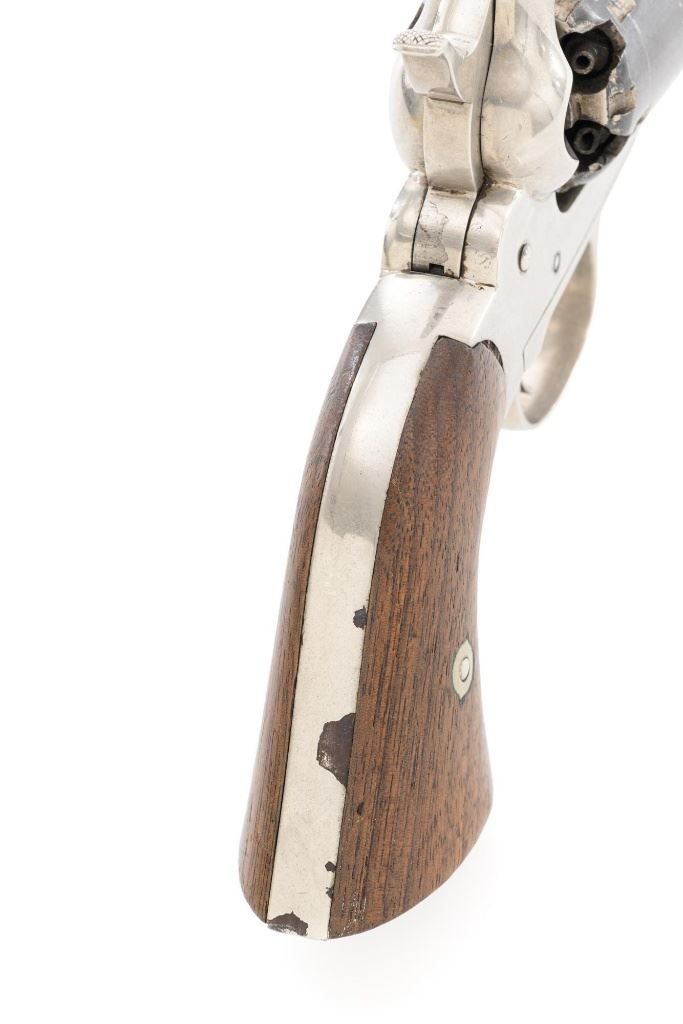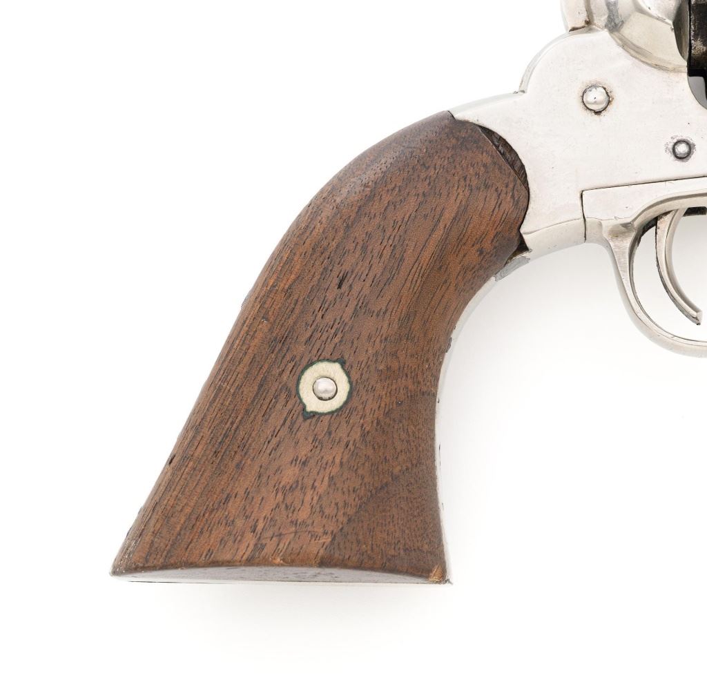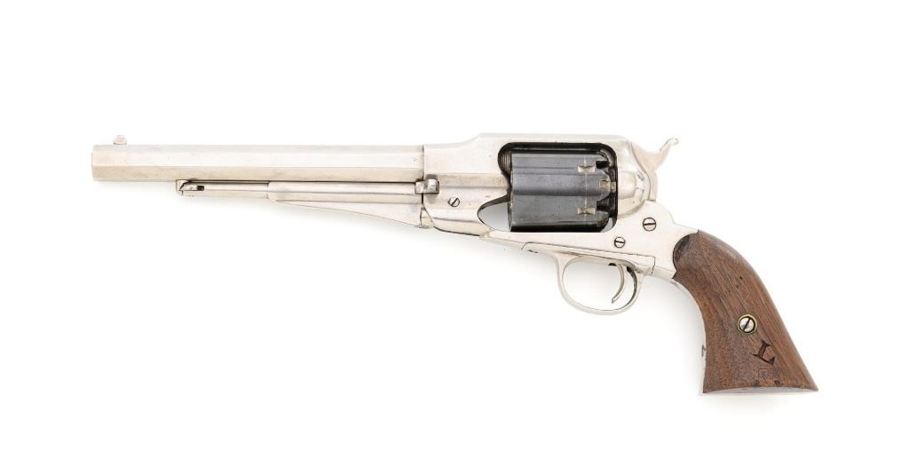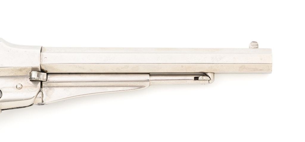 Nickel Plated Remington New Model Army Single Action Percussion Revolver, #115871, .44 cal., 8" octagon barrel, nickel finish with blued cylinder, smooth two-piece walnut grips, standard fixed blade front and notched rear sight. Barrel address reads "PATENTED SEPT. 14, 1858/E. REMINGTON & SONS. ILION, NEW YORK, U.S.A./NEW-MODEL". Matching serial number located on left side of the grip frame, underside of barrel, back of the cylinder, and in pencil on back of the right grip. There is a clear government inspectors cartouche of Giles Porter "GP" on the bottom of the left grip, with a large "L" stamped above that cartouche. Additionally, there are several additional sub-inspection proofs stamped on the gun, including a "W" at the rear frame, "C" on the left top side of the frame, "W" on the left side barrel flat at the breech, "Q" on the underside flat of the barrel near the muzzle, "J" on the front of the trigger guard, "C" on both the right side barrel flat & right side frame, "G" and "C" on back of the cylinder. Factory lettering and inspectors marks are clear. Overall condition is very good, retaining approx. 92% nickel plated finish; thinning and toning blue on the cylinder, mixed with mild frosting. Nickel finish was applied over light pitting and erosion along top of the barrel and frame, with additional pitting visible on the right front of the frame. Walnut grips are very good with nice grain pattern, scattered moderate dents and scratches, particularly along the bottom edge of the left panel. Action is crisp and cycles smoothly. Bore with scattered spots of light erosion, rifling is clearly defined and rates very good overall. Est.: $1,500-$2,000. (Antique) (Michael Strietbeck Collection)