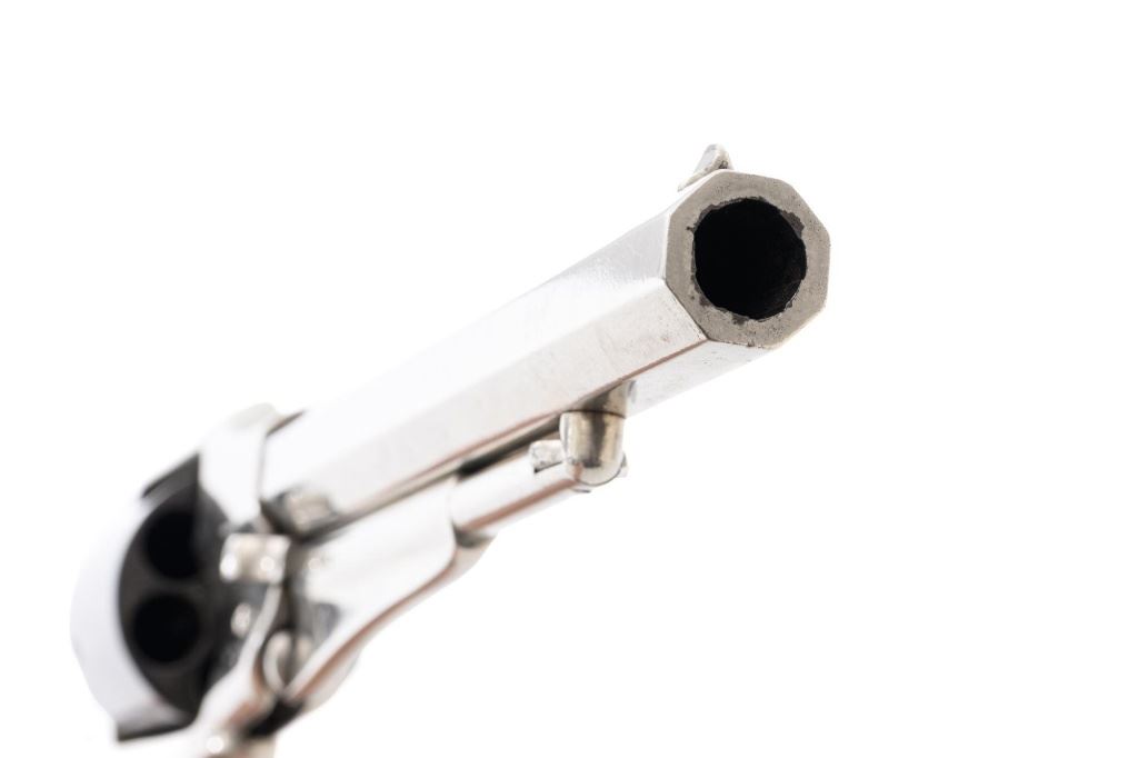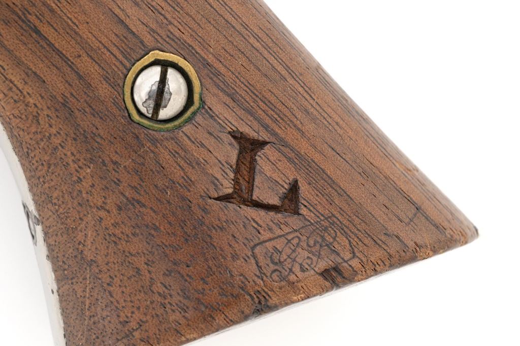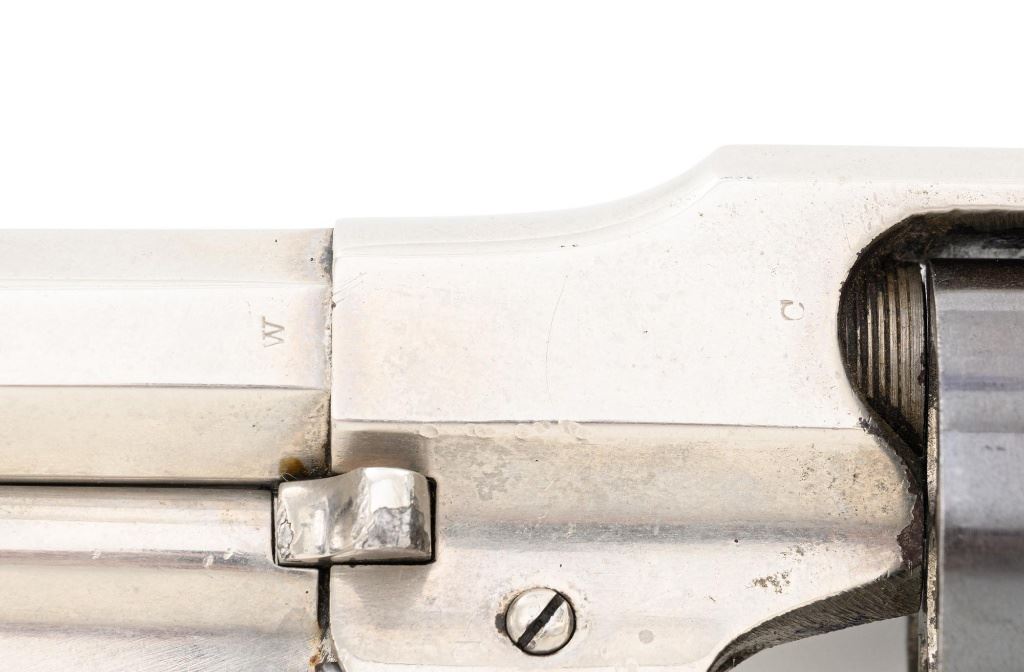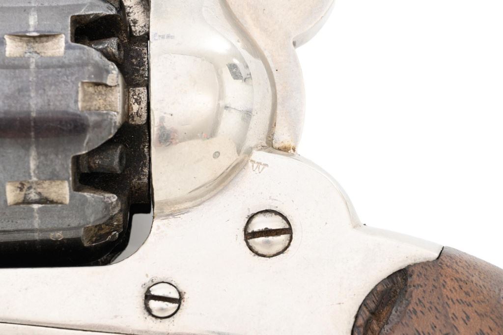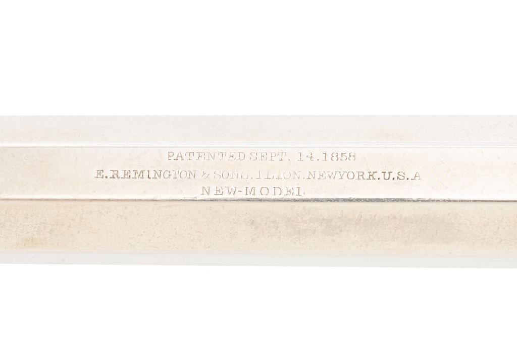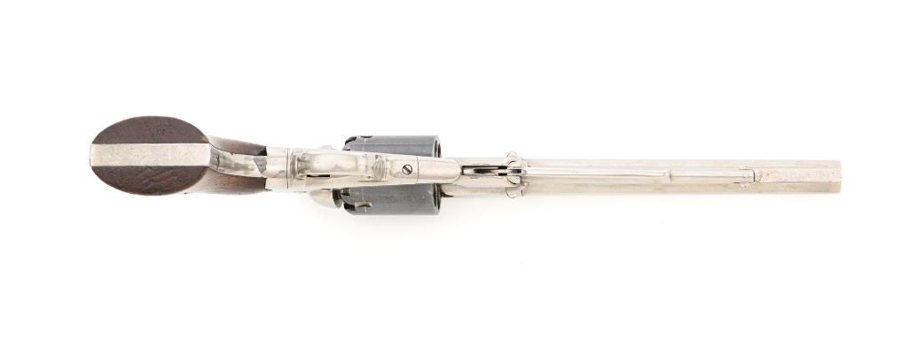 Nickel Plated Remington New Model Army Single Action Percussion Revolver, #115871, .44 cal., 8" octagon barrel, nickel finish with blued cylinder, smooth two-piece walnut grips, standard fixed blade front and notched rear sight. Barrel address reads "PATENTED SEPT. 14, 1858/E. REMINGTON & SONS. ILION, NEW YORK, U.S.A./NEW-MODEL". Matching serial number located on left side of the grip frame, underside of barrel, back of the cylinder, and in pencil on back of the right grip. There is a clear government inspectors cartouche of Giles Porter "GP" on the bottom of the left grip, with a large "L" stamped above that cartouche. Additionally, there are several additional sub-inspection proofs stamped on the gun, including a "W" at the rear frame, "C" on the left top side of the frame, "W" on the left side barrel flat at the breech, "Q" on the underside flat of the barrel near the muzzle, "J" on the front of the trigger guard, "C" on both the right side barrel flat & right side frame, "G" and "C" on back of the cylinder. Factory lettering and inspectors marks are clear. Overall condition is very good, retaining approx. 92% nickel plated finish; thinning and toning blue on the cylinder, mixed with mild frosting. Nickel finish was applied over light pitting and erosion along top of the barrel and frame, with additional pitting visible on the right front of the frame. Walnut grips are very good with nice grain pattern, scattered moderate dents and scratches, particularly along the bottom edge of the left panel. Action is crisp and cycles smoothly. Bore with scattered spots of light erosion, rifling is clearly defined and rates very good overall. Est.: $1,500-$2,000. (Antique) (Michael Strietbeck Collection)