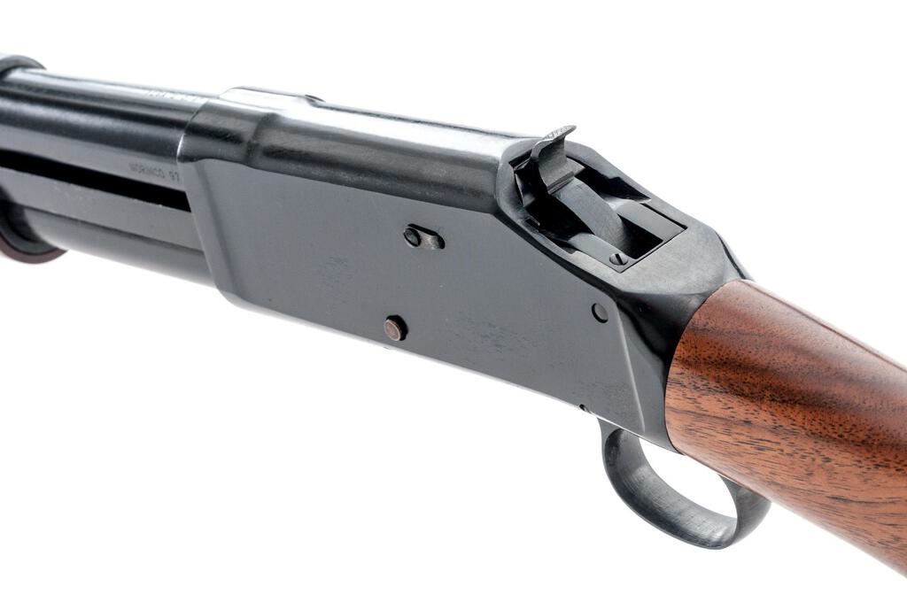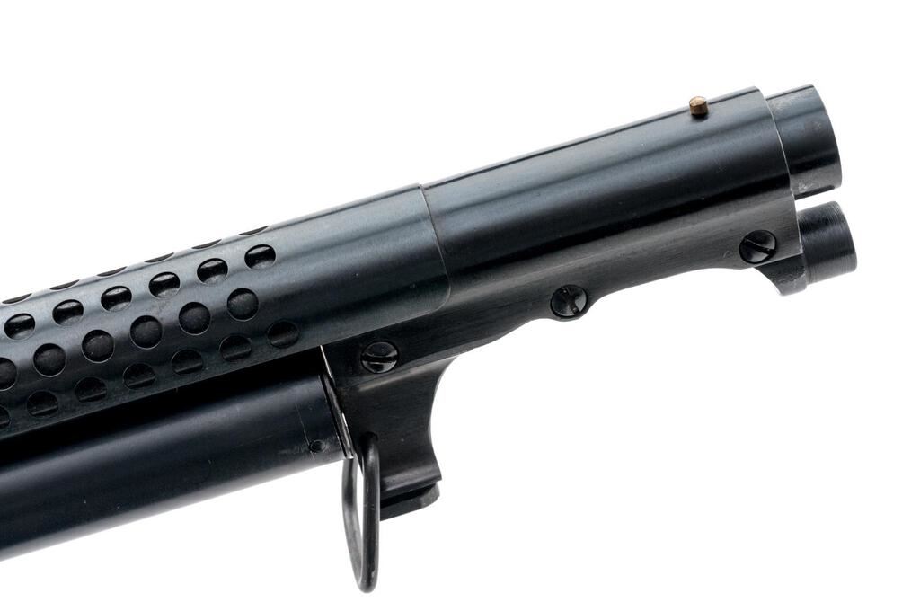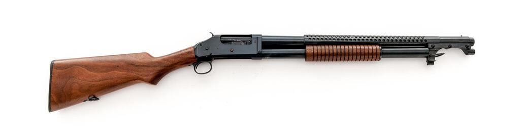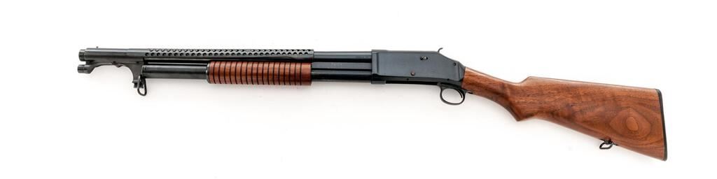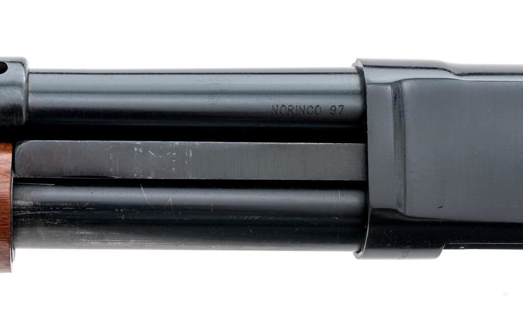 Norinco Model 97 Slide-Action Shotgun, #MJL2635, 12 ga., 20" barrel with heat shield, brass bead front and no rear sights, blue finish, smooth wood two-piece stocks, M1897 pattern bayonet lug, sling swivels and spur hammer. Shotgun is in near excellent overall condition showing little use, retaining approx. 96% factory blue finish with only light scratches and handling marks. Right side of the barrel is import marked and the underside of the receiver is marked "MADE IN CHINA". Stocks are in very good condition with a couple of faint scratches. Buttstock ends with a checkered plastic buttplate providing a 13-7/8" LOP. Bore is very good and the action is crisp on this Chinese copy of a Winchester M1897 trench gun. $600-$800. (Modern)