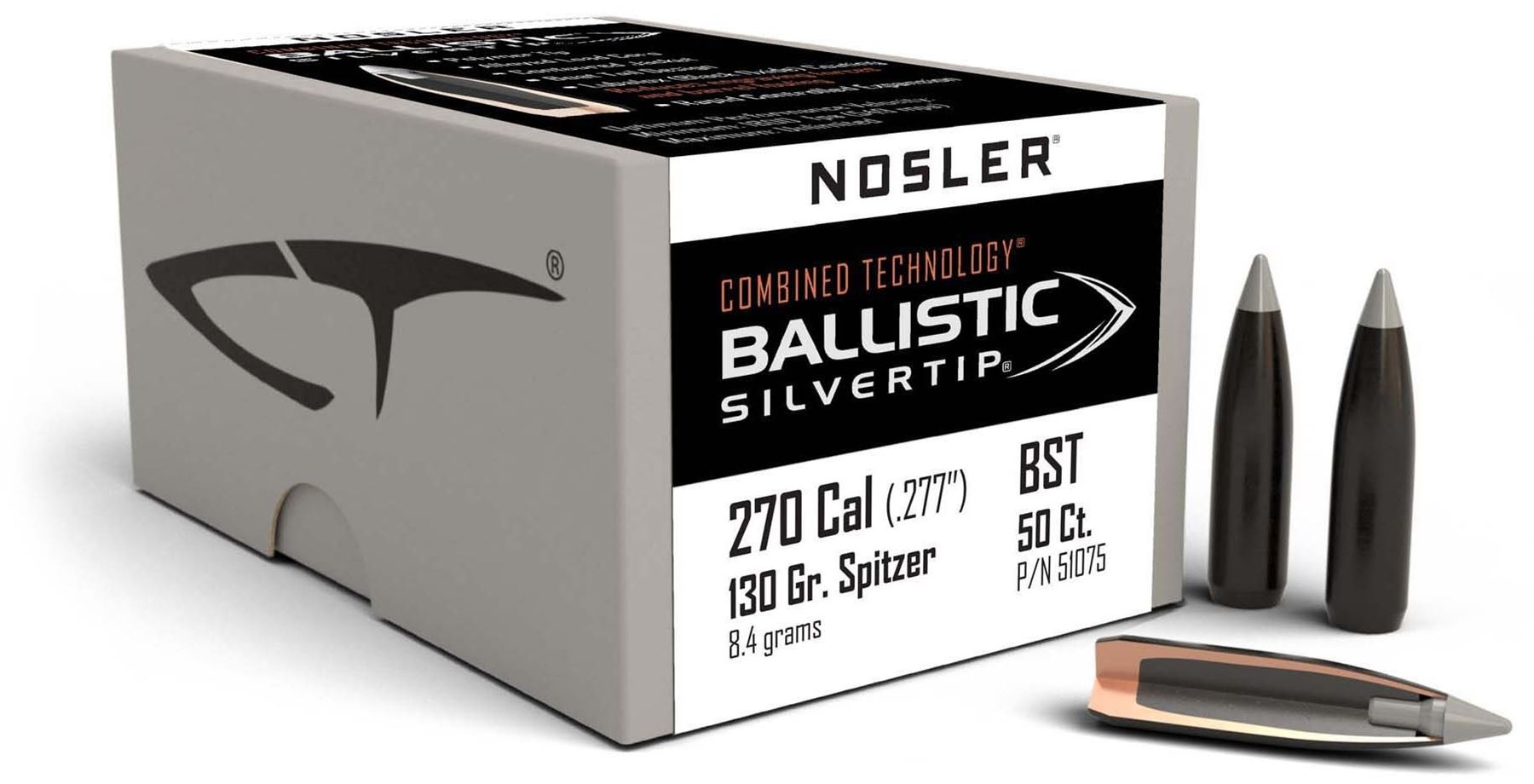 Nosler Ballistic Silvertip 270 Caliber .277" Spitzer 130 Grain (50 Count). This listing is for one brand new, unopened, factory sealed unit. UPC: 54041510752.
