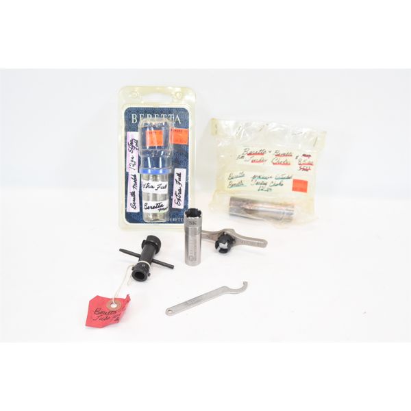 Extra full 12 gauge choke Beretta or Benelli precision full turkey choke, 20 gauge Briley skeet choke and 3 various Beretta choke wrenches.