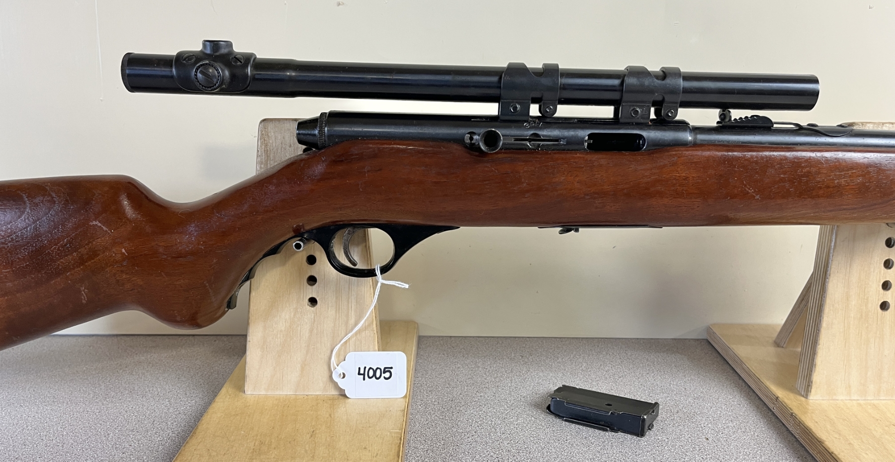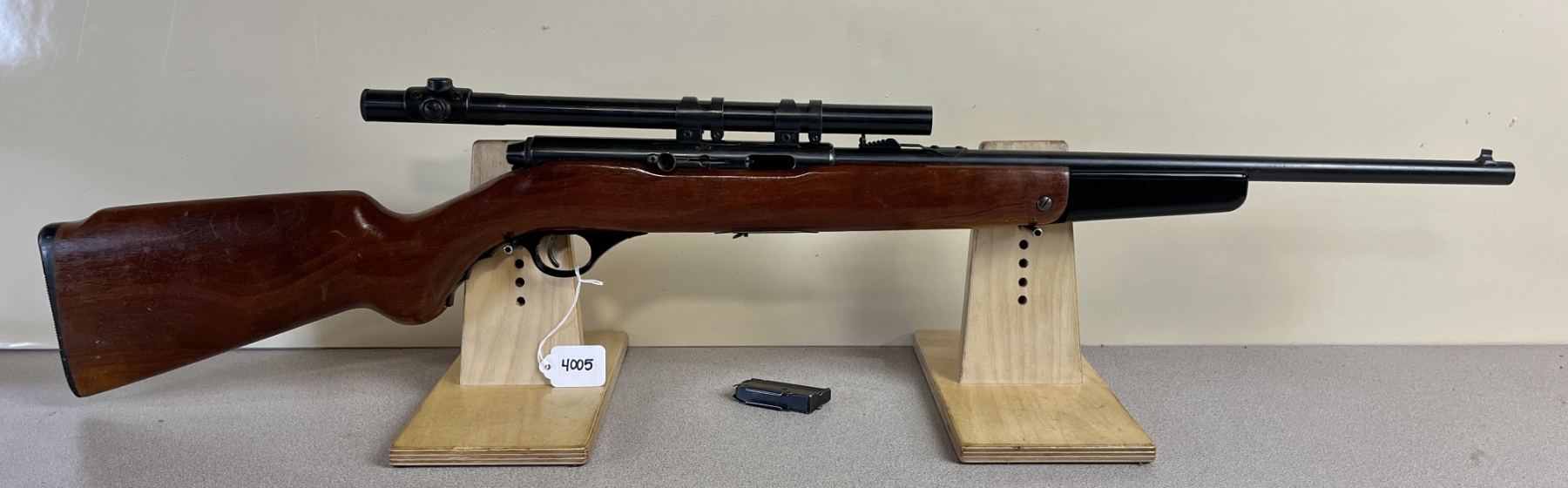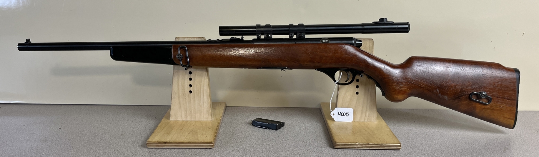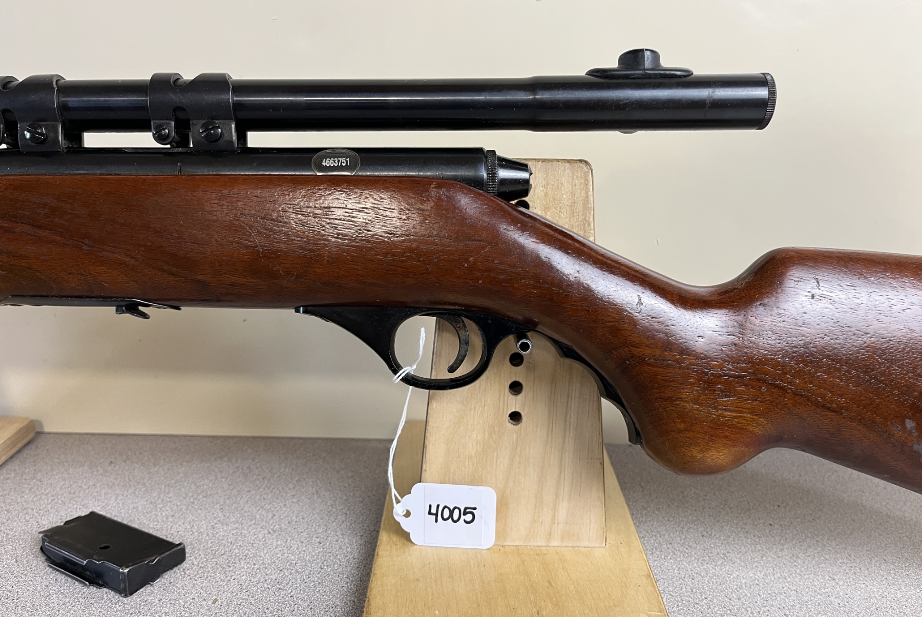 CONDITION: F-G OVERALL. BORE G. SPECS: 18IN BBL W/ IRON SIGHTS. INCL 1X MAG. EXTRAS: MOSSBERG 4X SCOPE. CLEAR W/ CROSSHAIRS. S/N: 4663751.