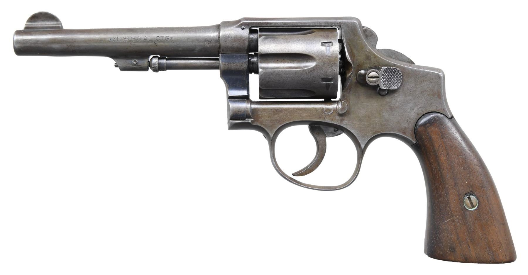 Cal. 38 Spl. S# X70. Bbl. 4 7/8". Copy of a Smith & Wesson double action revolver mfg. by "O.H.". Left side of the bbl. is marked with the cal. designation, with O.H.'s patent information marked across the top. Right side of the frame is marked with an "OH" monogram, in the S&W trademark logo fashion. Frame is mounted with 2-piece plain wood grips. Fixed half-moon blade front sight, with square notch rear sight. Hammer spur has been bobbed. CONDITION: metal components retain traces of their original blue finish, with the balance retaining a mottled gray/brown patina, with some scattered spots/areas of light to mild pitting. Bore is bright, exhibiting a bulge and an area of mild pitting towards the muzzle, while retaining strong rifling throughout. Grips show some scattered superficial marks and impressions from handling and storage, but otherwise remain sturdy and serviceable. (25-2544/MLW). MODERN. $150-250.