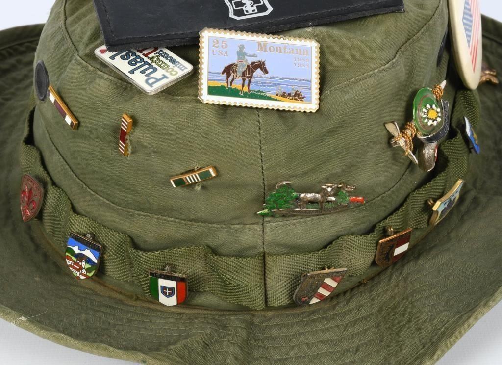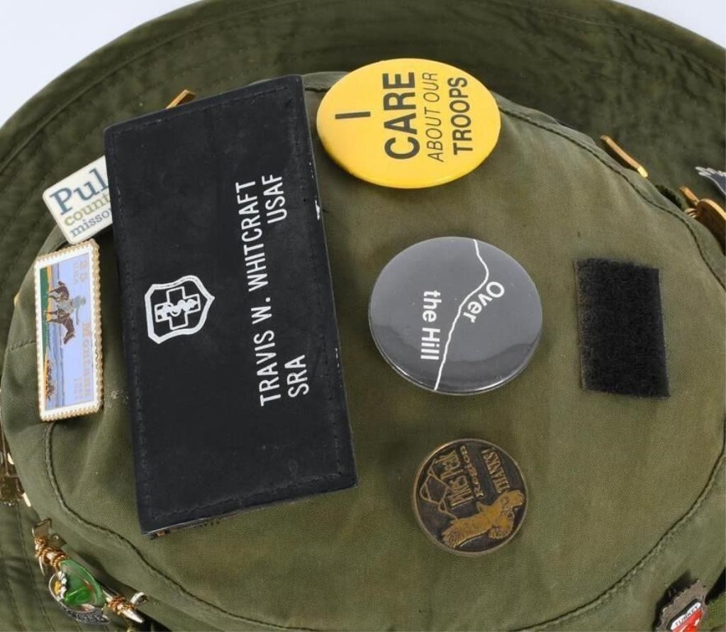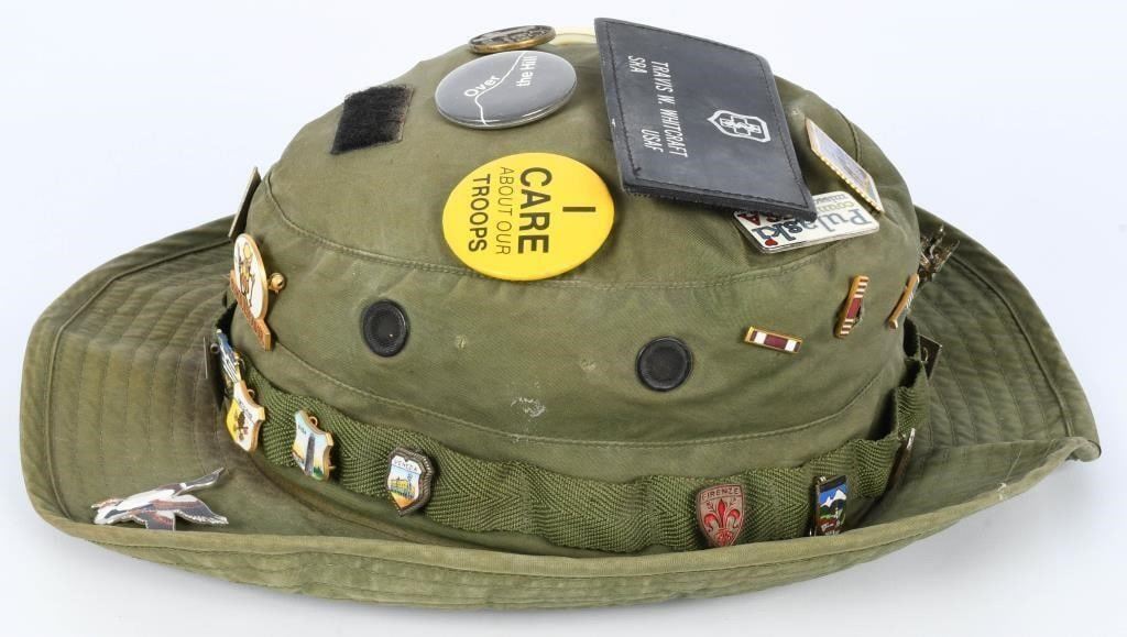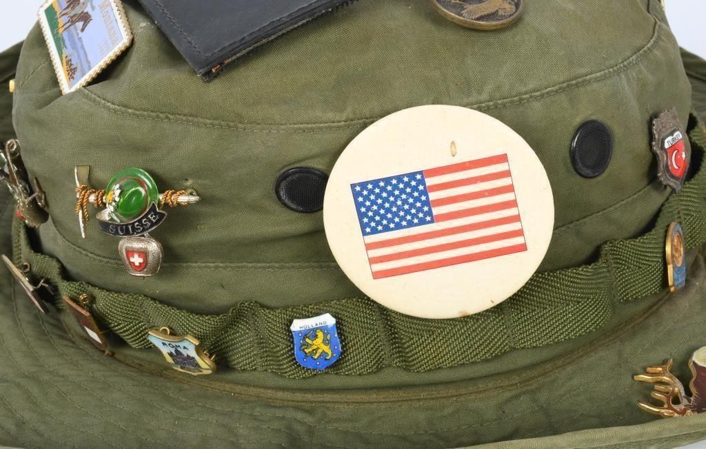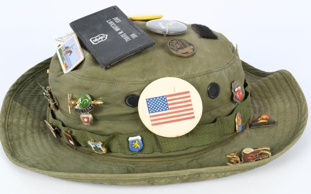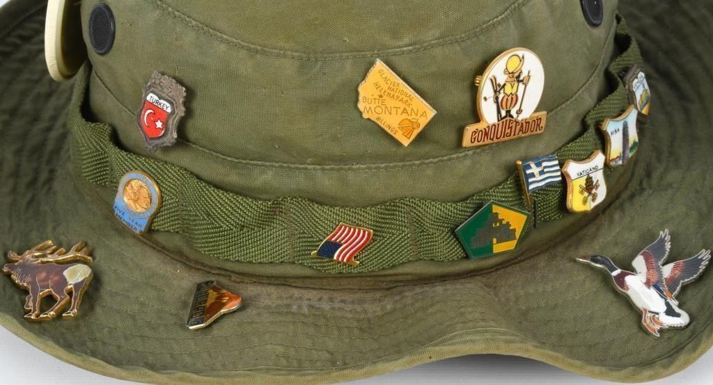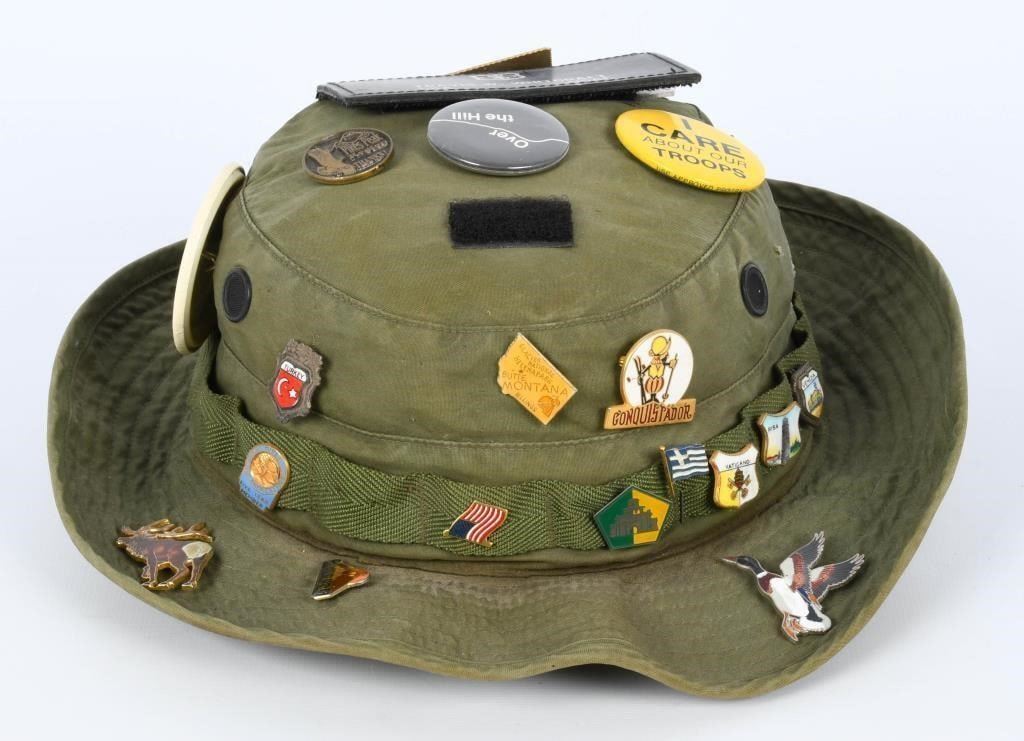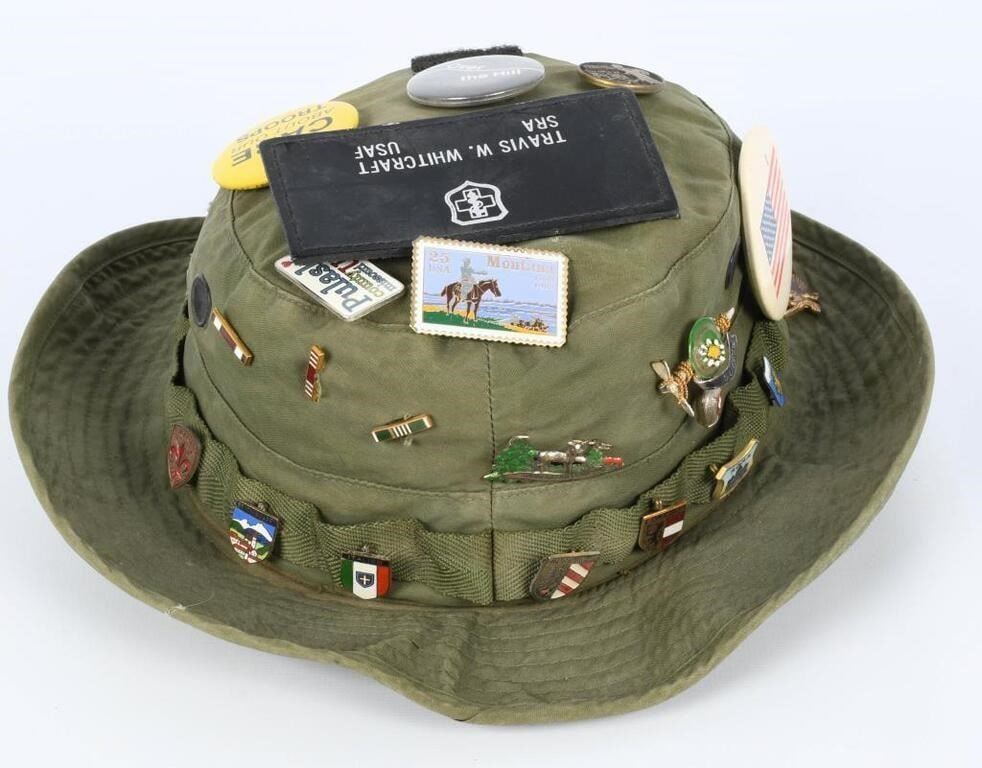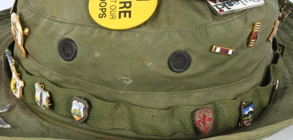 OD green U.S. Military hat adorned with vintage pins, please refer to pictures when bidding this lot, there is approx 32 various Pins Pikes Peak, Montana Stamp, U.S. Flag, Venezia, Pisa, Vaticano, Firenze, Swiss Medical Pin, German Pin, Nurnberg Pin, Roma, Turkey, Colorado, I Care about Our Troops Pin, Pulaski County Missouri Pin, Conquistador,and a Badge Pin with the USAF SRA Name on the badge
