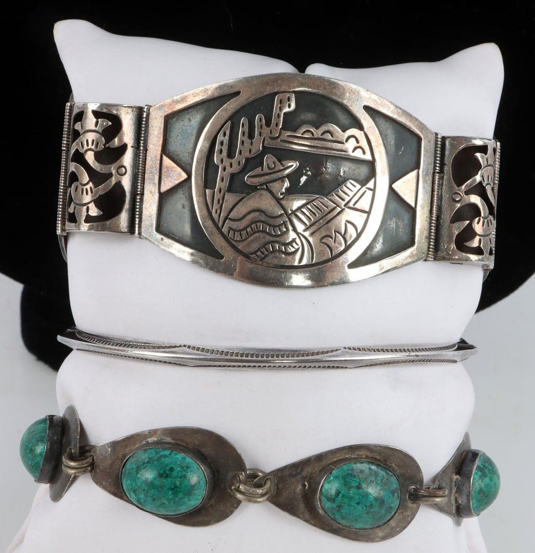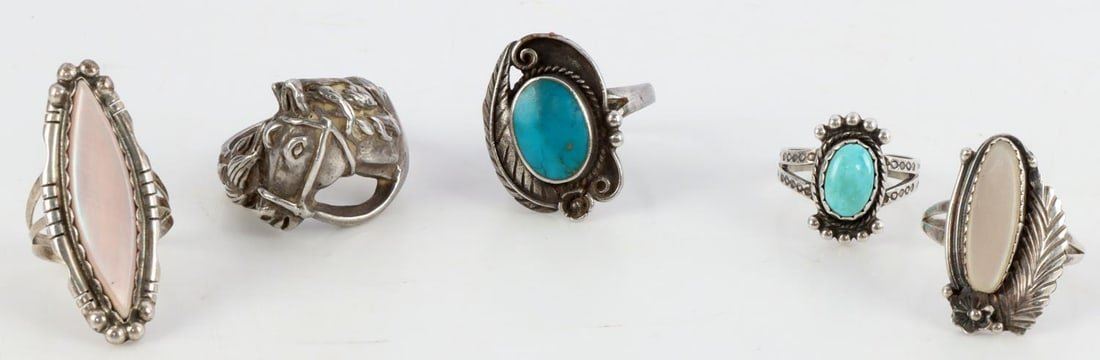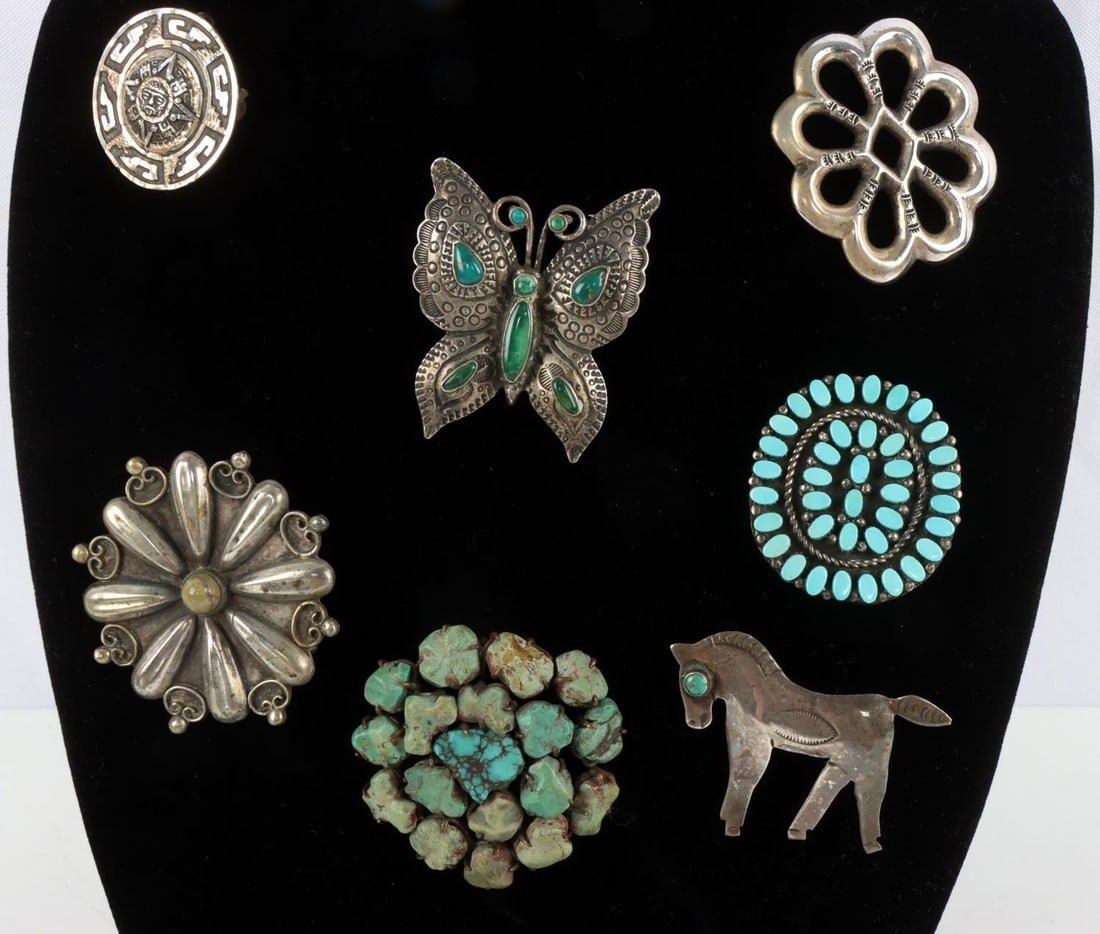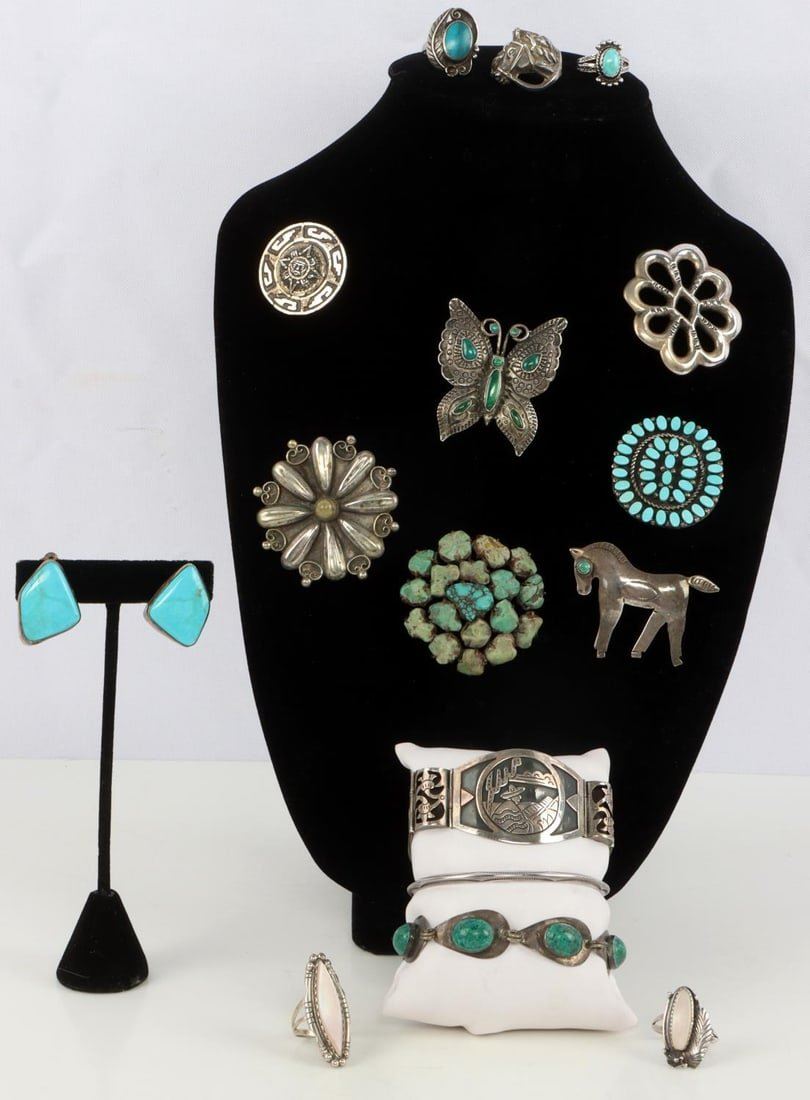 Vintage southwest and Native American sterling silver and turquoise jewelry including necklaces, pendants, bracelets, cuffs, brooches, earrings and rings (sizes 6-10) jewelry. Total weight 190 grams. This lot has a reserve.