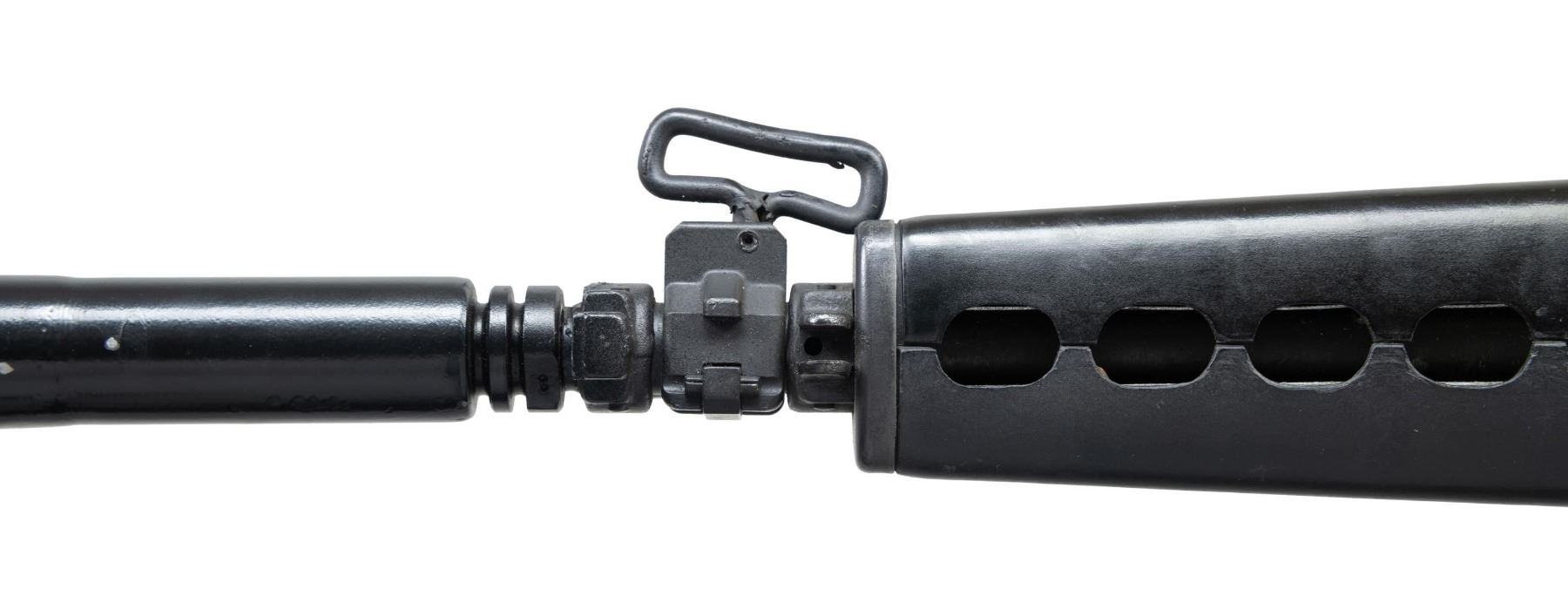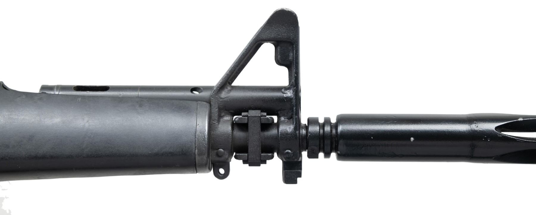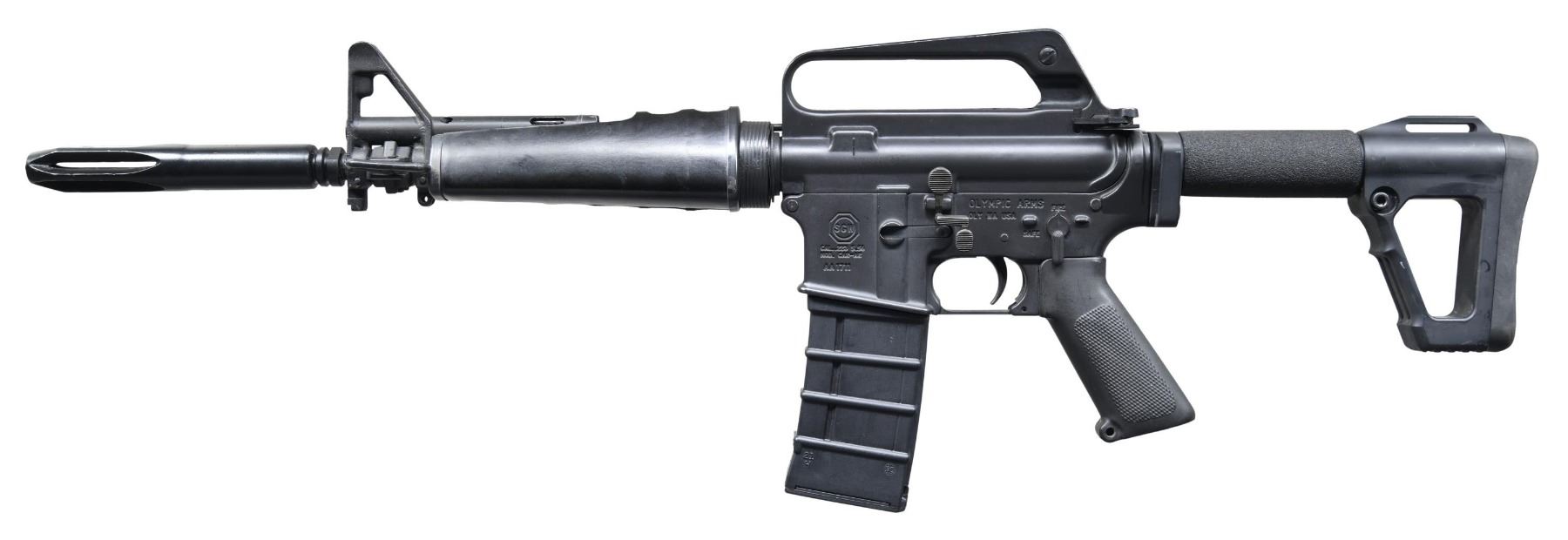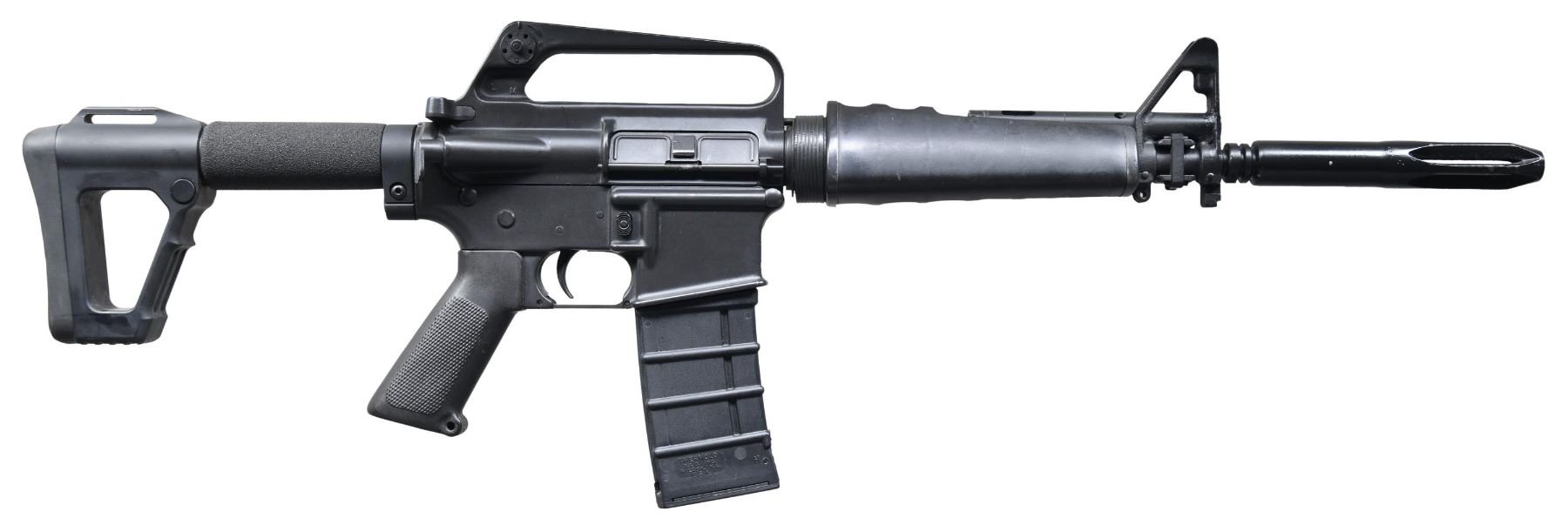 CONVERSION. Cal. 5.56mm. S# AA1711. Bbl. 16" over brake. A 1980 evolution of a "Shorty" using technology available at the time. Built on an Olympic Arms lower receiver it utilizes a 10" barrel w/ a permanent 6" flash hider. The special beavertail carbine handguards have been fitted to accommodate what appears to be a version of the early "Rhino System" gas piston conversion. It consists of a replacement gas block / front sight assembly which contains a spring loaded op-rod, which replaces the gas tube. Protected post front sight. Carry handle upper receiver w/ forward assist. Dual aperture rear peep sight. Short, fixed tubular shoulder stock. M16 profile bolt carrier. Left side sling swivels, front & rear. Extended bolt release. MAGS: 1 plastic 30 rd. CONDITION: Finish complete & consistent retaining heavy coverage. Bolt carrier still has standard gas key, so a solid key may be necessary to function correctly. Bright bore w/ strong rifling. Fire control mechanism appears to function correctly when cycled by hand. (25-2295/JZ). MODERN. $600-900.