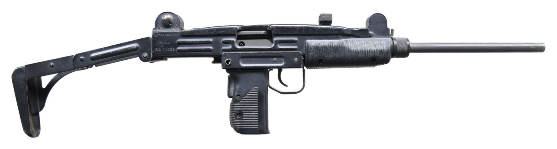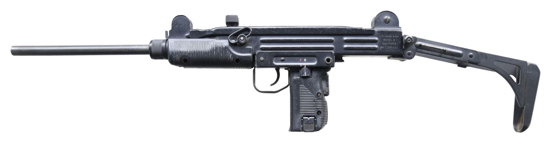 Cal. 9mm. S# SA41099. Bbl. 16". Mfg. Action Arms Ltd. / IMI. UZI model B semi automatic carbine. A closed bolt semi automatic version of the world-famous SMG. Fitted w/ factory collapsible stock, almost resembling the SMG to a "T". Front sight elevation adj. protected post. Windage adj. dual aperture rear peep sight, marked "1" & "2". Classic black painted finish on exposed metal parts. F-S trigger group. Rotating sling swivel on left side of receiver. Black plastic furniture. CONDITION: Finish coverage complete & consistent w/ some light surface drag lines typical of those earned when "stacking" in storage & some light thinning in areas of mechanical intervention & on some high spots. Bore is bright w/ strong rifling. Black furniture. Fire control mechanism appears to function properly when cycled by hand. PROVENANCE: Lifelong Collection of Terrence McCarty. (24-87/JZ). MODERN. $1,200-1,800.