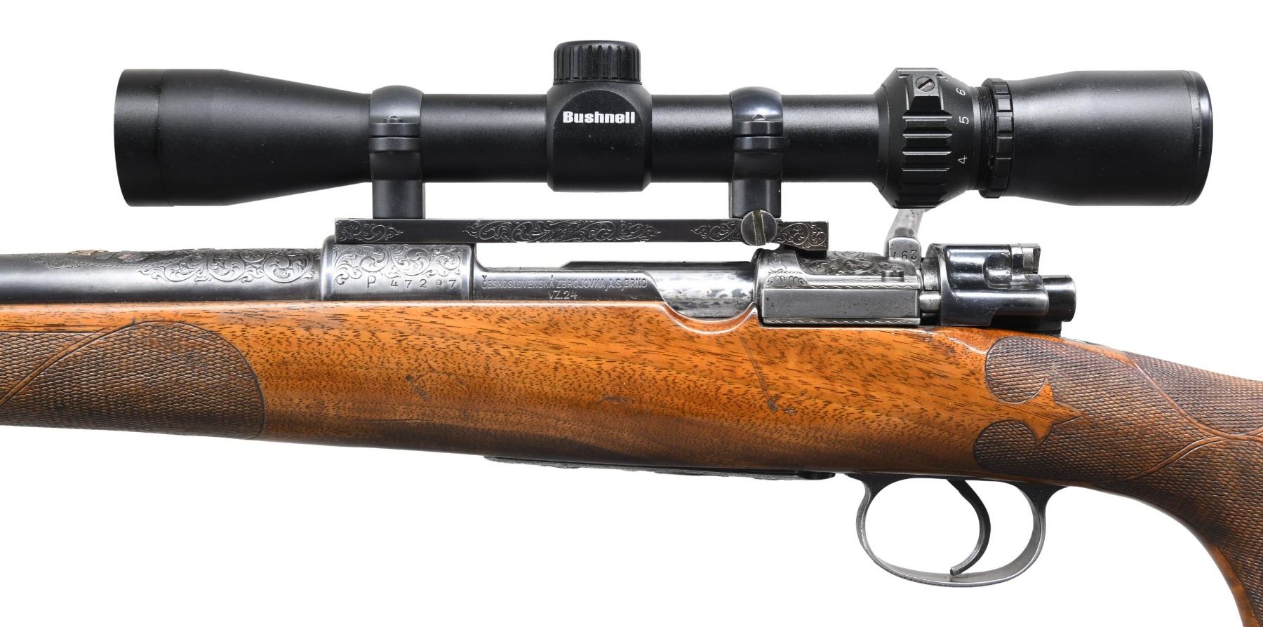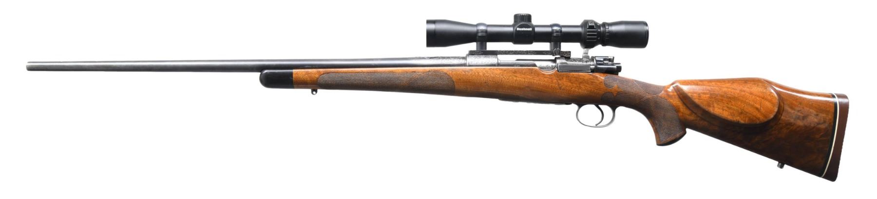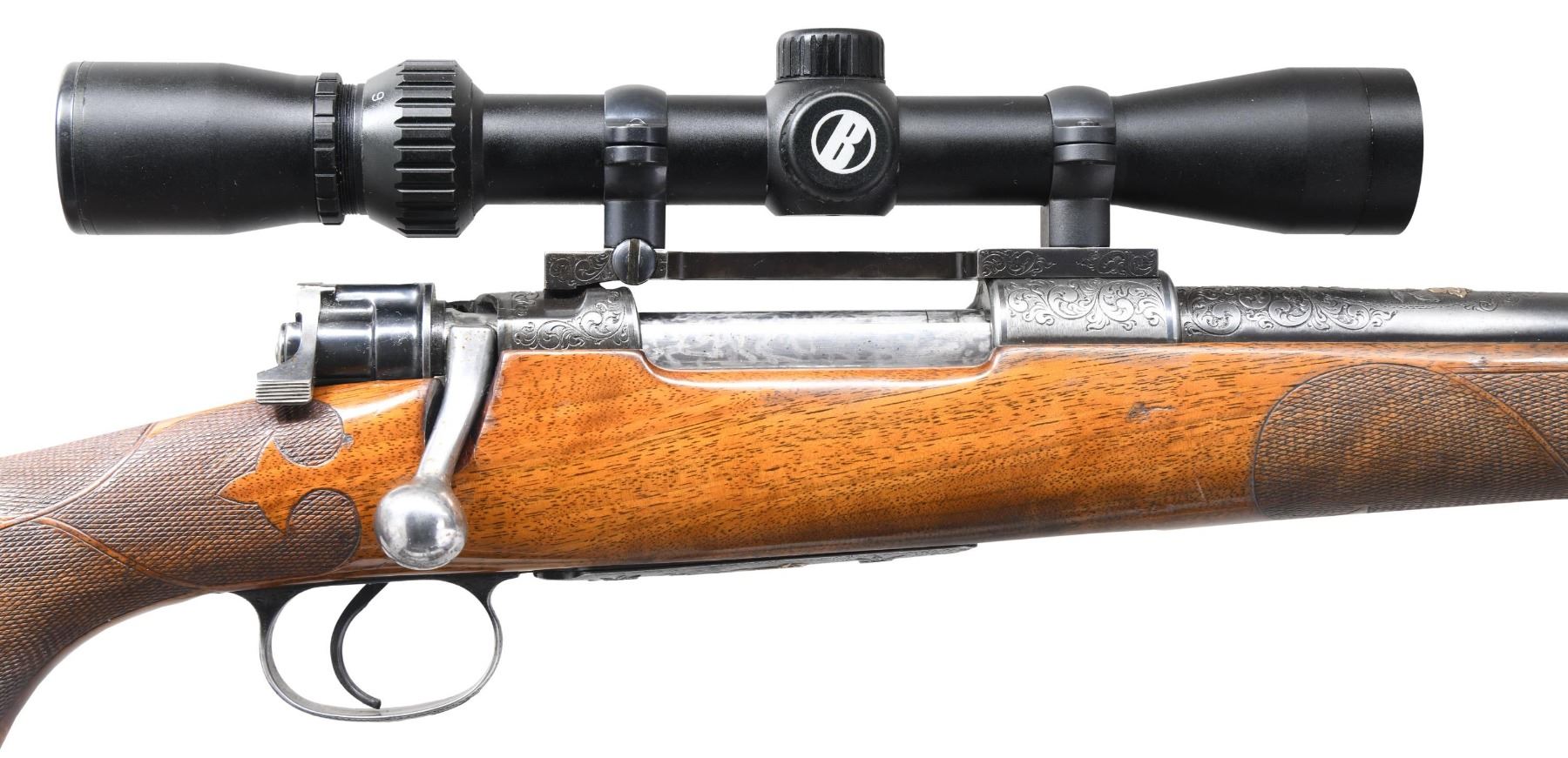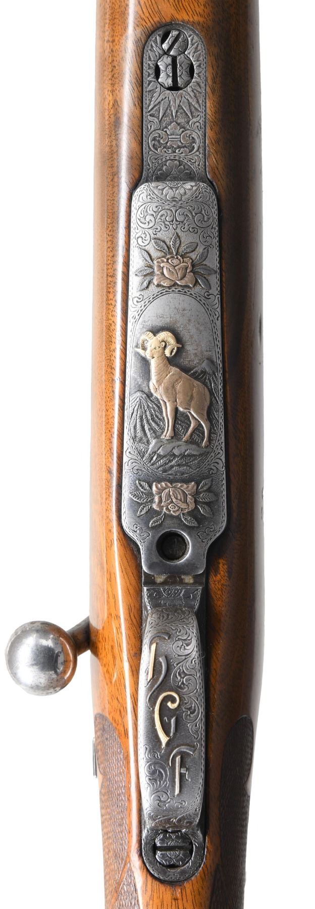 Cal. 300 Win Mag. S# P47297. Bbl. 25" light taper sightless. Top of bbl. is engraved "LUFT .30 MAGNUM". Action features low-swing safety, commercial single stage trigger w/ damascened finished bolt & extractor. Floorplate features an oval game scene w/ gold inlaid bighorn ram having gold roses above & beneath it. Trigger guard has gold inlaid initials that appear to be "ICF". Breech end of bbl. has deep relief floral bouquet w/ gold roses. Action & 1 piece scope base have generous coverage of vine type foliate scroll hand engraving. Bushnell 4-9x32 matte finished scope w/ duplex reticle on Redfield style mounts. Custom Monte Carlo cheekpiece sporter stock of gloss finished fancy walnut. Stock features include segmented fleur-de-lis wraparound hand checkering, black forearm tip w/ black grip cap & swivel bases. LOP: 13 5/8" over a solid brown Presentation pad. WEIGHT: 9 lbs, 1.6 oz. CONDITION: metal retains 40% dull finish fading to gray. Stock has worn finish showing scratches, marks & small dents. Bore is generally bright w/ lightly worn rifling. Scope has clear optics. PROVENANCE: from the renowned collection of quality sporting arms from Lewis Drake together with inventory of Lewis Drake Associates. (24-6580/DS). MODERN. $1,000-2,000.