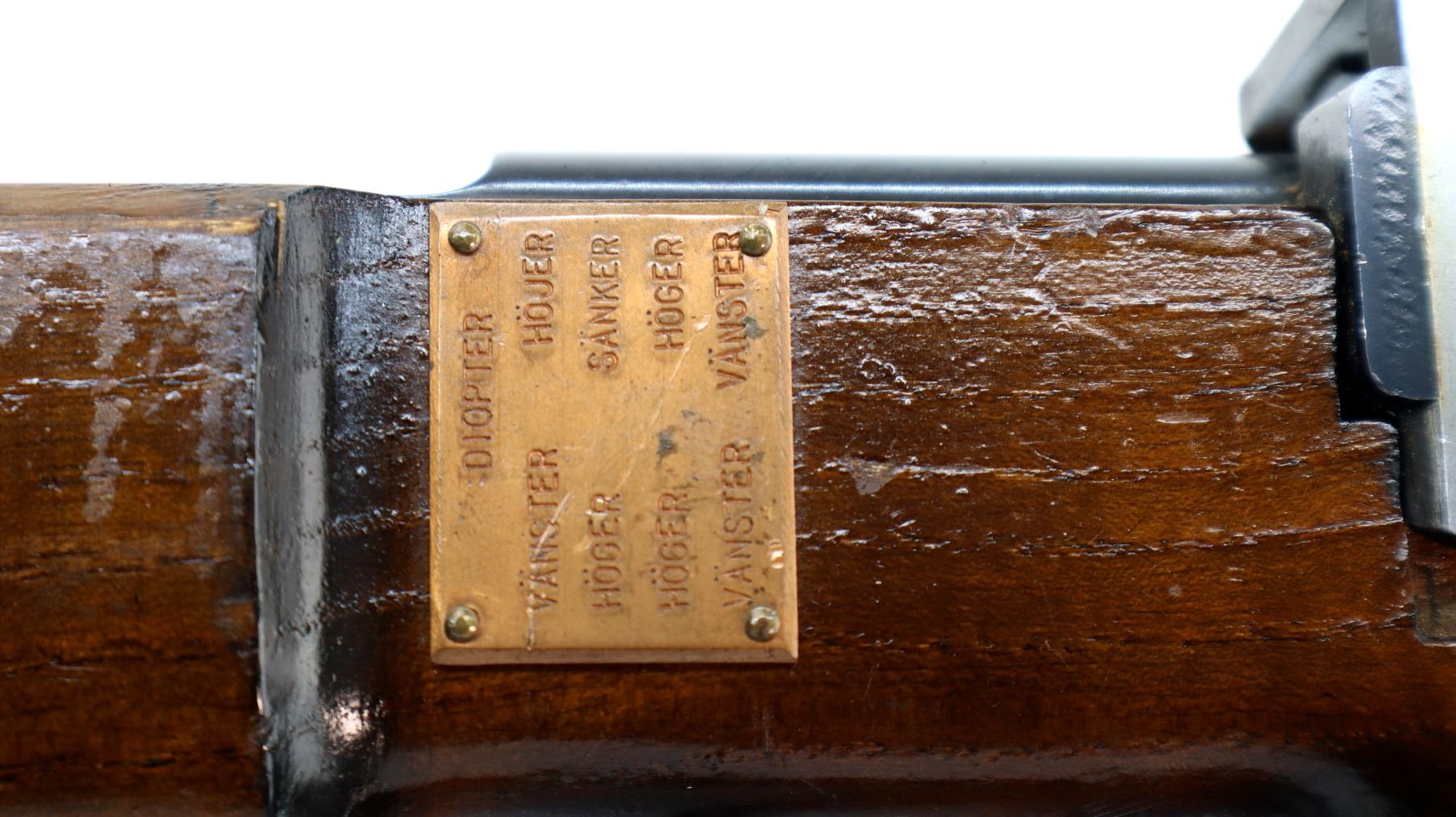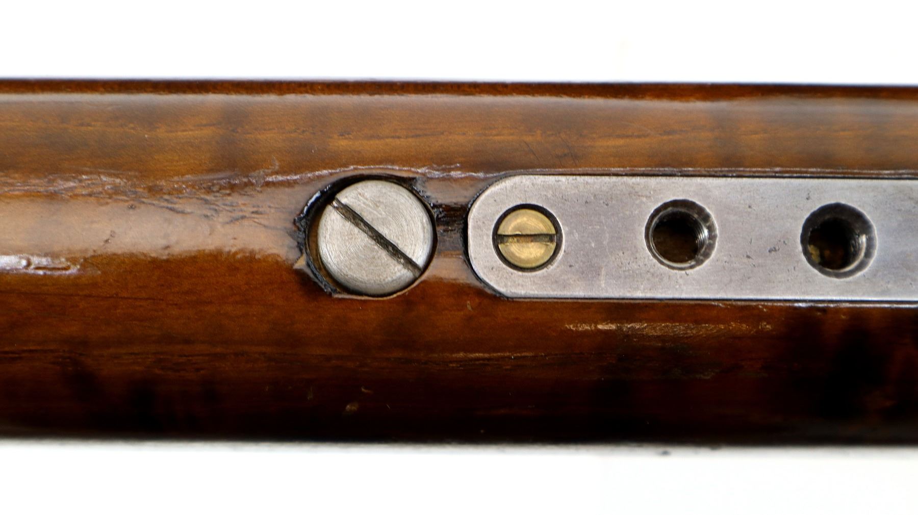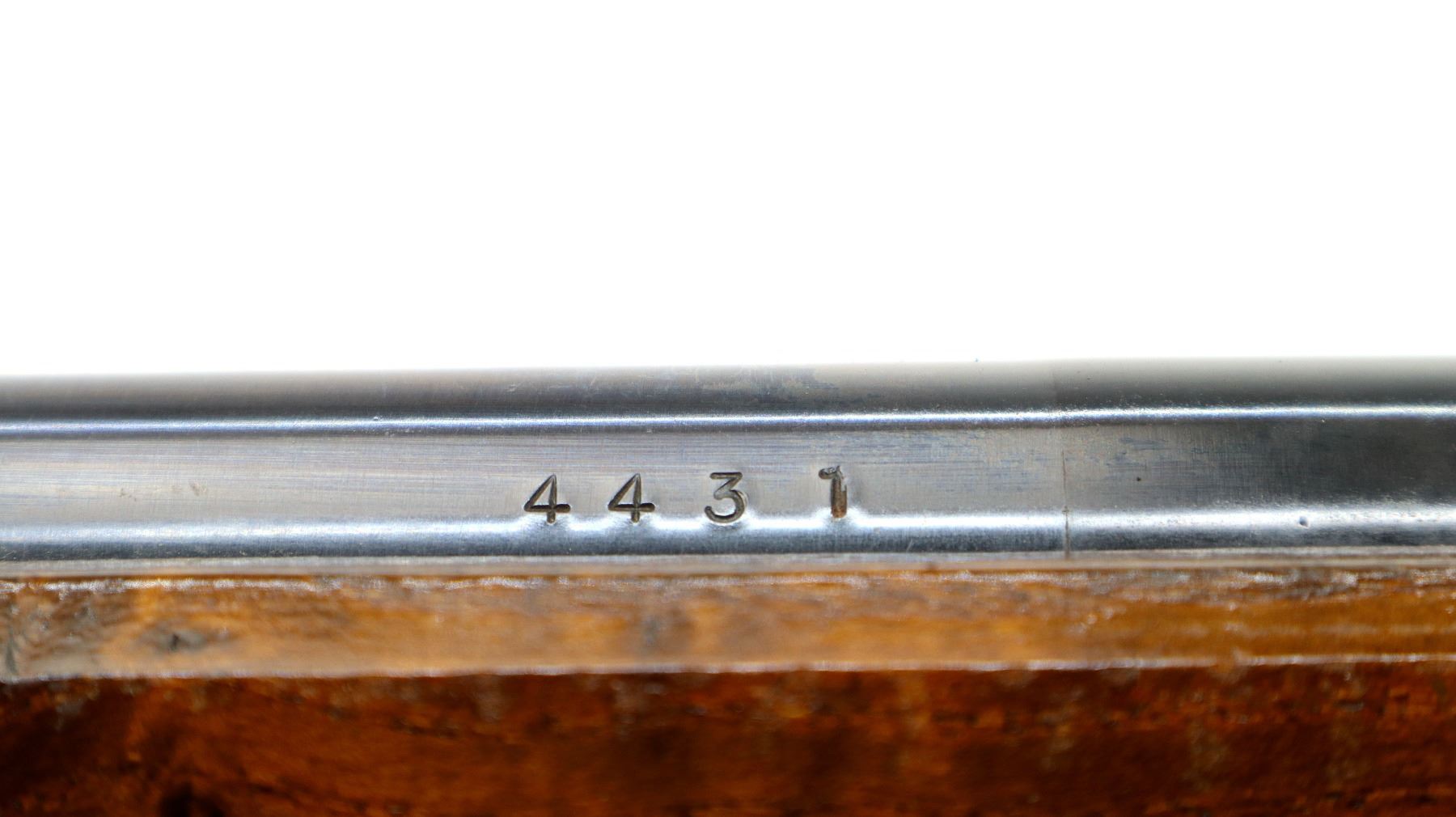 Main Description: Globe front sight with insert and ramp, adjustable rear peep sight, blued finish, heavy barrel, smooth bolt knob, extractor is present. Two piece wood stock, heavy forearm, thumb hole pistol grip, stock broken off through wrist, cheek rest, grooved adjustable hooked alloy butt plate, finger rest trigger guard, short rail under forearm and front sling swivel only.