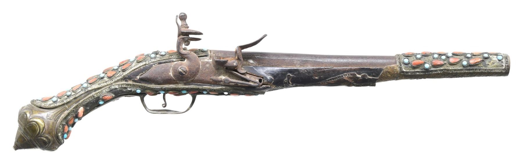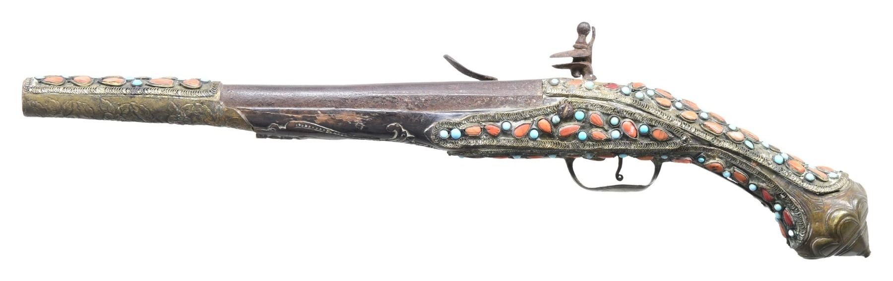 Cal. 68. NSN. Bbl. 11.5". Unmarked lock. Hardwood stock w/ brass butt cap & brass plates throughout covered with teal & amber colored stones along with embossed floral engraving. CONDITION: Metal has dark patina appearance with oxidation plugging touch hole. Stock has large break near lock plate along with patina to plates. Pitted bore. Lock holds at full cock, but trigger is frozen. (01-26983/MD). ANTIQUE. $500-1,000.