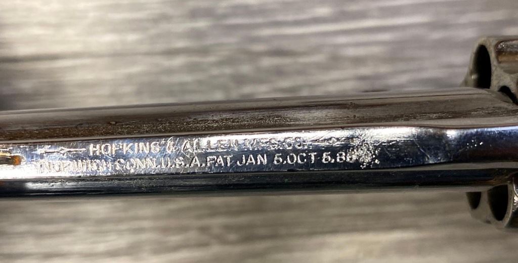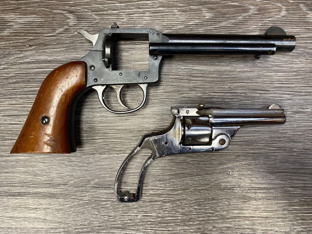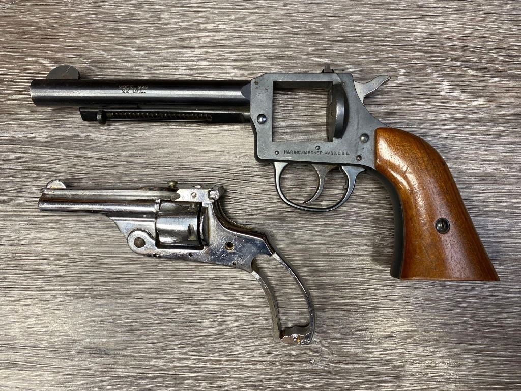 Hopkins and Allen hammer and Internals missing. No grips. Parts gun. H&R has no cylinder, bore id dark. Finish show light patina. Colt Woodsman is in relic condition, no internals, frame only, no original finish left. (Out of State Only)