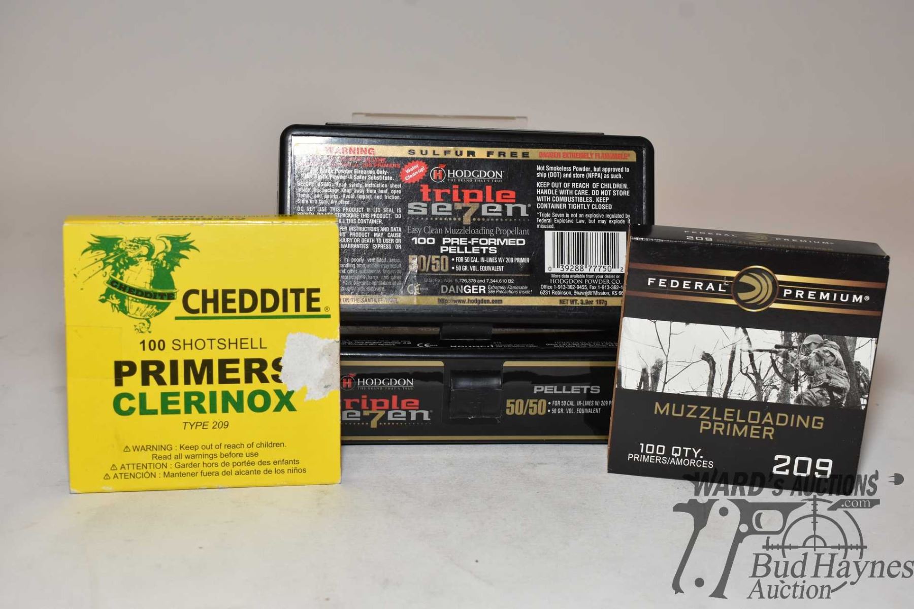 One full 100 count box of Hogdon triple se7en pre-formed pellets for .50 cal and a 27 count box, plus 100 count pack of Federal muzzle loading primers #209 and one 4 count cheddite shot shell primer pack