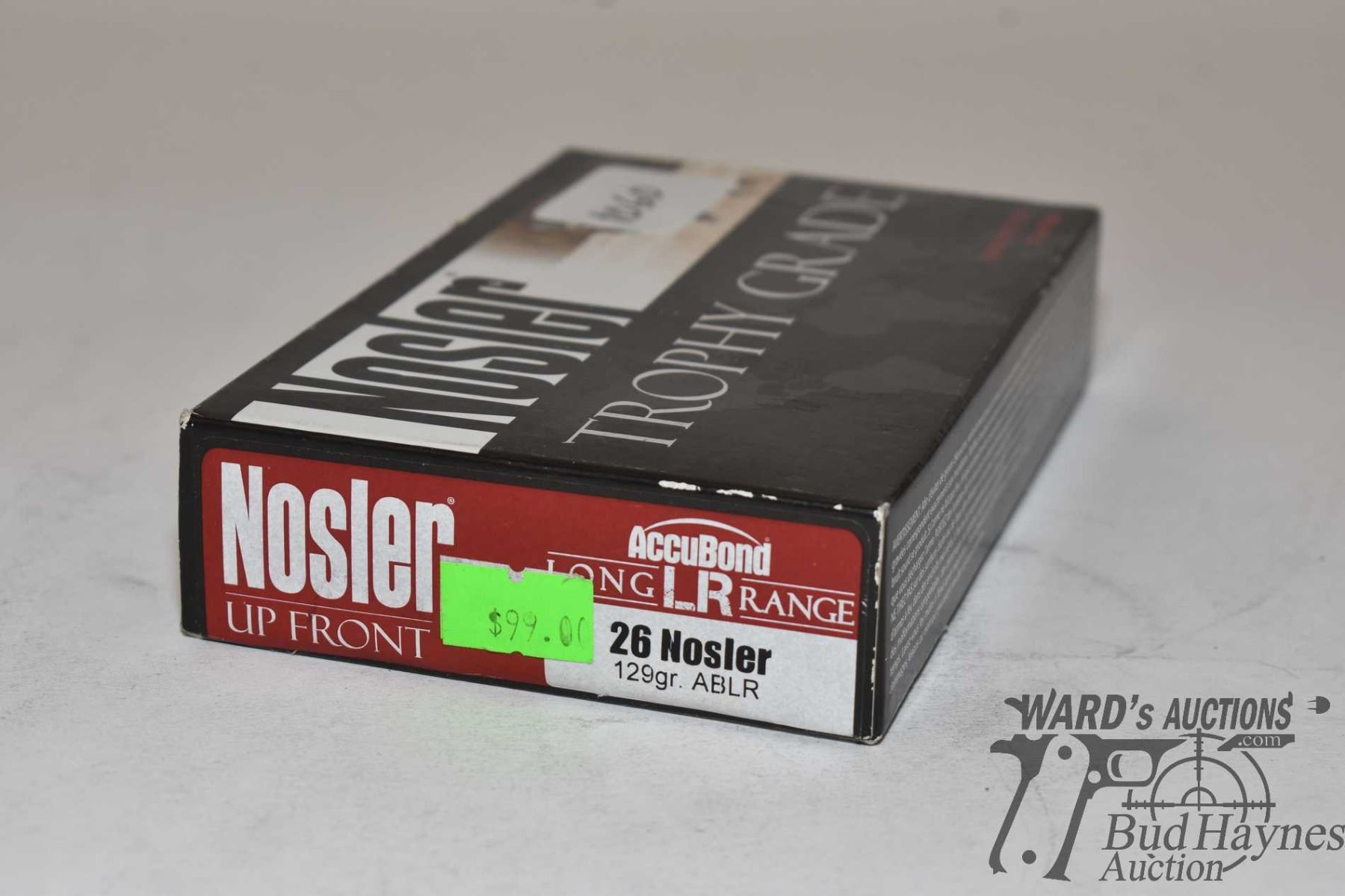 One full 20 count box of Nosler Trophy Grade 26 Nosler 129 gr ABLR