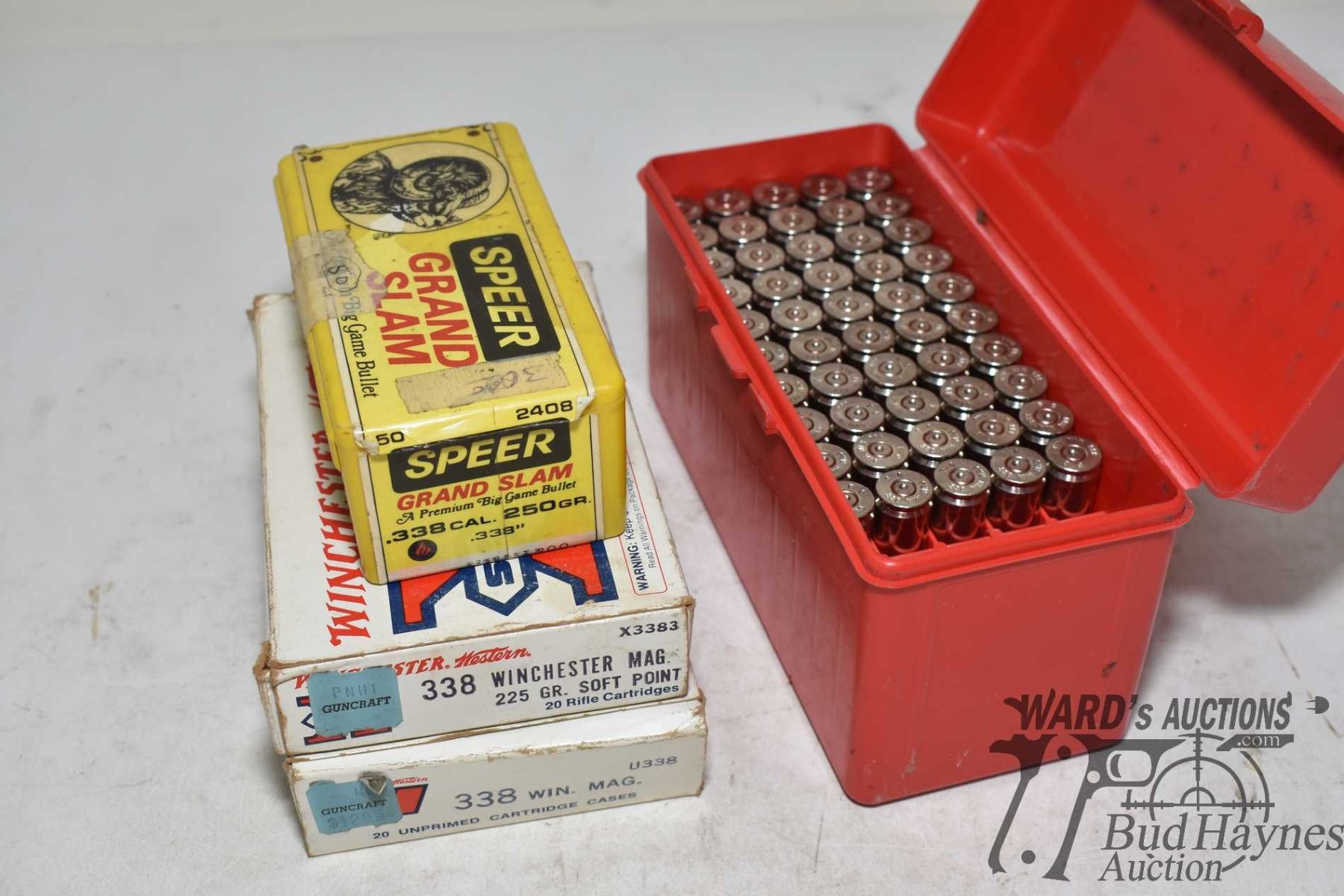 One full 50 count box Speer grand slam .338 cal 250 gr bullets, one full 20 count box Winchester .338 new brass and 67 used .338 brass