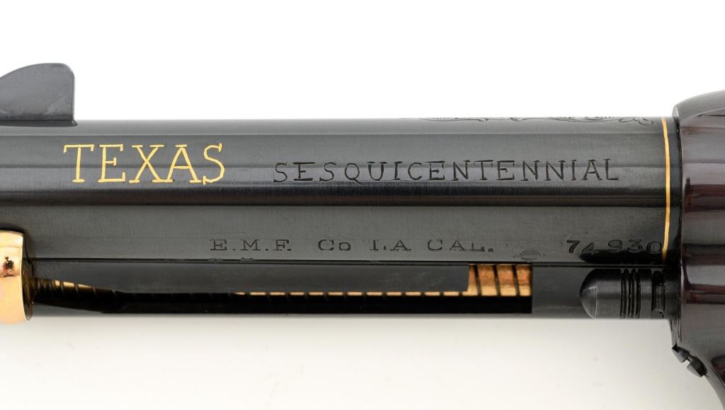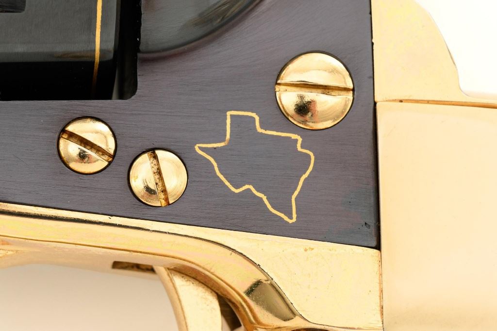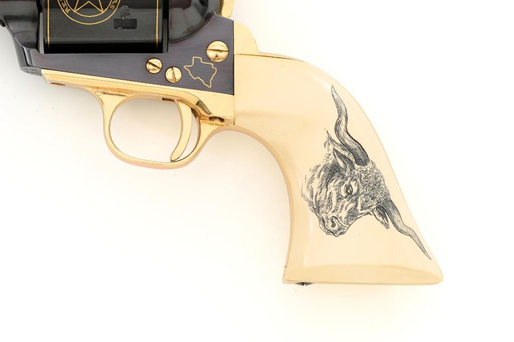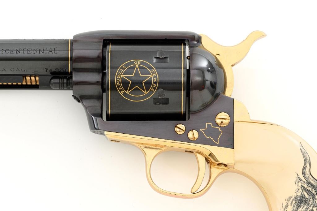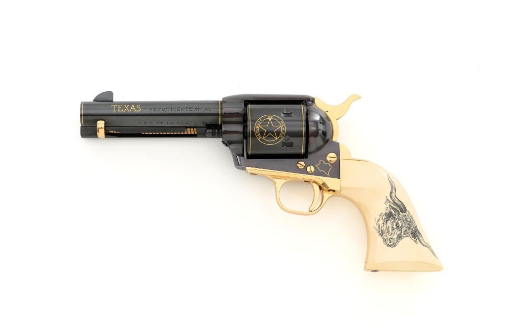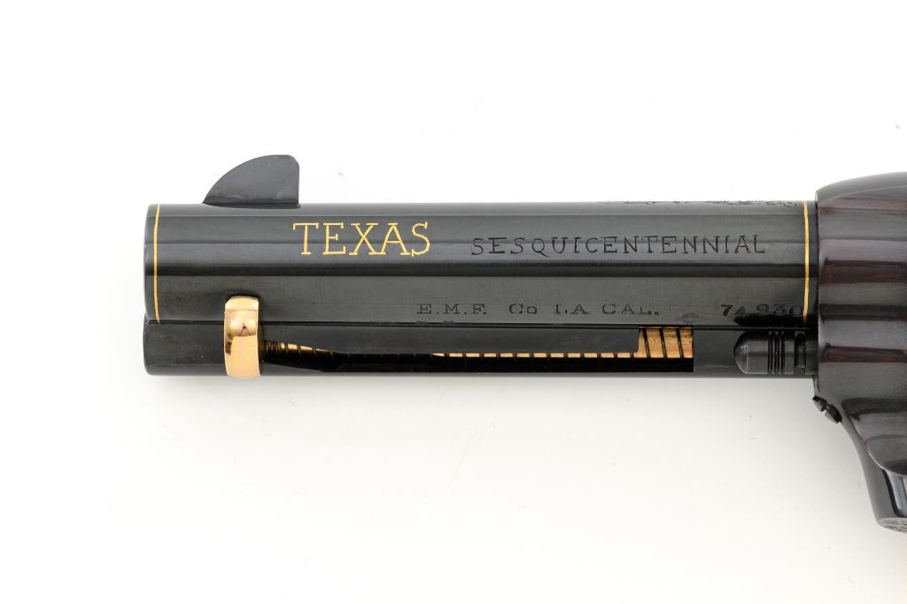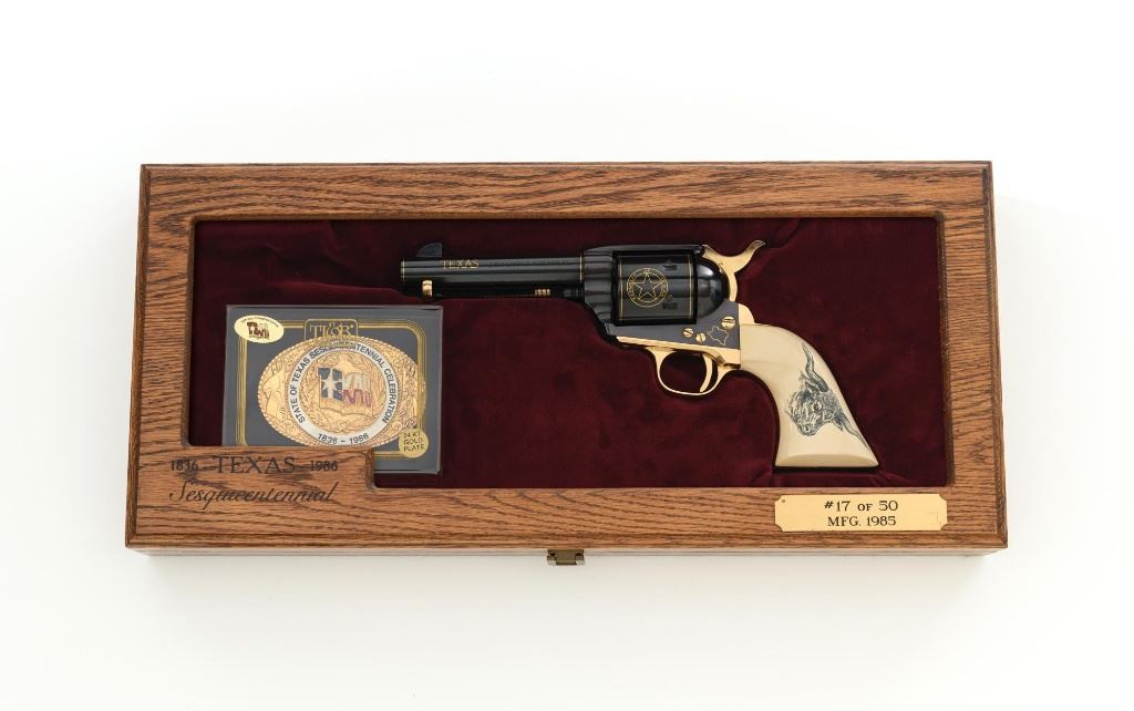 One of 50 EMF/Uberti Texas Sesquicentennial 1836-1986 Single Action Army Revolver with Belt Buckle and Display Case, #TX17, .45 Colt cal., 4.6" barrel, blue and gold plated finish, smooth etched faux ivory two-piece grips, blade front sight, fixed square-notch rear sight; gold plated hammer, trigger, straps, ejector rod, and trigger guard. Barrel with gold embossed rings at the muzzle and breech, marked "TEXAS SESQUICENTENNIAL" (Texas in gold). Cylinder displays gold rings at the front and rear with a gold star circled by "REPUBLIC OF TEXAS". Import marked on the underside of the barrel with Italian proofs, marked "MADE IN ITALY". Includes a beautiful oak and glass presentation case marked "1836 TEXAS 1986 / Sesquicentennial". Right corner features a brass plaque marked "#17 of 50 / MFG. 1985". Case is in excellent condition with only minor storage marks. Interior of the case is finished in maroon velveteen and includes a magnificent gold plated official commemorative belt buckle, marked "STATE OF TEXAS SESQUICENTENNIAL CELEBRATION 1836-1986", with enameled red, white, and blue Texas flag banner across the front, numbered to the revolver. Revolver is in excellent overall condition, retaining approx. 99%+ finish, and appearing unfired. Grips are in excellent condition, with a machine etched longhorn steer on the left panel. Action is crisp. Bore is mirror bright with excellent rifling. Est.: $1,000-$1,500. (Modern/PPT) (Michael Strietbeck Collection)