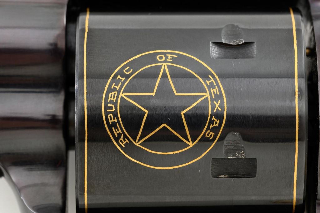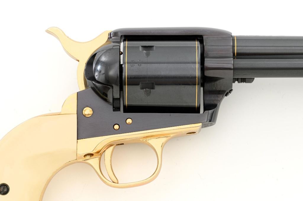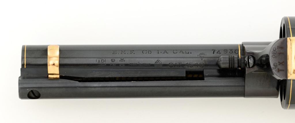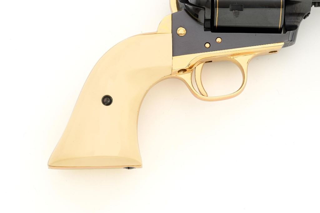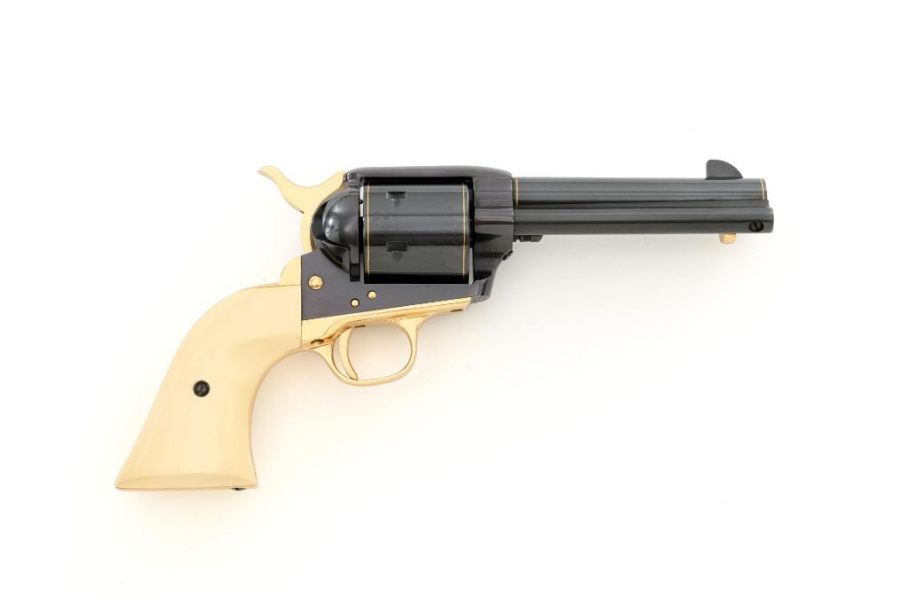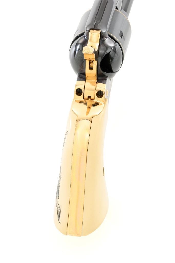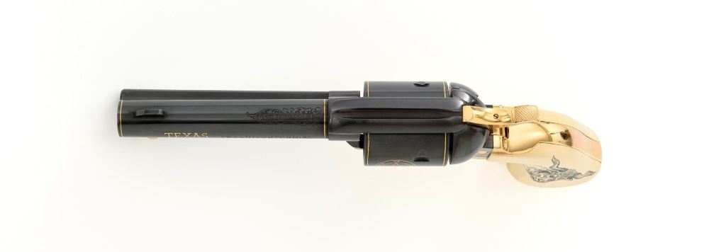 One of 50 EMF/Uberti Texas Sesquicentennial 1836-1986 Single Action Army Revolver with Belt Buckle and Display Case, #TX17, .45 Colt cal., 4.6" barrel, blue and gold plated finish, smooth etched faux ivory two-piece grips, blade front sight, fixed square-notch rear sight; gold plated hammer, trigger, straps, ejector rod, and trigger guard. Barrel with gold embossed rings at the muzzle and breech, marked "TEXAS SESQUICENTENNIAL" (Texas in gold). Cylinder displays gold rings at the front and rear with a gold star circled by "REPUBLIC OF TEXAS". Import marked on the underside of the barrel with Italian proofs, marked "MADE IN ITALY". Includes a beautiful oak and glass presentation case marked "1836 TEXAS 1986 / Sesquicentennial". Right corner features a brass plaque marked "#17 of 50 / MFG. 1985". Case is in excellent condition with only minor storage marks. Interior of the case is finished in maroon velveteen and includes a magnificent gold plated official commemorative belt buckle, marked "STATE OF TEXAS SESQUICENTENNIAL CELEBRATION 1836-1986", with enameled red, white, and blue Texas flag banner across the front, numbered to the revolver. Revolver is in excellent overall condition, retaining approx. 99%+ finish, and appearing unfired. Grips are in excellent condition, with a machine etched longhorn steer on the left panel. Action is crisp. Bore is mirror bright with excellent rifling. Est.: $1,000-$1,500. (Modern/PPT) (Michael Strietbeck Collection)