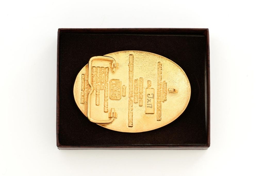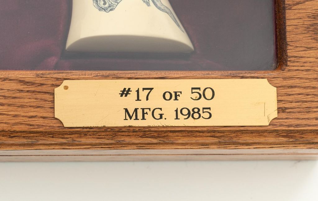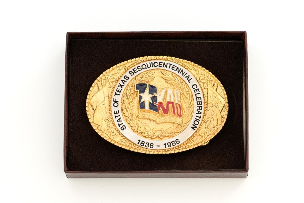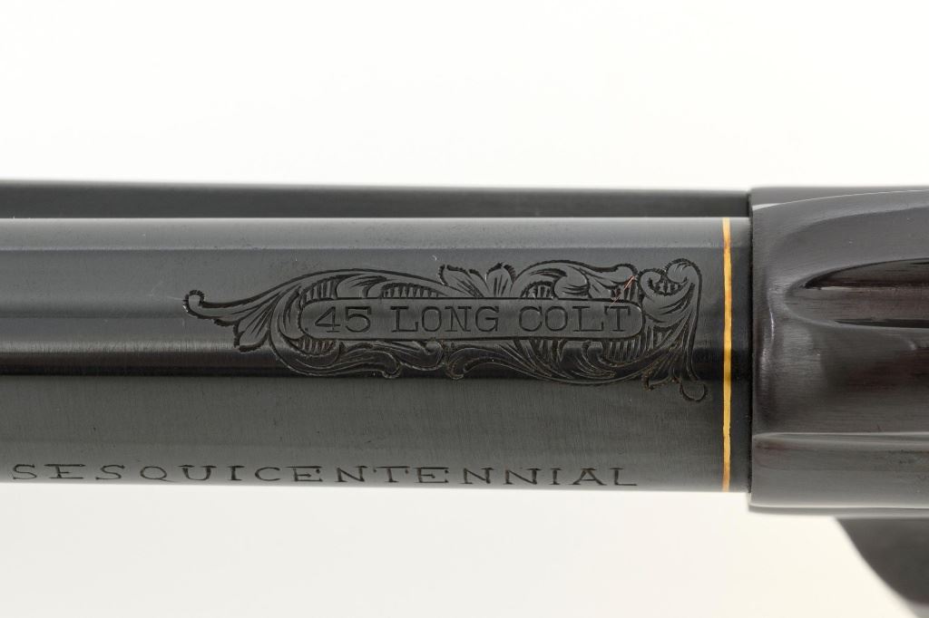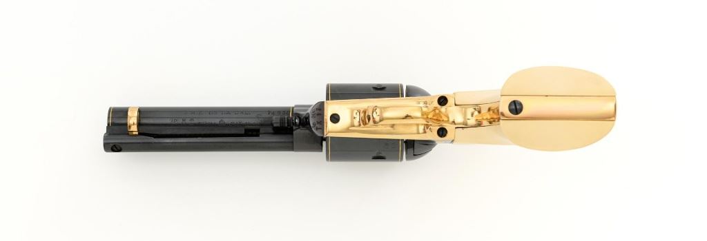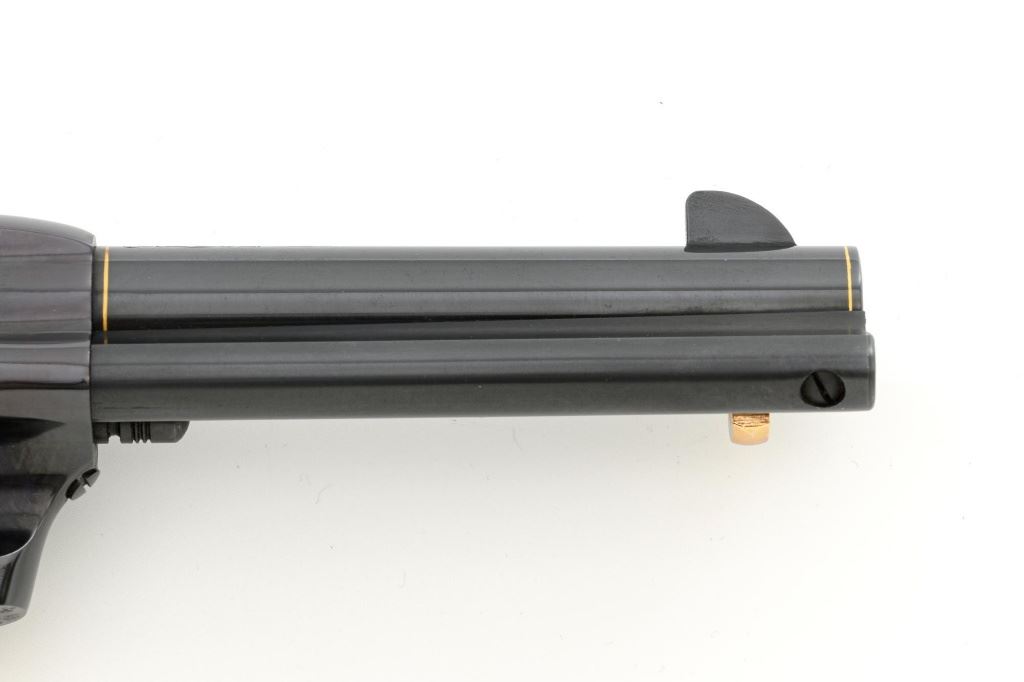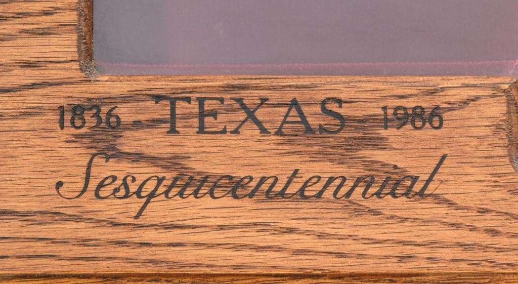 One of 50 EMF/Uberti Texas Sesquicentennial 1836-1986 Single Action Army Revolver with Belt Buckle and Display Case, #TX17, .45 Colt cal., 4.6" barrel, blue and gold plated finish, smooth etched faux ivory two-piece grips, blade front sight, fixed square-notch rear sight; gold plated hammer, trigger, straps, ejector rod, and trigger guard. Barrel with gold embossed rings at the muzzle and breech, marked "TEXAS SESQUICENTENNIAL" (Texas in gold). Cylinder displays gold rings at the front and rear with a gold star circled by "REPUBLIC OF TEXAS". Import marked on the underside of the barrel with Italian proofs, marked "MADE IN ITALY". Includes a beautiful oak and glass presentation case marked "1836 TEXAS 1986 / Sesquicentennial". Right corner features a brass plaque marked "#17 of 50 / MFG. 1985". Case is in excellent condition with only minor storage marks. Interior of the case is finished in maroon velveteen and includes a magnificent gold plated official commemorative belt buckle, marked "STATE OF TEXAS SESQUICENTENNIAL CELEBRATION 1836-1986", with enameled red, white, and blue Texas flag banner across the front, numbered to the revolver. Revolver is in excellent overall condition, retaining approx. 99%+ finish, and appearing unfired. Grips are in excellent condition, with a machine etched longhorn steer on the left panel. Action is crisp. Bore is mirror bright with excellent rifling. Est.: $1,000-$1,500. (Modern/PPT) (Michael Strietbeck Collection)