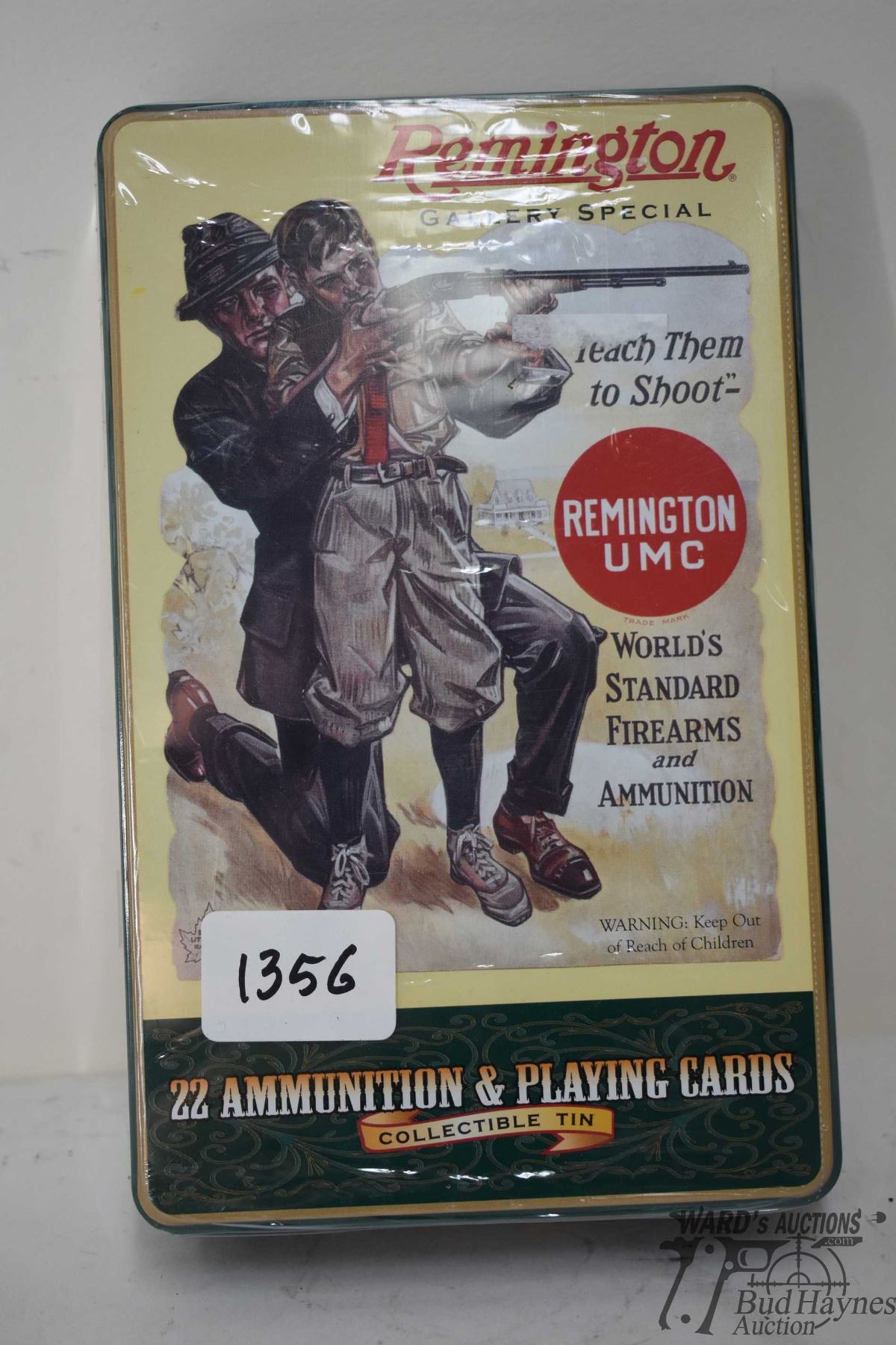 One sealed collectors box Remington ammo w/ 400 count .22 LR gold colored bullets and a deck of playing cards