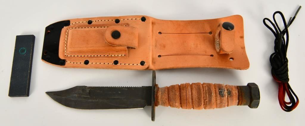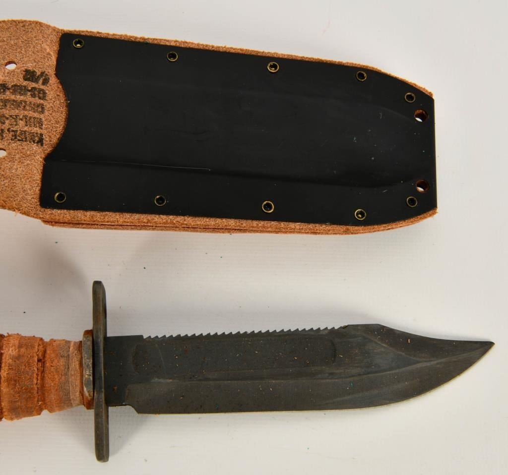 Ontario Knife Company 499 Air Force Survival Knife 5" Sawback Blade with False Top Edge and Blood Grooves, Natural Leather Handle and Sheath - 1095 carbon steel blade - 0. 1875 thickness 9. 5" overall length - 5" blade length Sawteeth on spine U.S. Army- and Air Force-issue survival knife 5-inch Parkerized blade with serrated top edge Comfortable leather handle and sheath Includes sharpening stone with pouch GSA-compliant