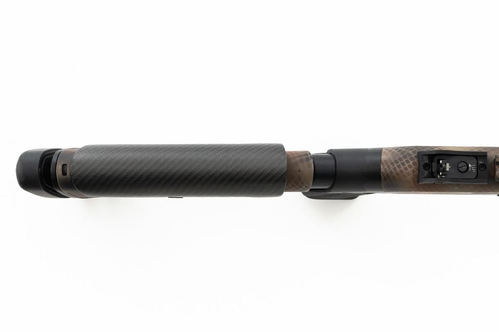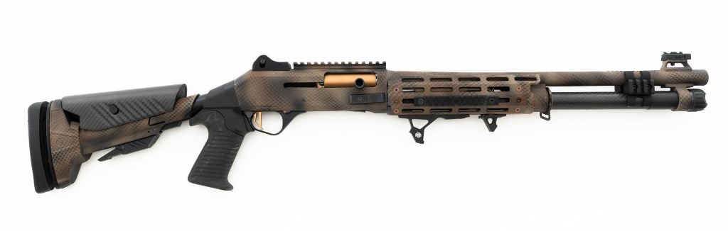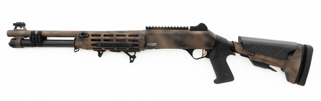 Orhtos Arms Raider S4 Semi-Automatic Shotgun, #663-H24YT-3973, 12 ga., 3" chamber, 18.5" ported round barrel, aluminum receiver, "Rattle Can Cerakote" finish, bronze color bolt and trigger, carbon fiber adjustable comb stock with "Shock Force" recoil system, 13.25 LOP, 8" hand guard with hand stops, pistol grip, ghost ring rear sight, working LED fiber optic front sight, 5.5" receiver mounted picatinny rail, QD sling mounts, oversized controls, 7-round extended magazine tube for 2.75" shells and 6-round for 3" shells, Benelli style Cyl. choke. Made in Turkey. Condition is excellent with only minor handling marks. Action operates smoothly. Bore is bright. Includes factory owners manual. Stock has been permanently modified to the fixed position and will not adjust. Est.: $800-$1,000. (Modern)