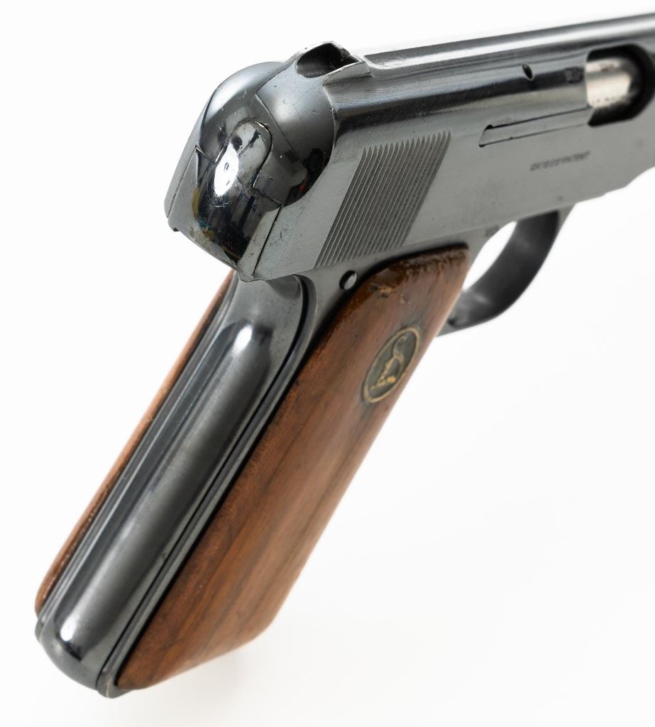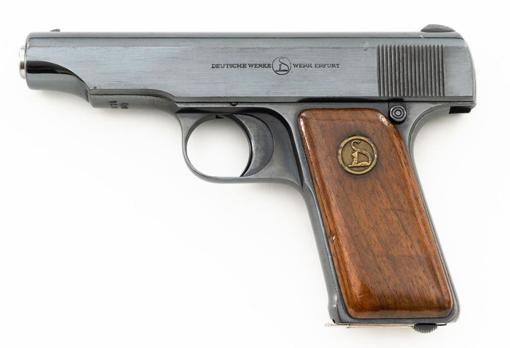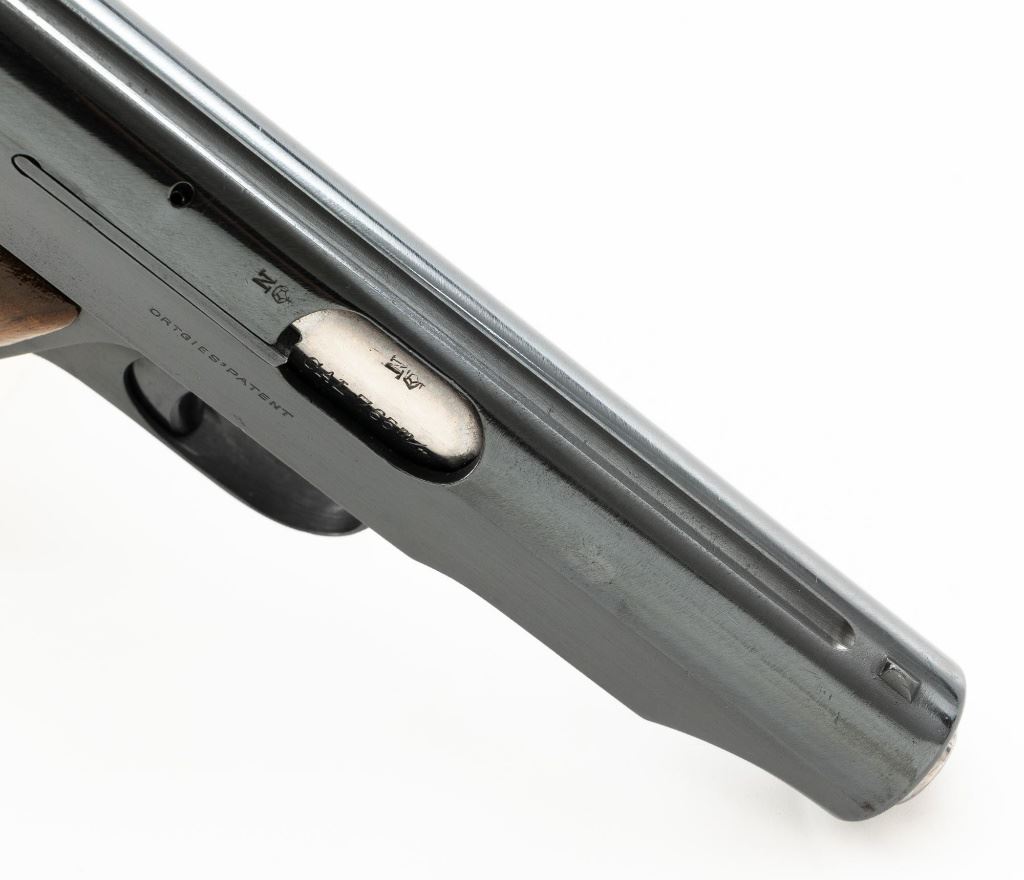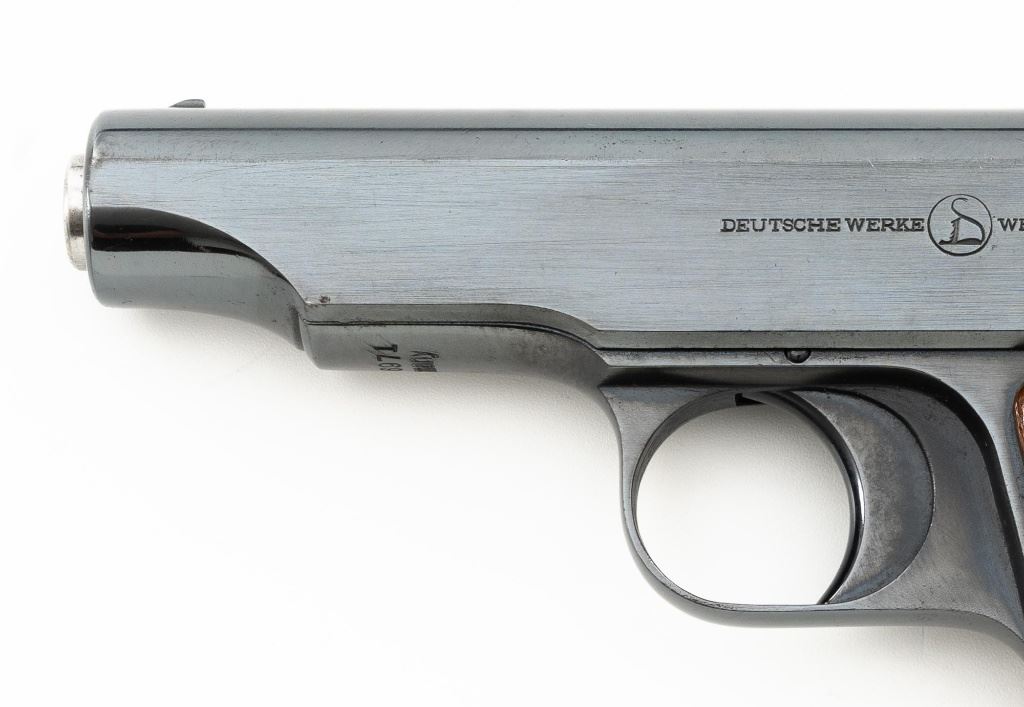 Ortgies Deutsche Werke Semi-Automatic Pistol, #116971, .32 ACP cal., 3.5" barrel, blued finish, smooth hardwood grips with brass Deutsche Werke logos, blade front sight, and fixed rear sight with "V"-notched groove. Includes one bright magazine, marked "7,65m/m" with stylized "HO" logos on each side. Pistol is marked "DEUTSCHE WERKE(cat logo)WERK ERFURT" on left side of the slide and "ORTGIESPATENT" on the right side. Barrel at the ejection port is marked "CAL 7,65m/m". There are "(crown)N" stamps on the frame, slide, and barrel. Marked "GERMANY" on bottom of the frame. Condition overall is fine as refinished, retaining approx. 98% reblued finish, which was applied over intermittent spots of light pitting. Grips are very good, with varnish applied over light handling marks. Action operates smoothly. Bore rates good overall, with a dark area that may clean better, and good rifling. Est.: $200-$300. (C&R/PPT)